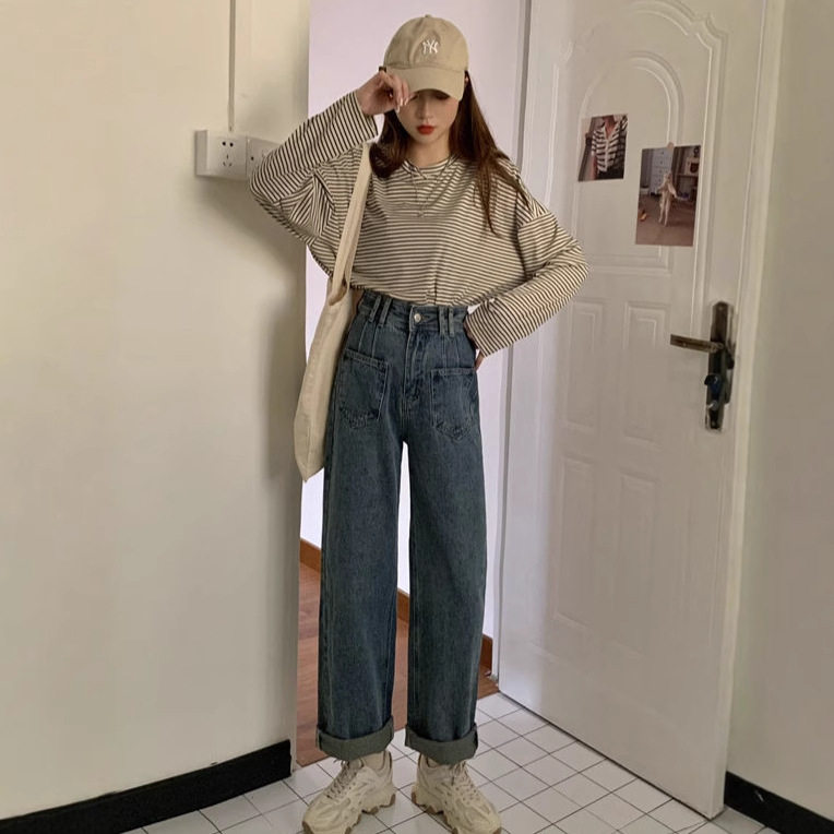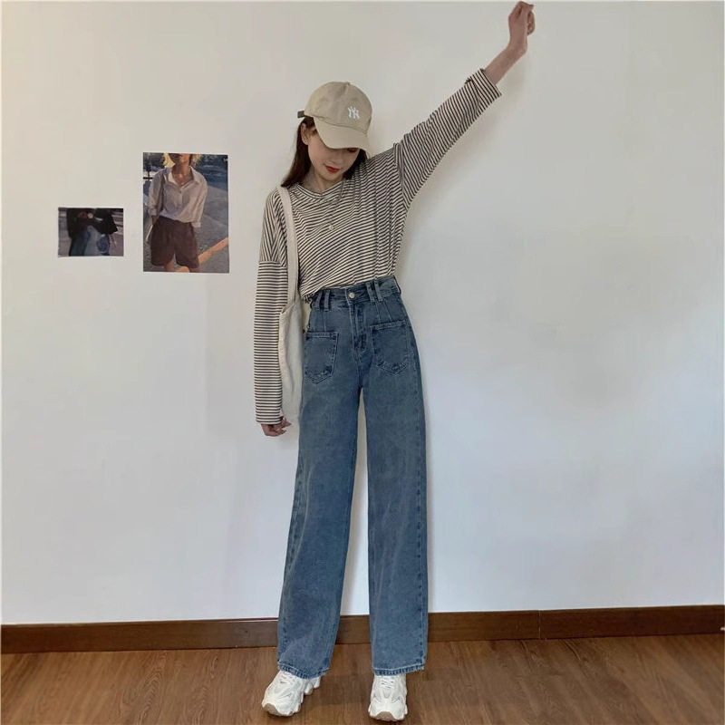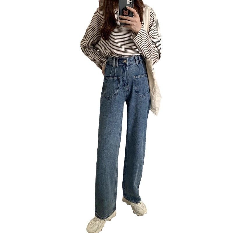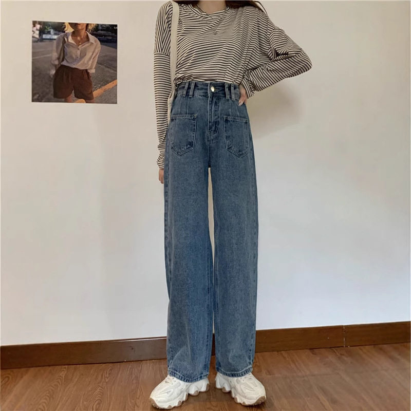 大码高街阔腿牛仔裤女小个子学生韩版百搭显高宽松显瘦直筒长裤