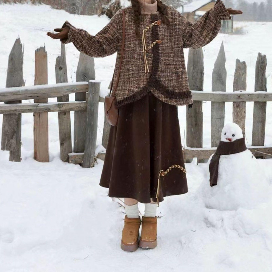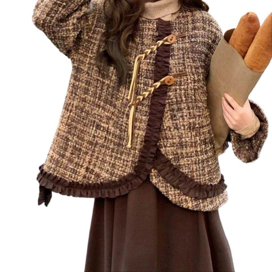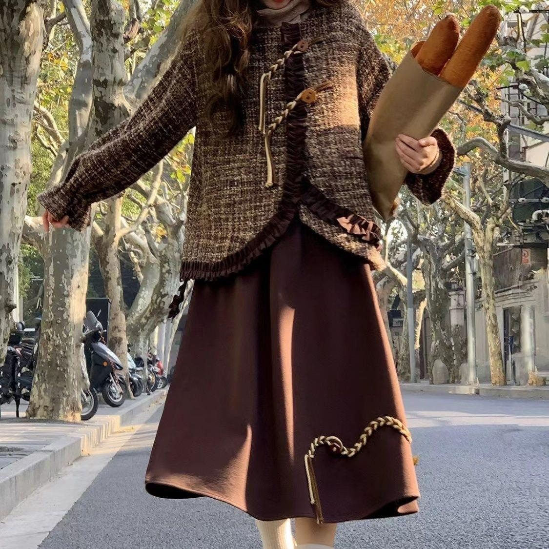 【两件套】微胖大码女装棕色小香风木耳边外套咖色半裙胖显瘦