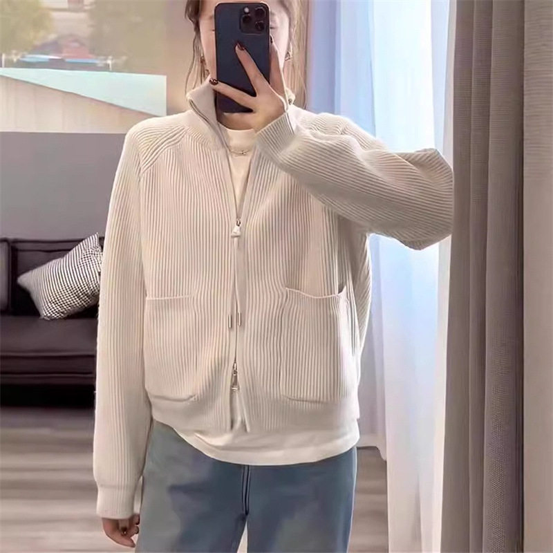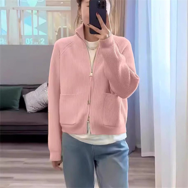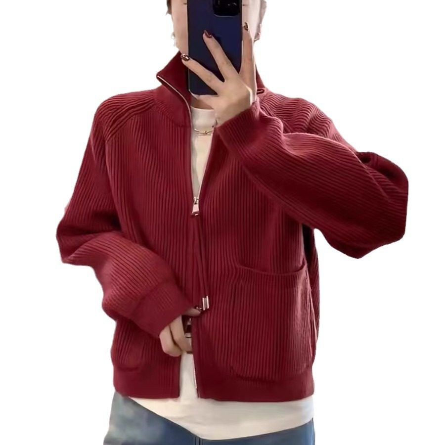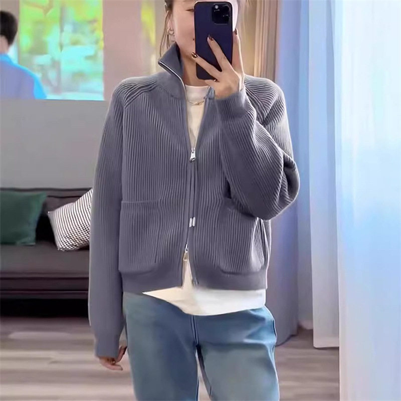纯色立领双拉链针织开衫秋冬季新款宽松百搭慵懒风休闲毛衣女外套