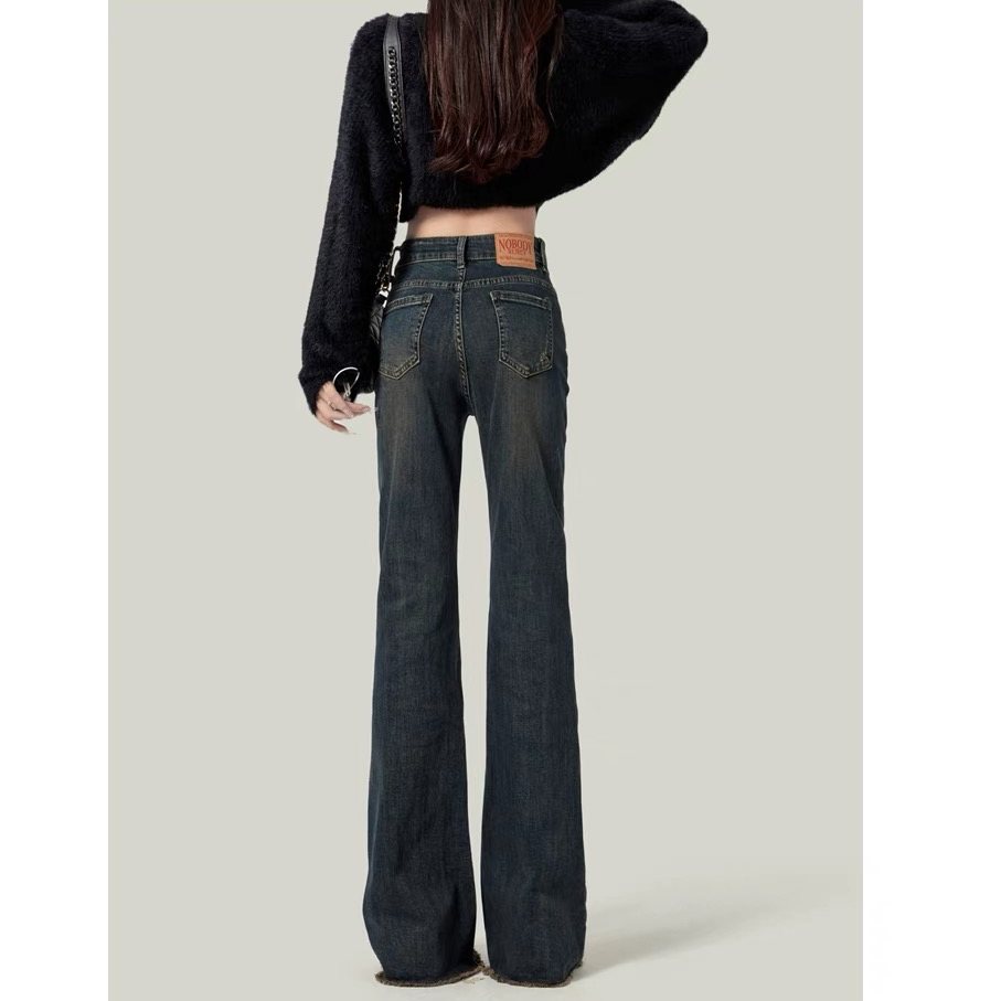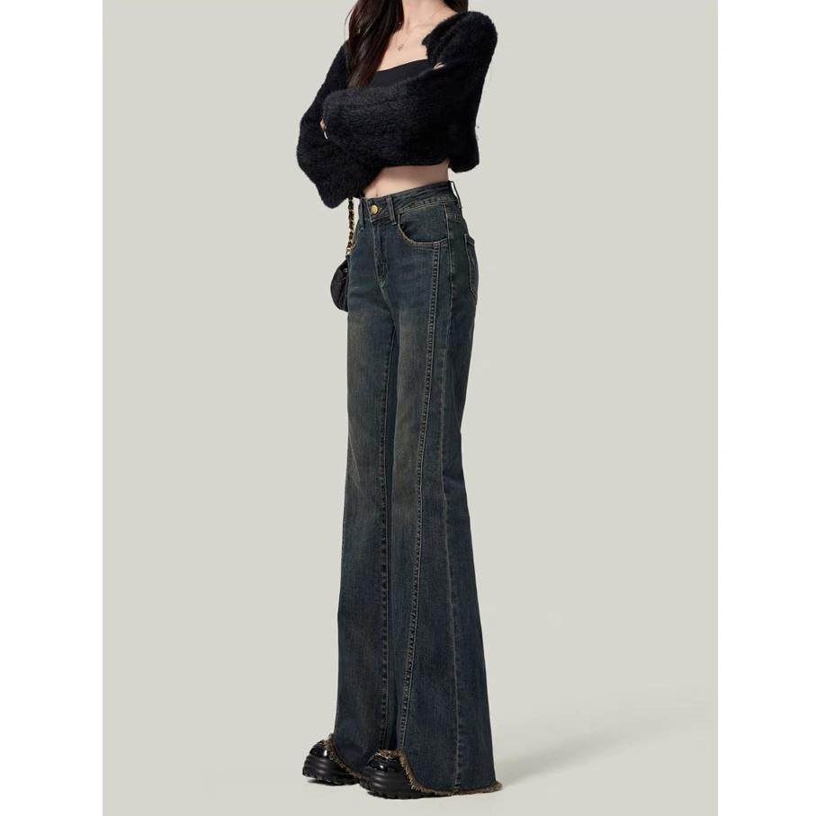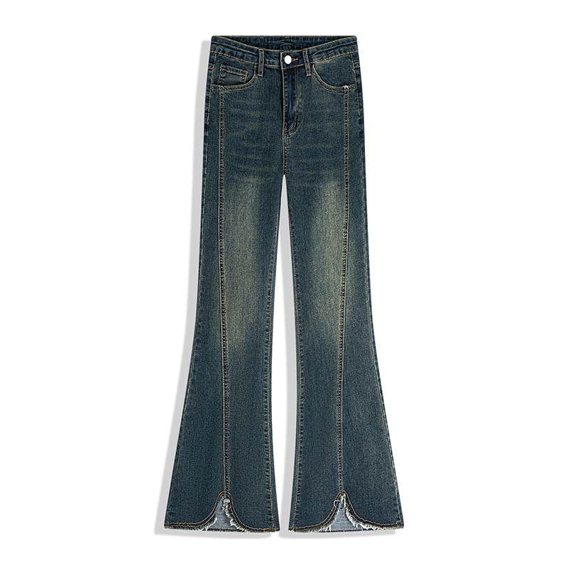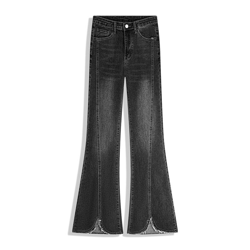 2025春季水泥灰微喇开叉牛仔裤女大码胖MM200斤2025高腰喇叭长裤