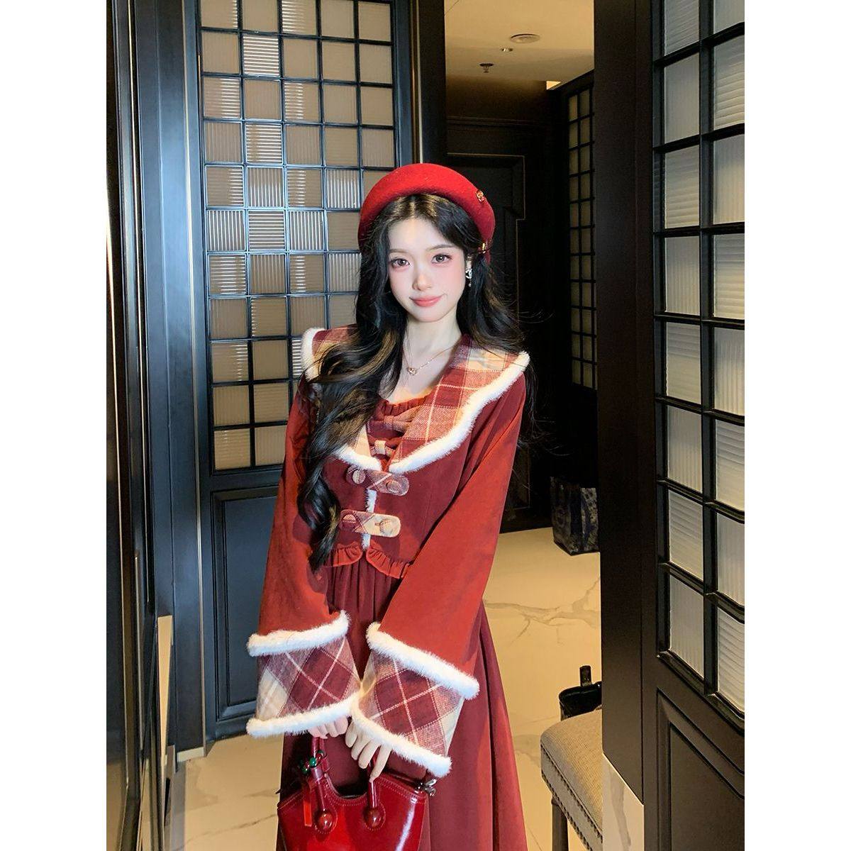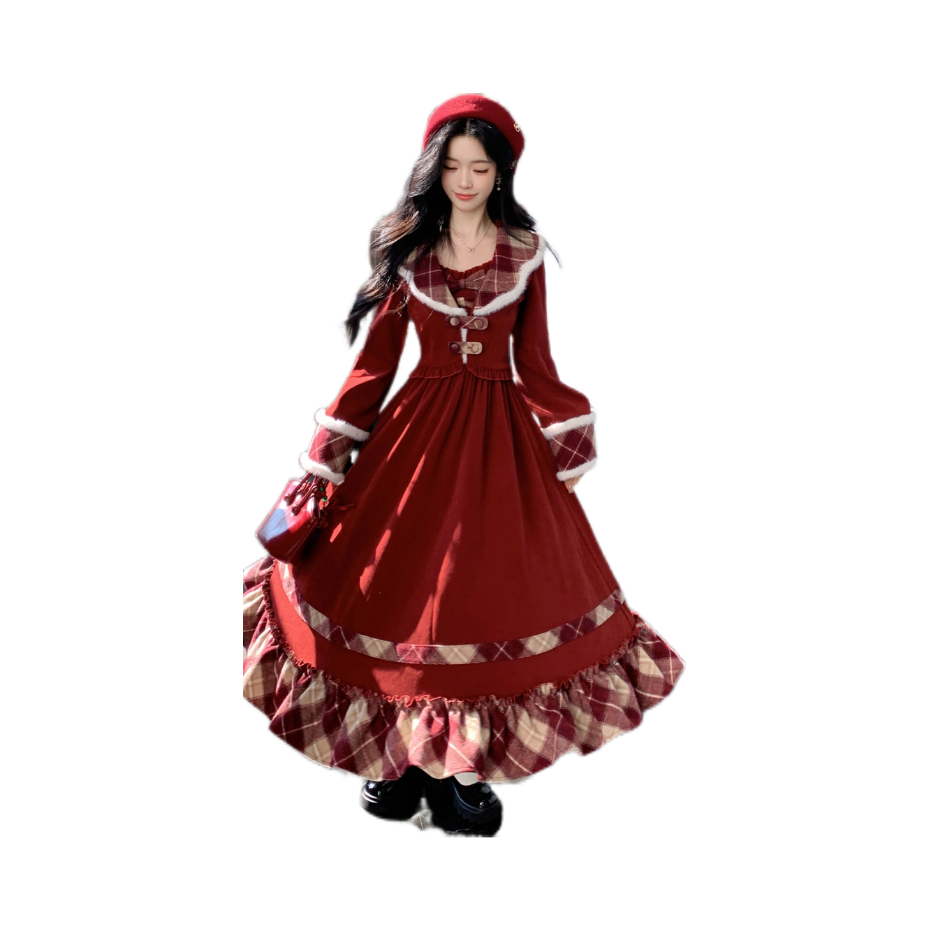 首页> 女装> 圣诞颂歌酒红色格纹拼接两件套冬日新款减龄气质大摆裙长款套装女