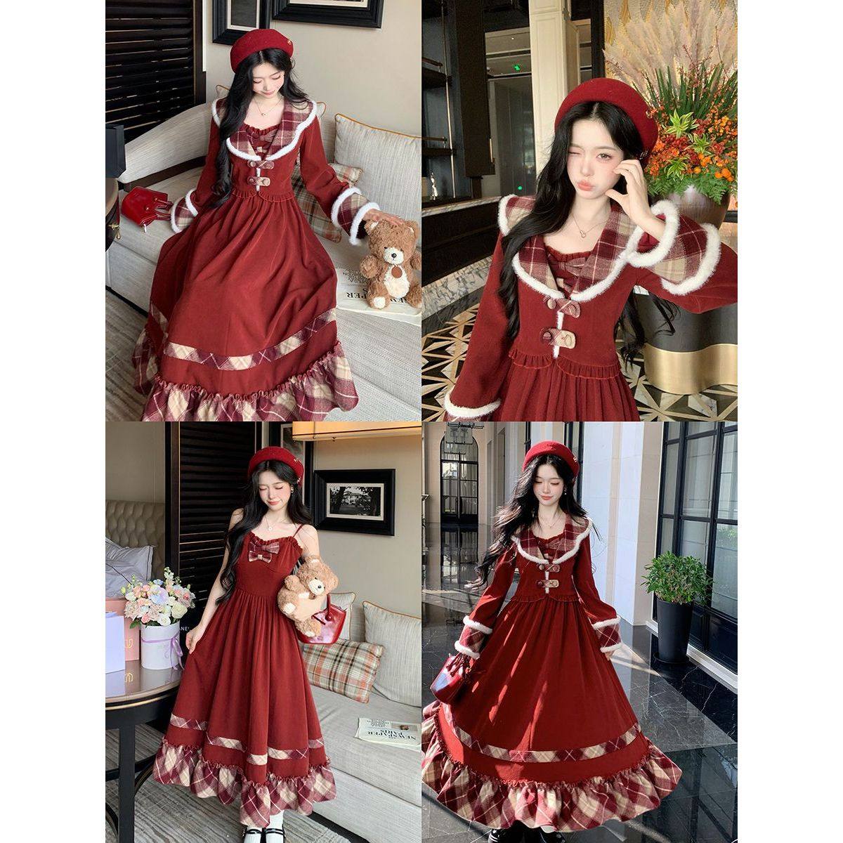 圣诞颂歌酒红色格纹拼接两件套冬日新款减龄气质大摆裙长款套装女