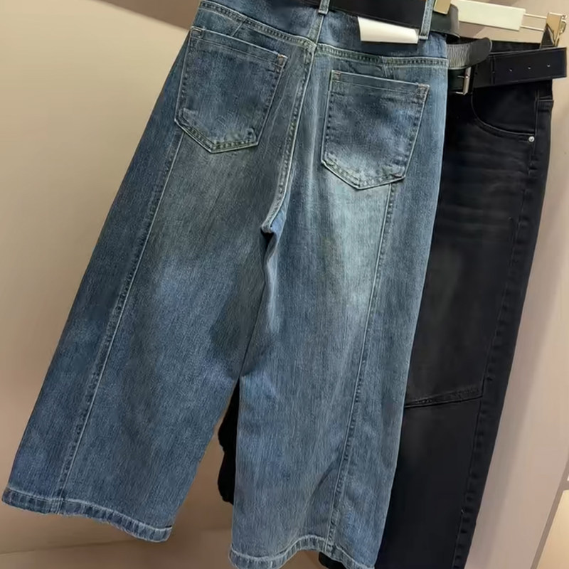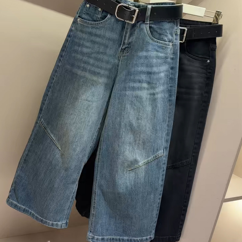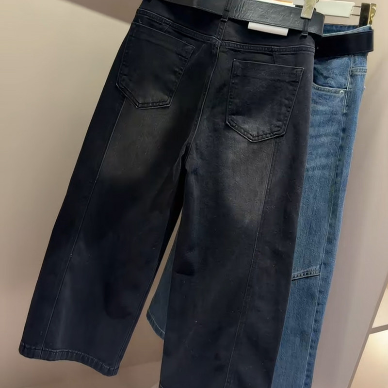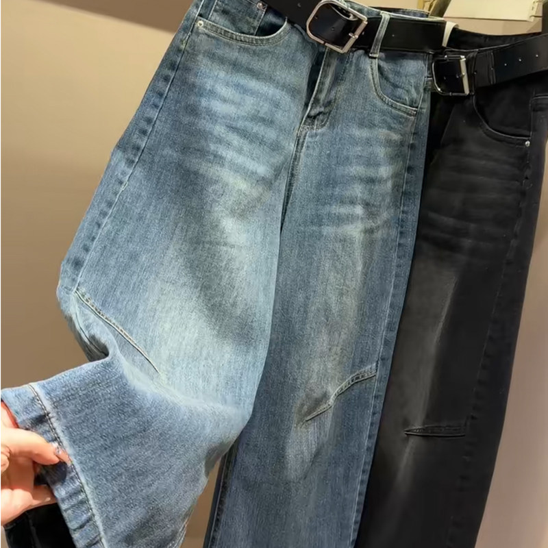 韩版早春新款阔腿水洗牛仔裤女百搭宽松显瘦高腰小个子净版九分裤