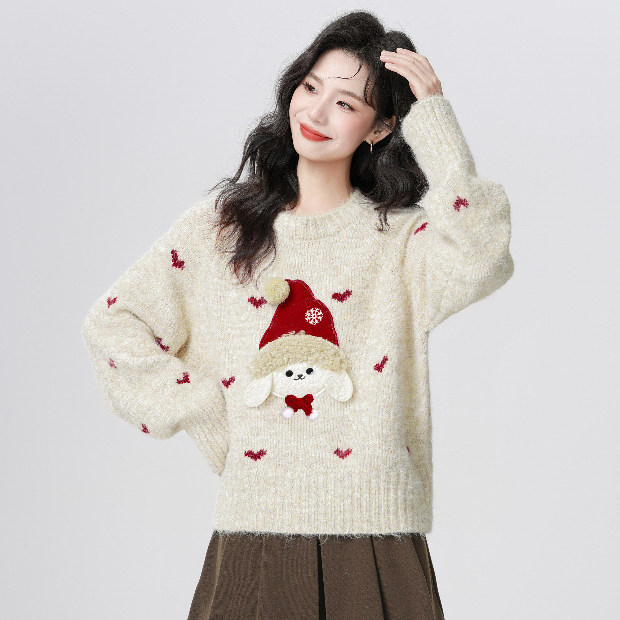 燕麦色卡通小狗圆领套头毛衣女2025秋冬季新款加厚保暖针织衫上衣