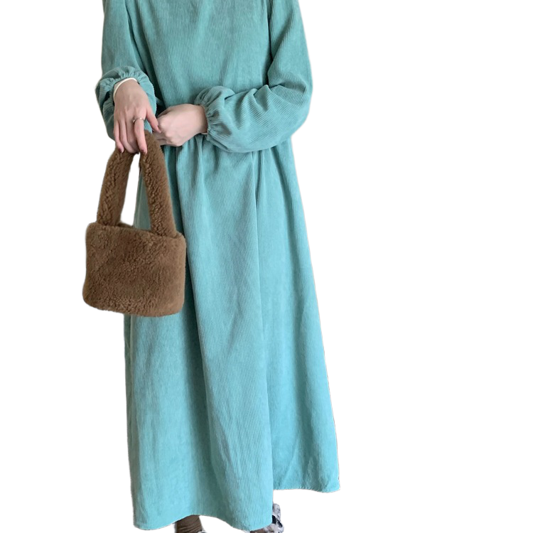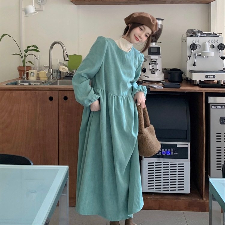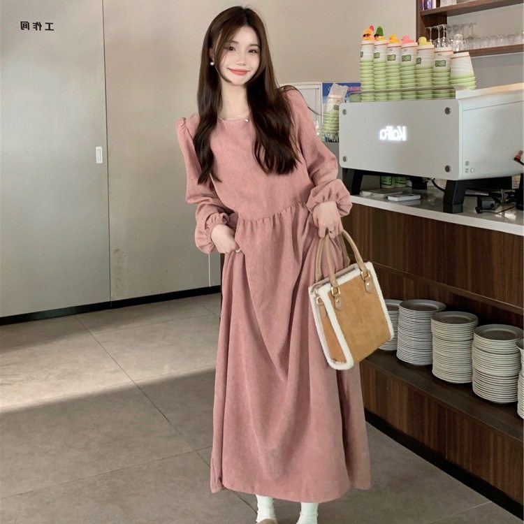 秋装新款灯芯绒 连衣裙女洋气收腰灯笼袖淑女A字裙子宽松长裙