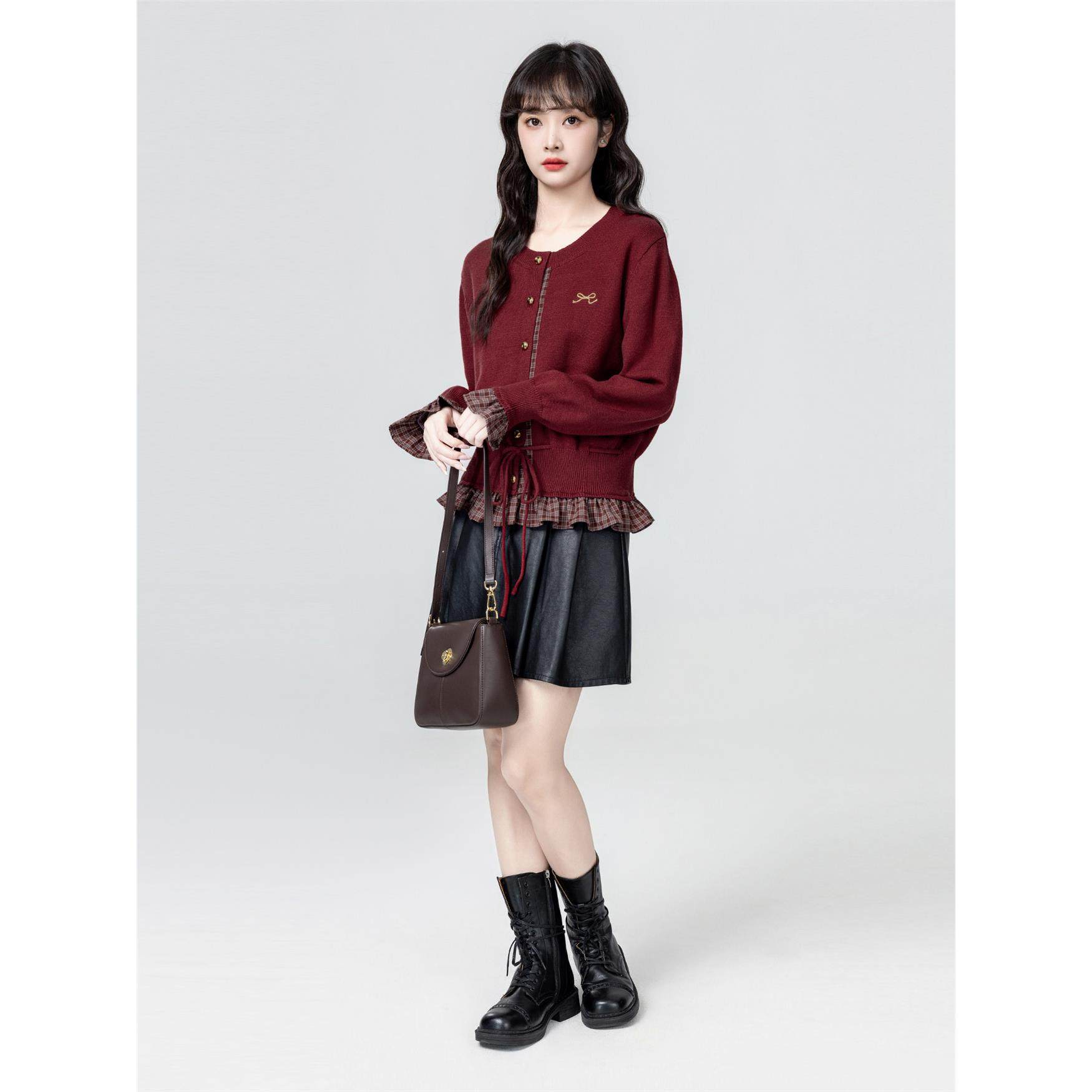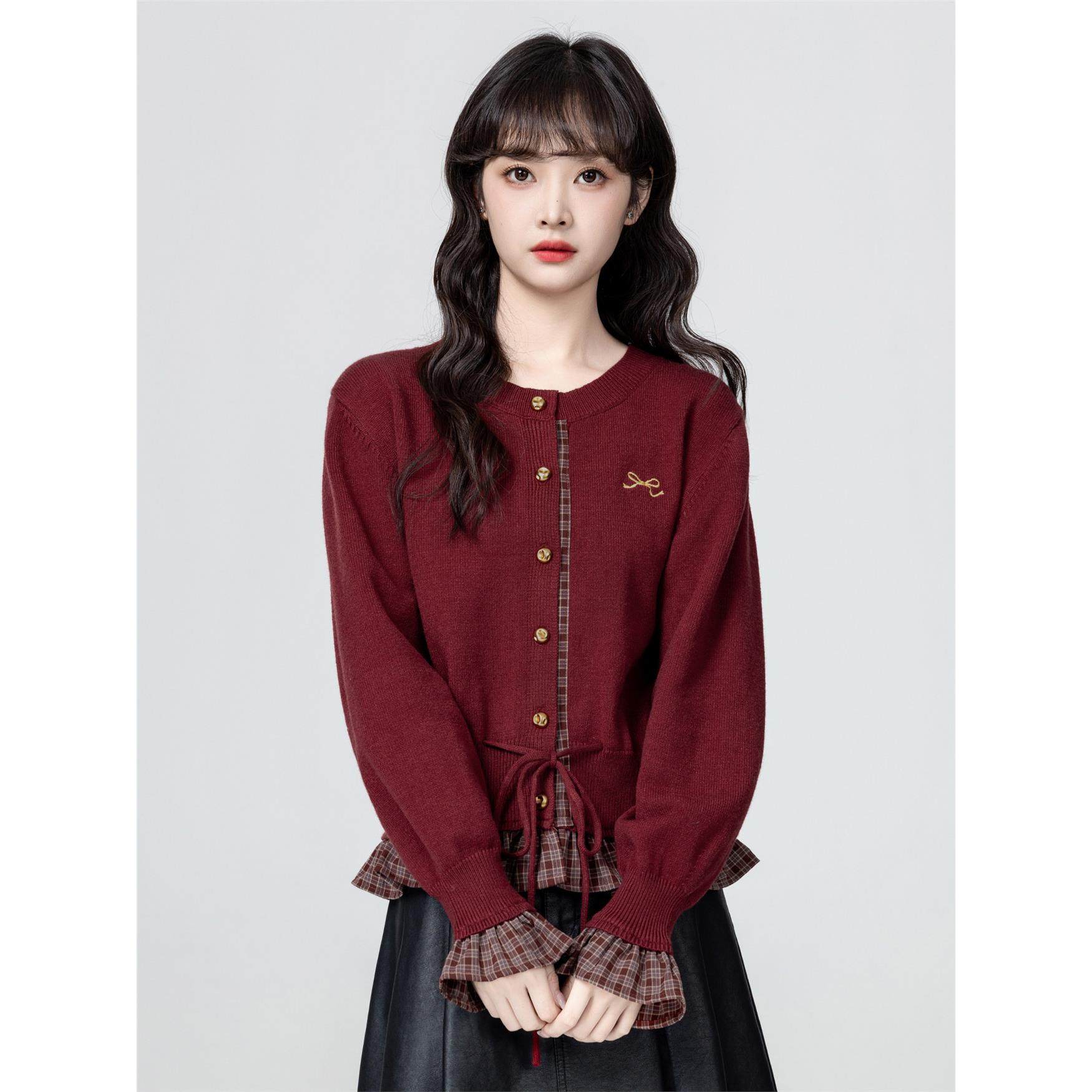 法式红色假两件针织开衫女春秋2025秋季新款系带收腰毛衣外套上衣