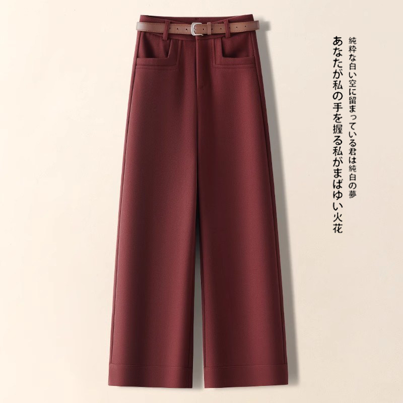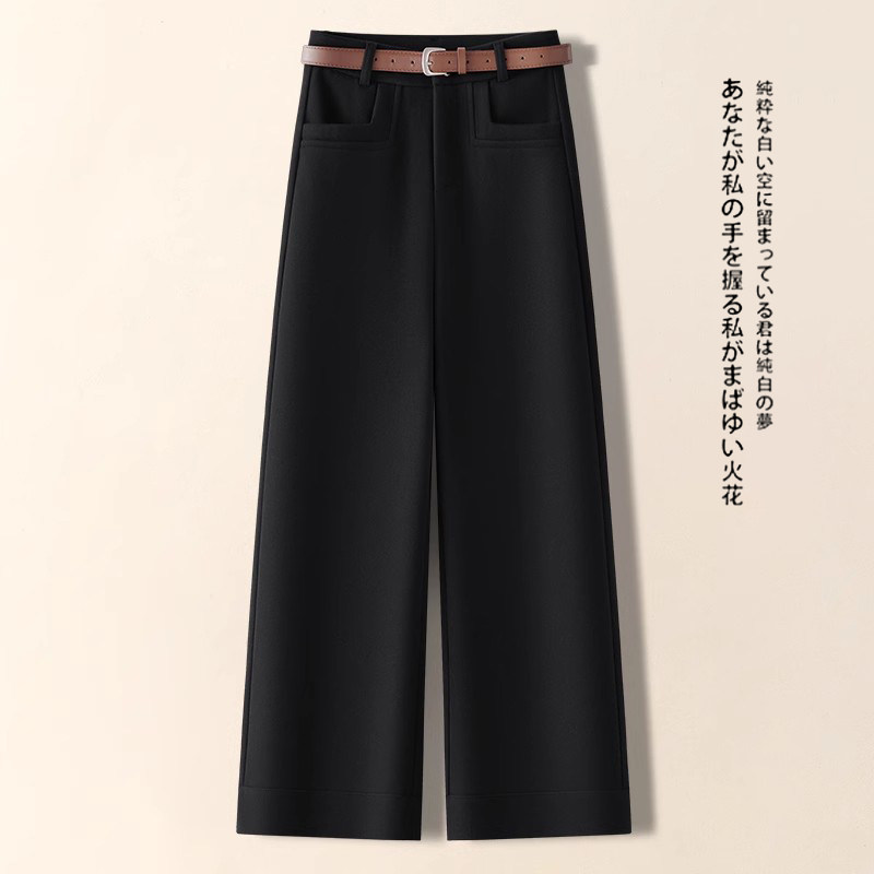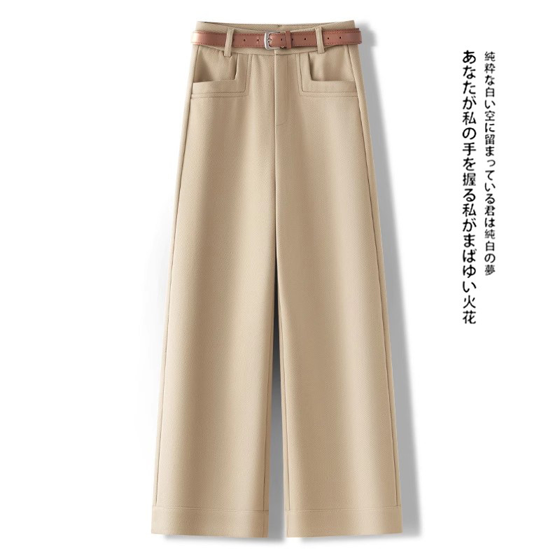 啄木鸟杏色毛呢阔腿裤女秋冬高腰宽松直筒裤加绒加厚窄版九分裤