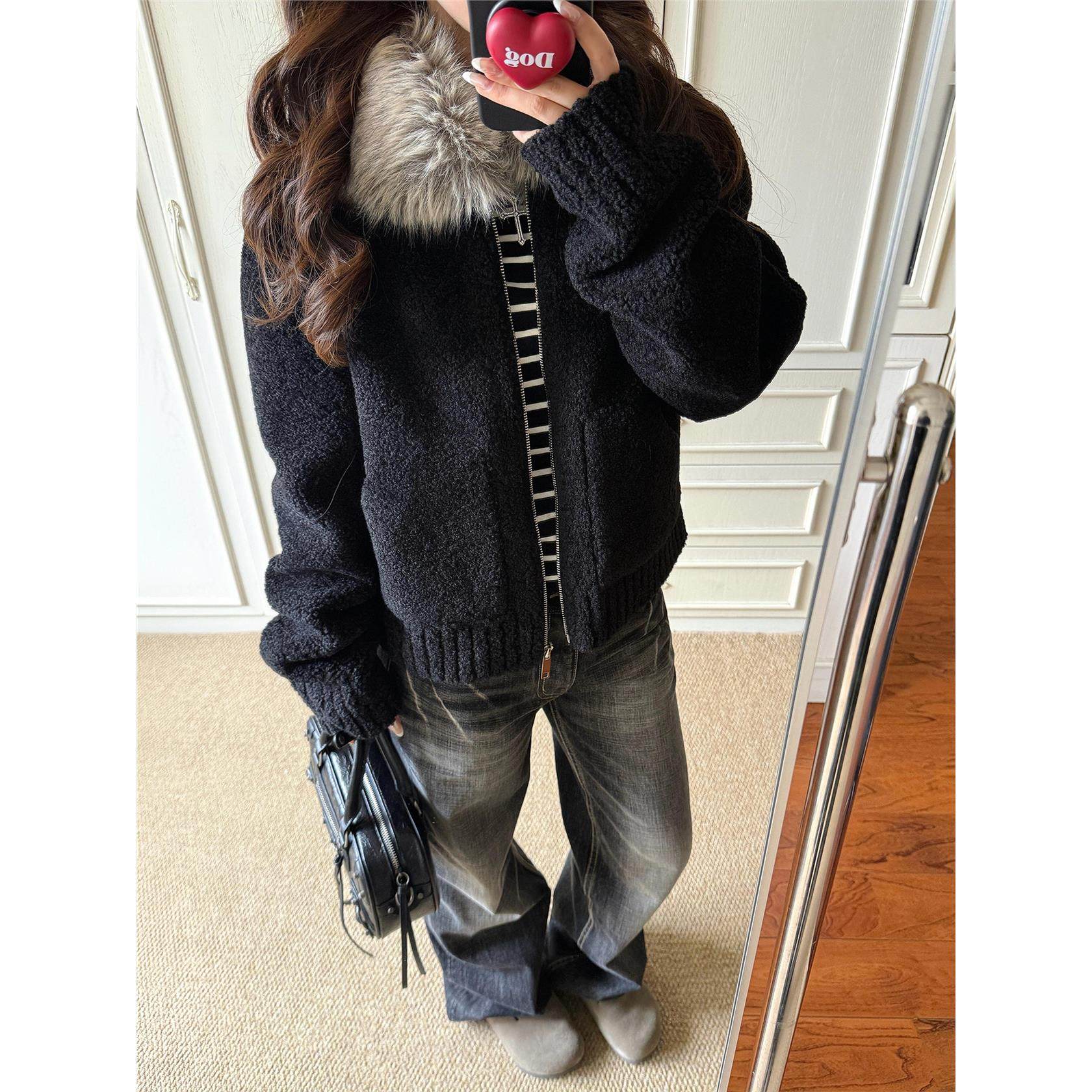 定染毛领小颗粒羊羔毛外套女秋冬季新款皮毛一体加厚黑色环保皮草