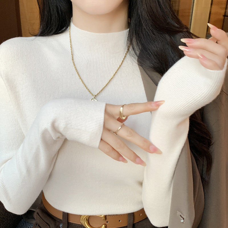 无缝一体羊毛打底衫女秋冬修身薄款半高领针织衫上衣中领内搭毛衣