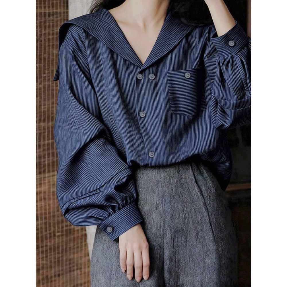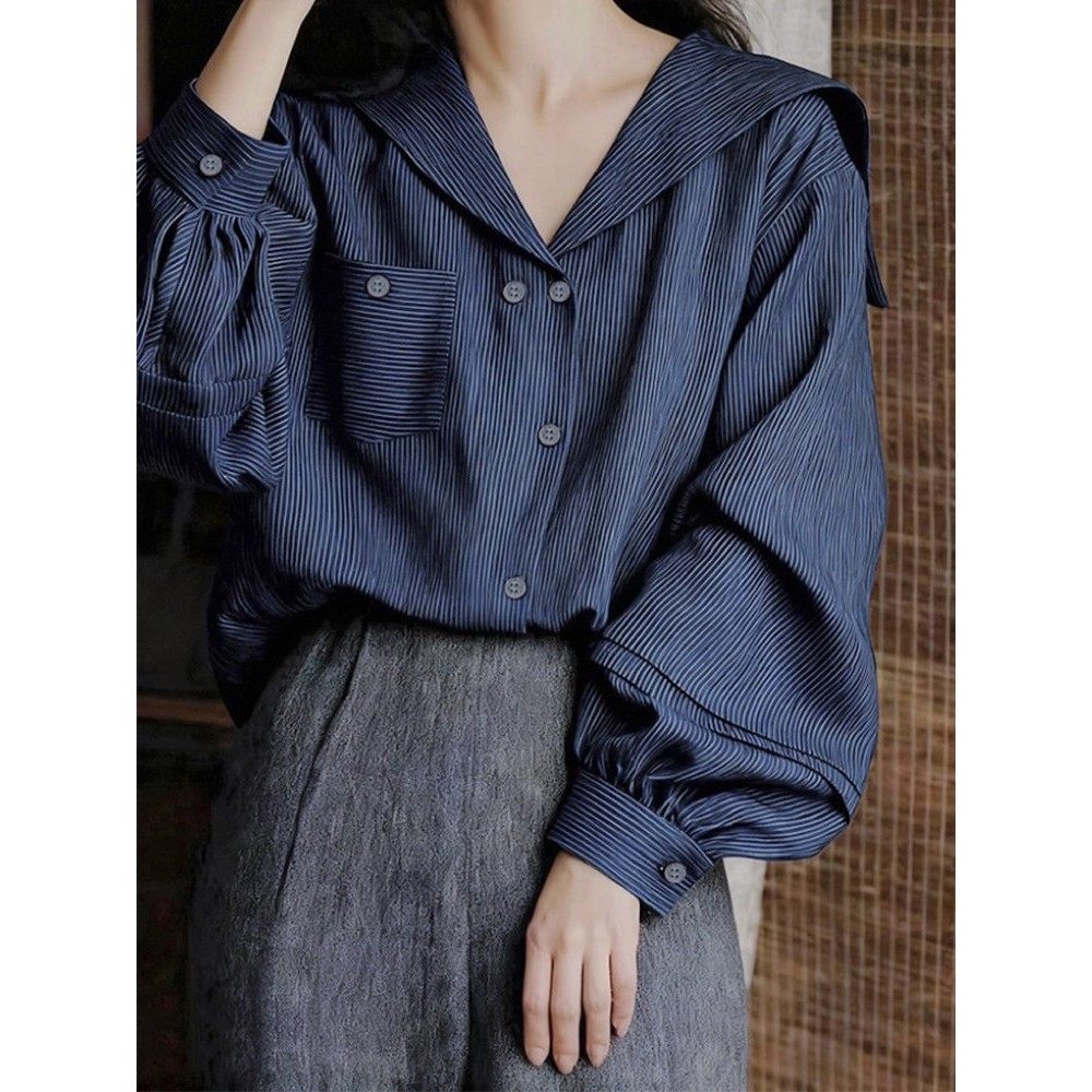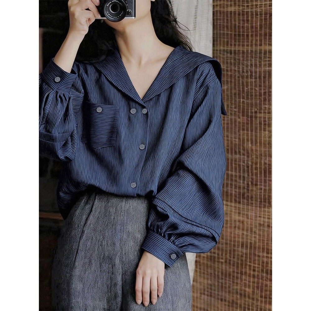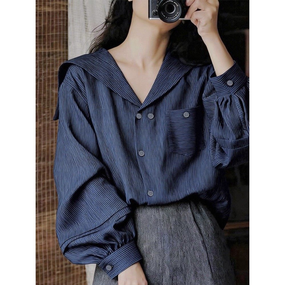 航海系藏蓝色条纹海军领长袖上衣设计感独特漂亮法式小衬衫2025秋