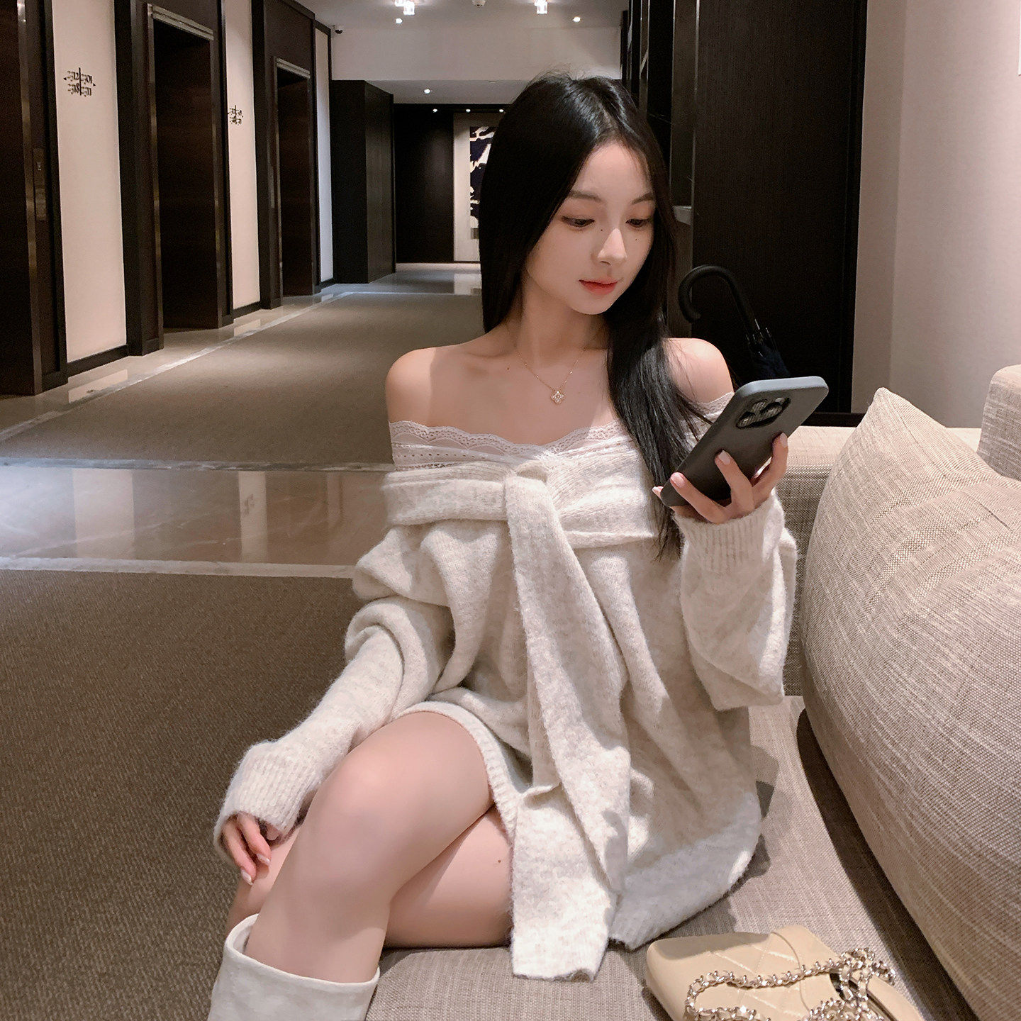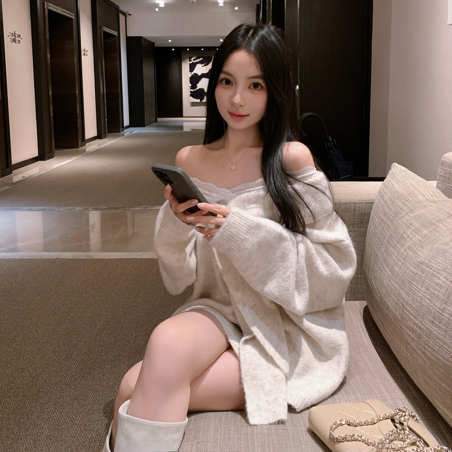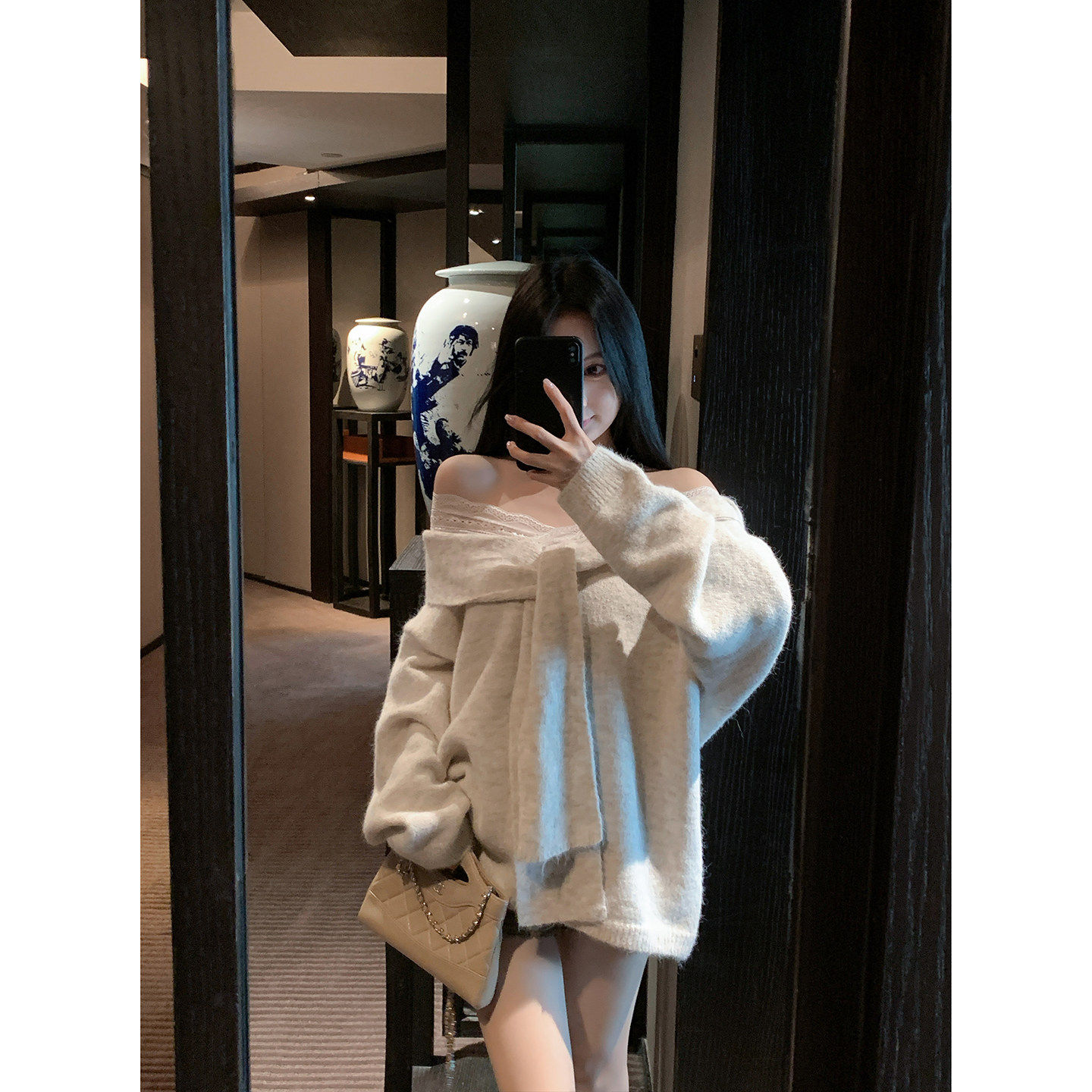 周耶耶 一字肩毛衣女慵懒纯欲风露肩上衣2025冬季新款冬季穿搭