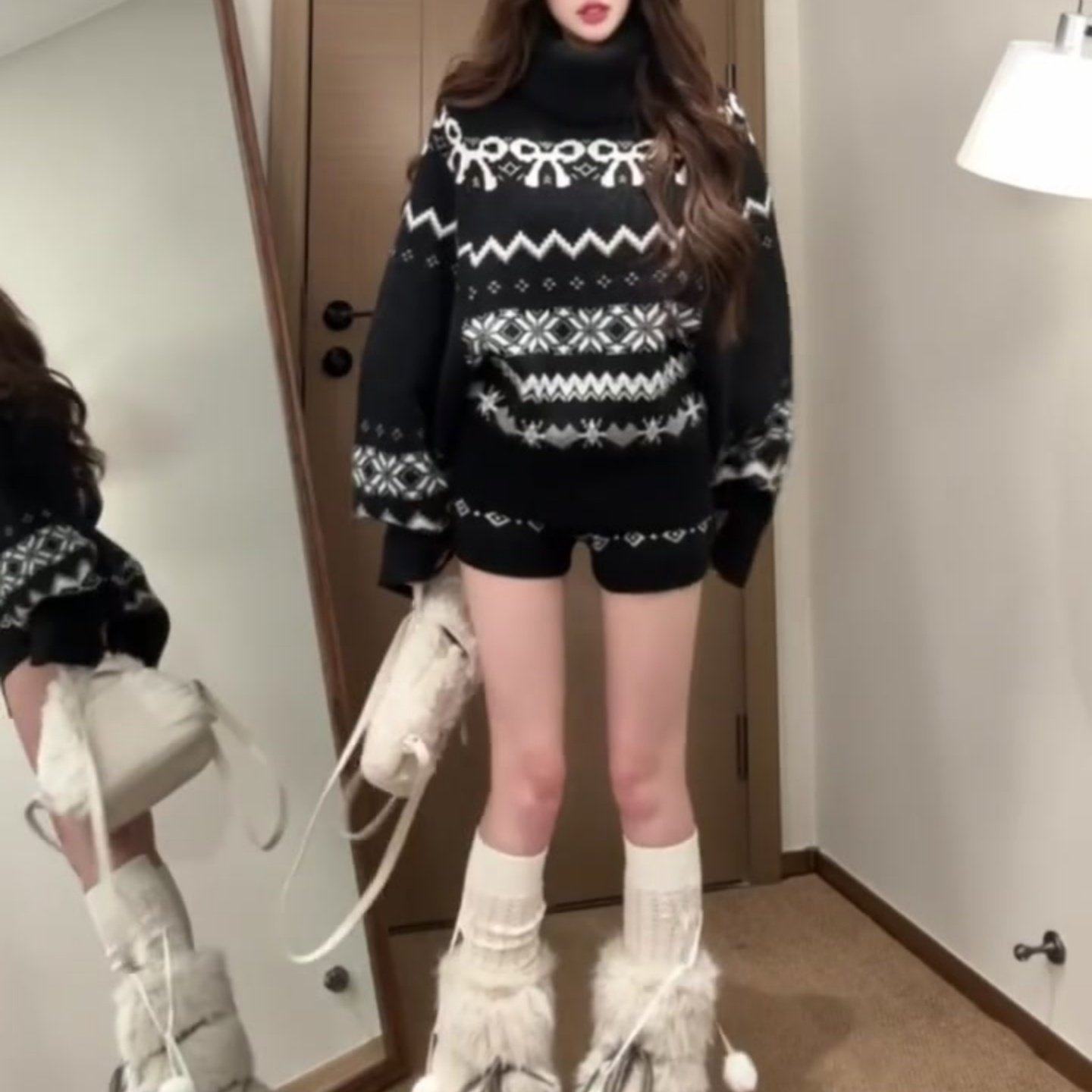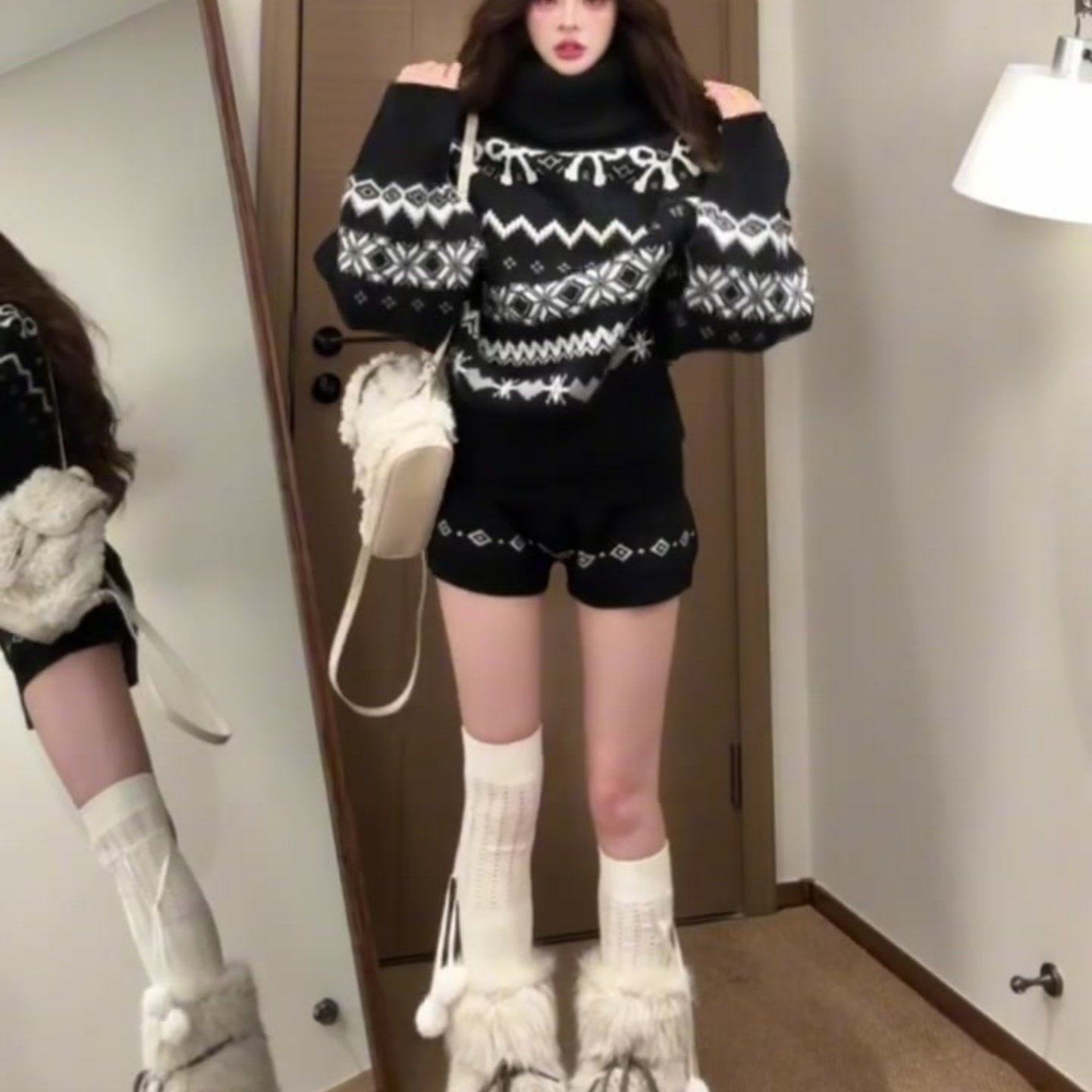 费尔岛套装女秋冬季小个子黑色加厚高领针织毛衣休闲短裤子两件套