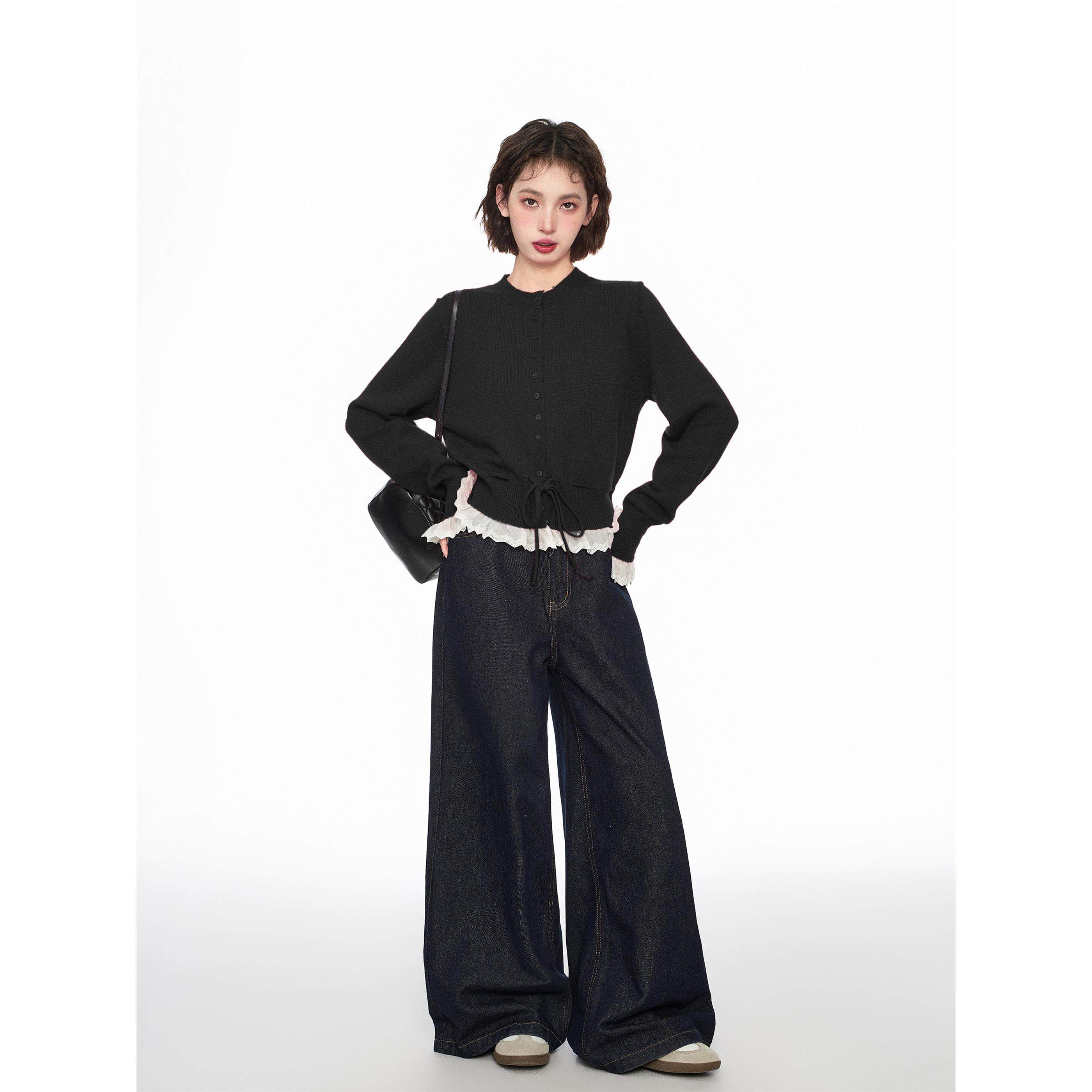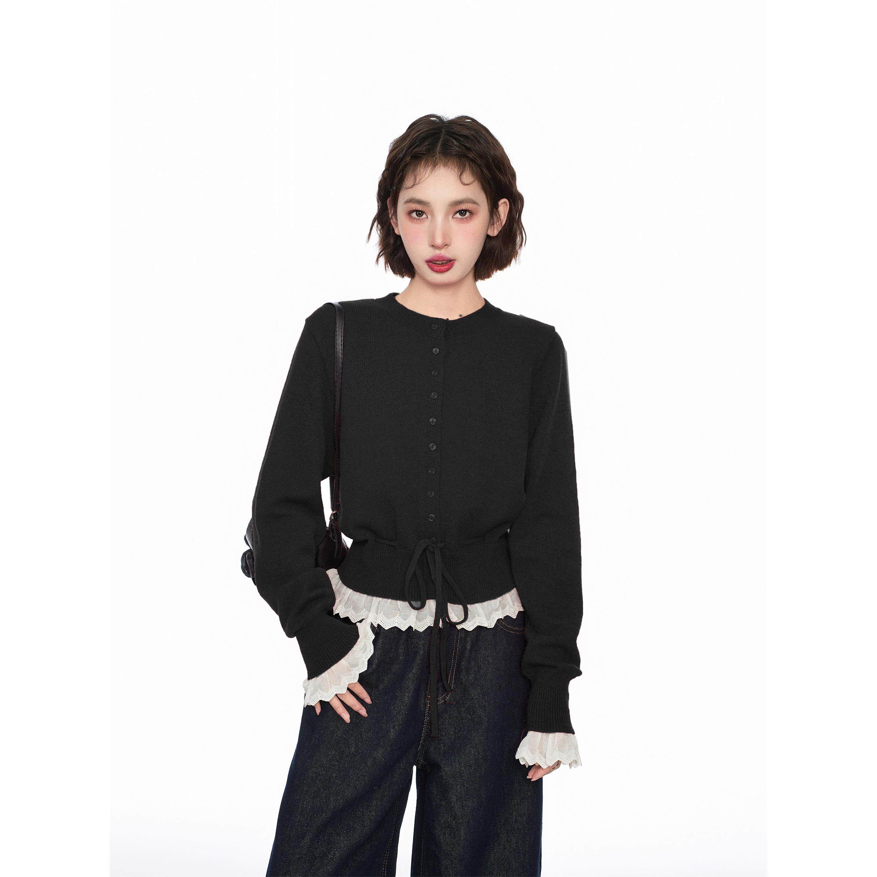 黑色假两件蕾丝花边针织毛衣女秋冬季小个子打底内搭短款开衫外套