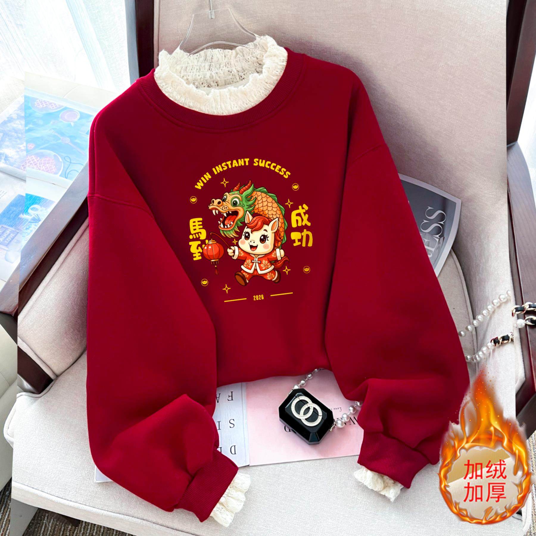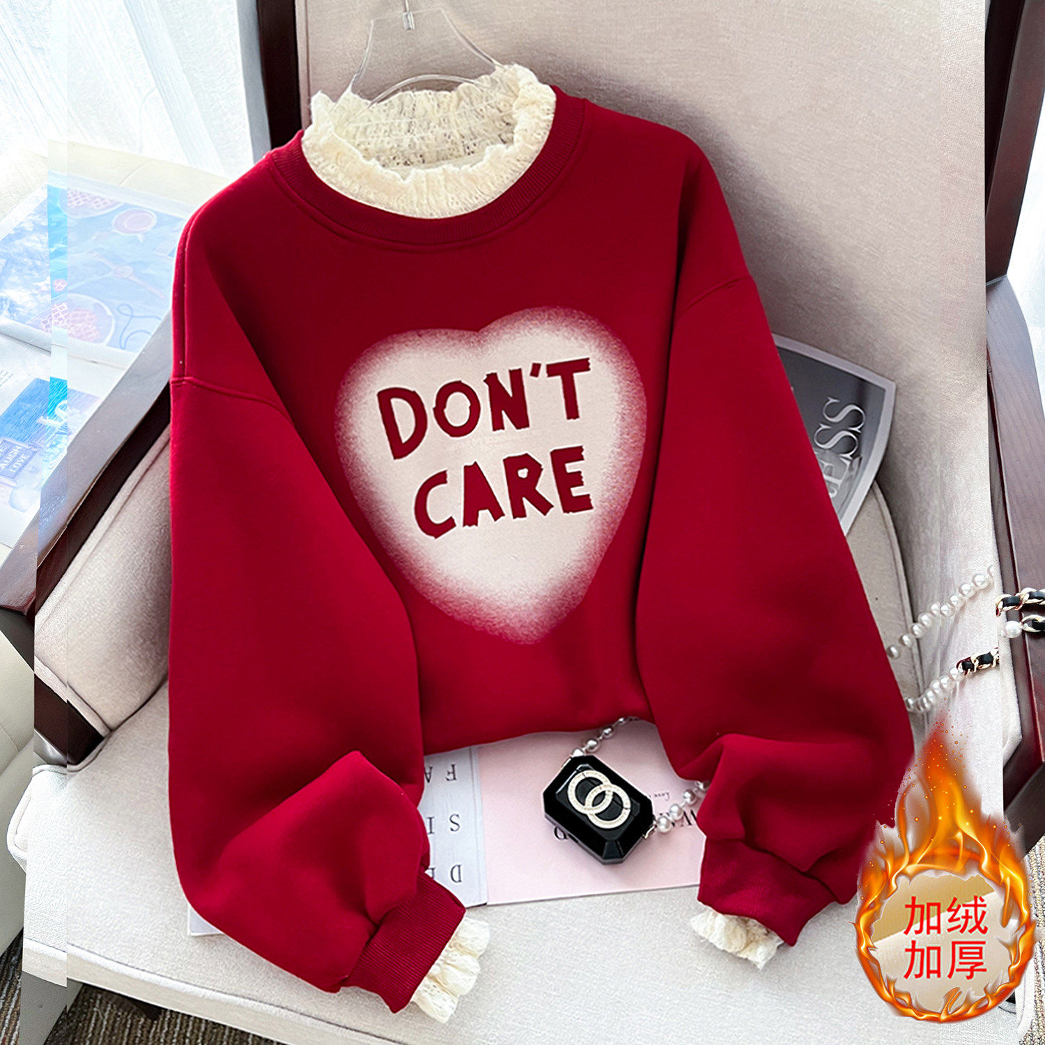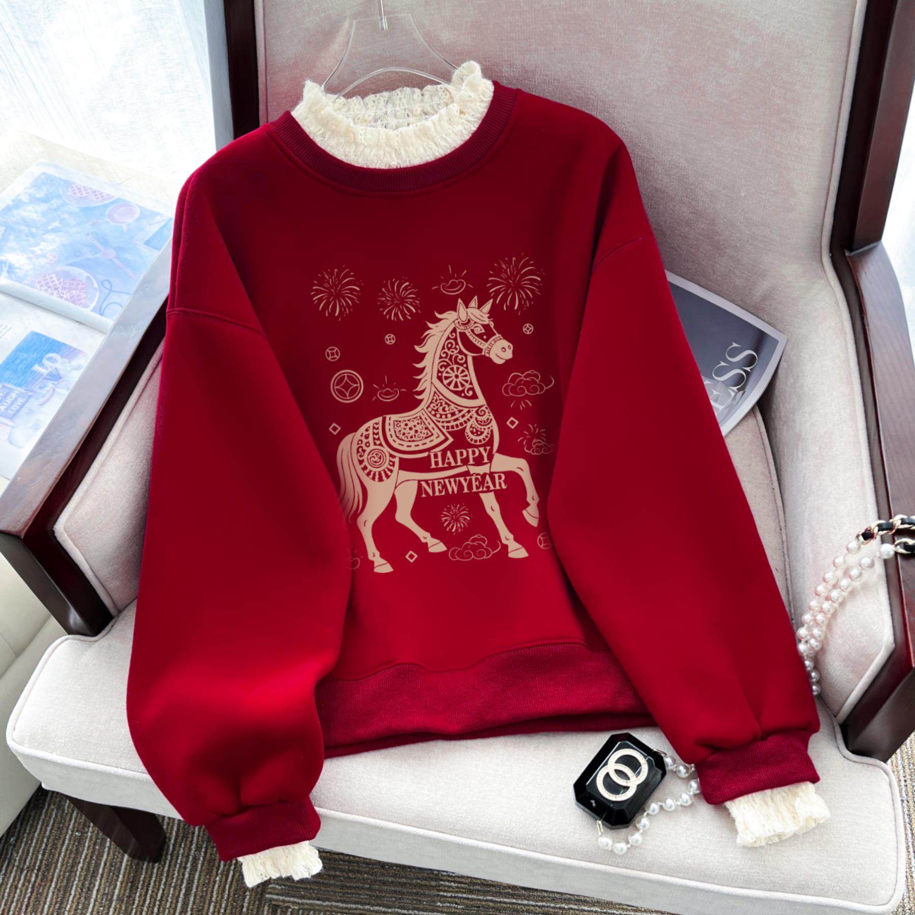 中山卫衣新年红色假两件蕾丝领卫衣女宽松显瘦加绒加厚百搭上衣潮