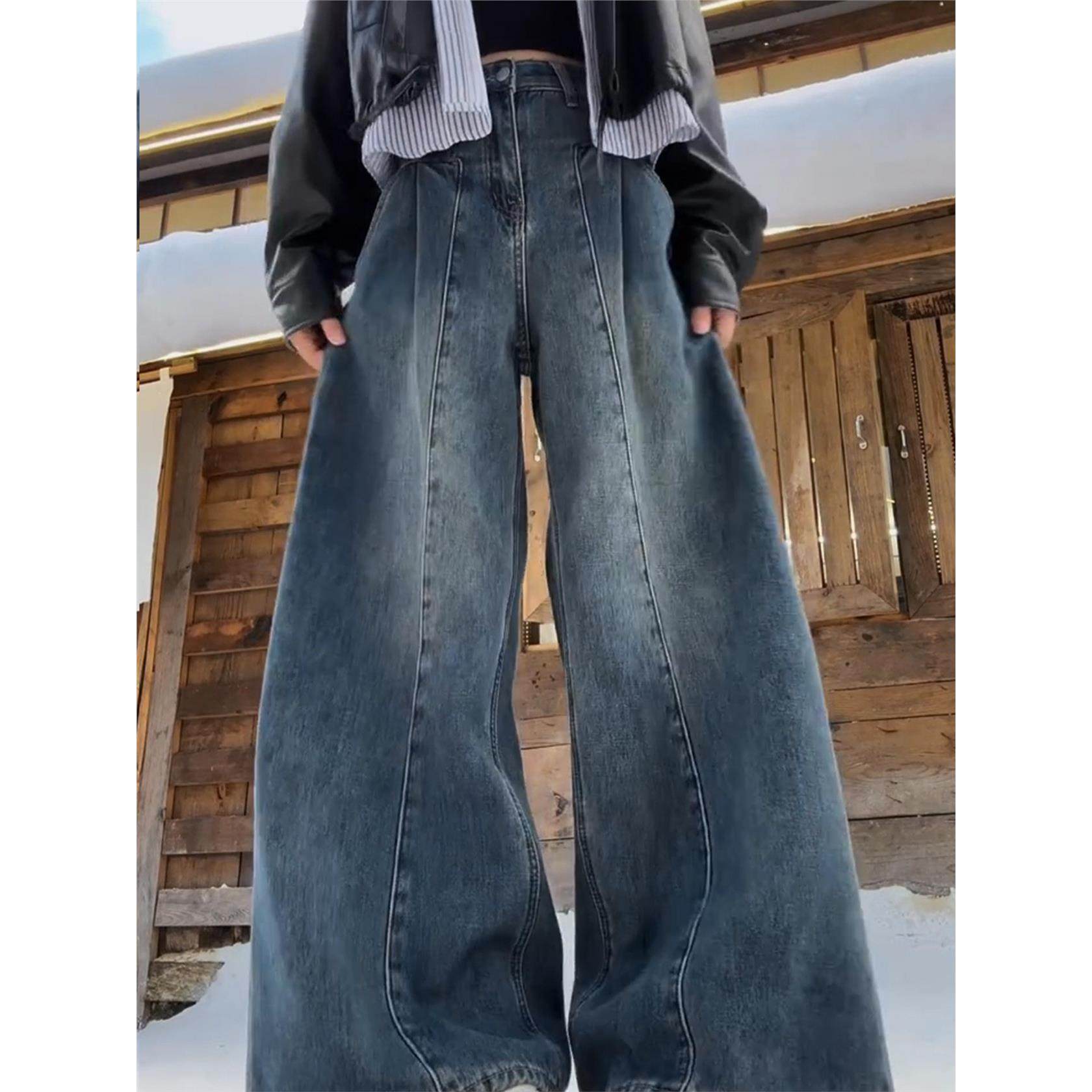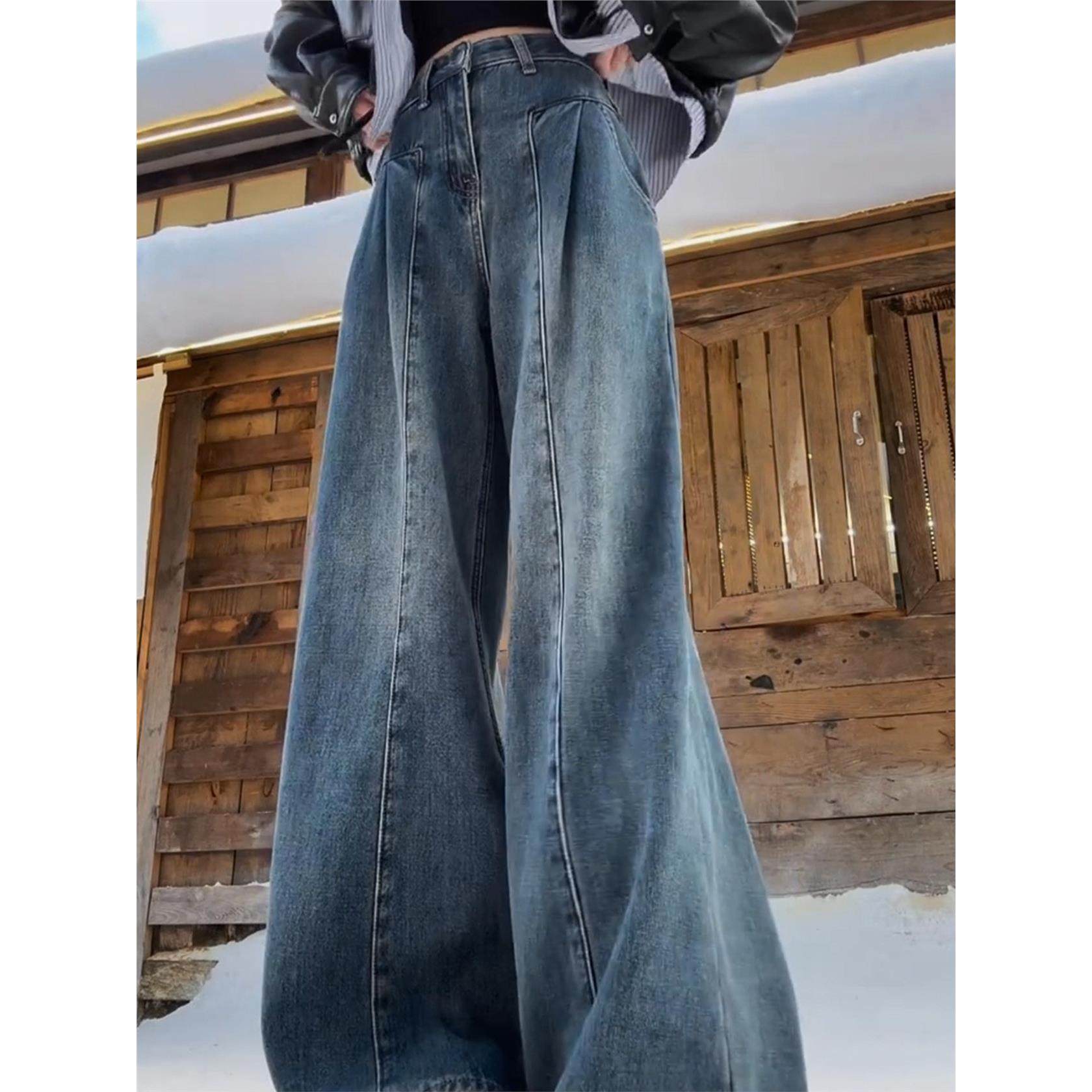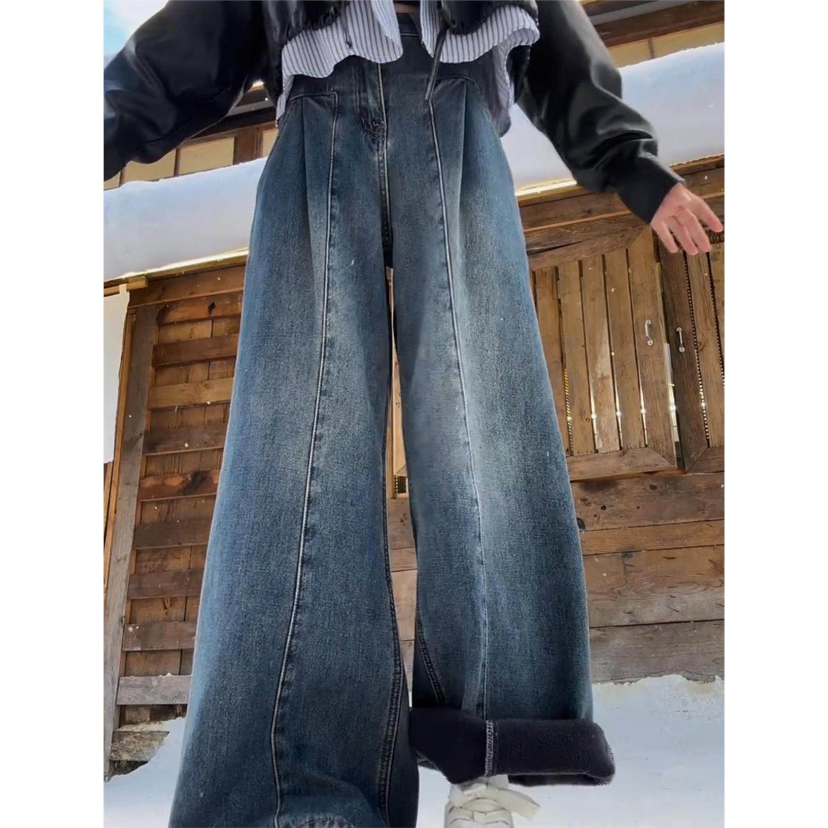 覆古加绒加厚牛仔裤女大码冬梨型身材bf慵懒风裤子胖mm宽松阔腿裤
