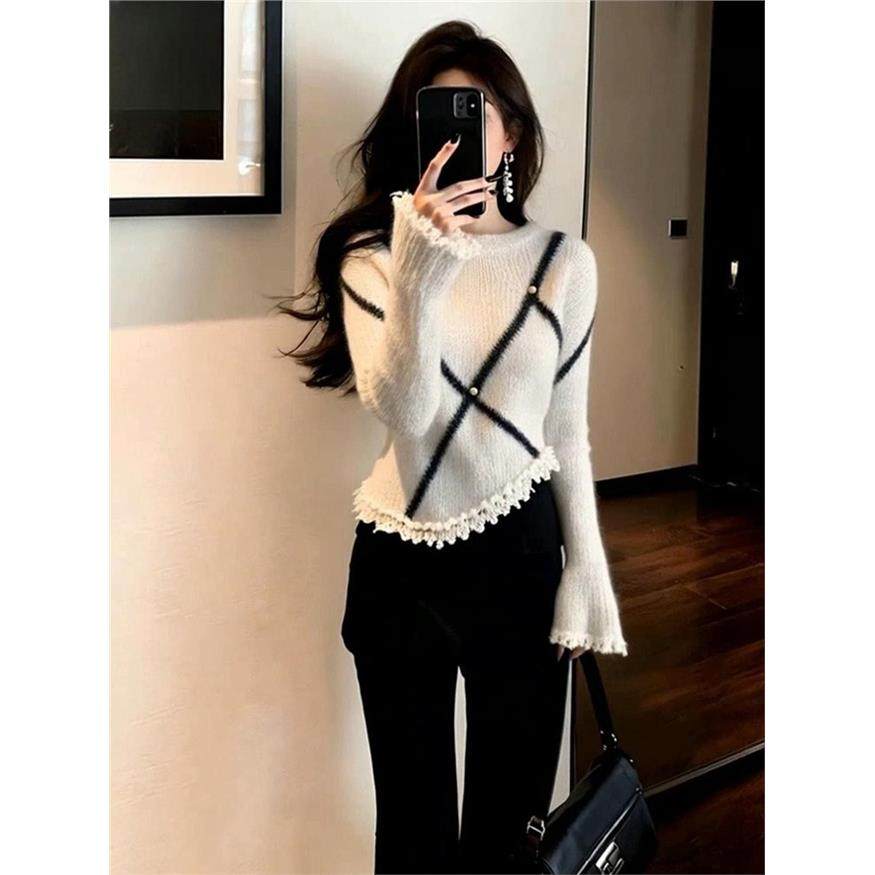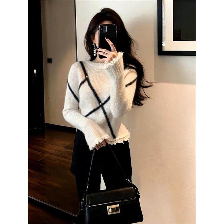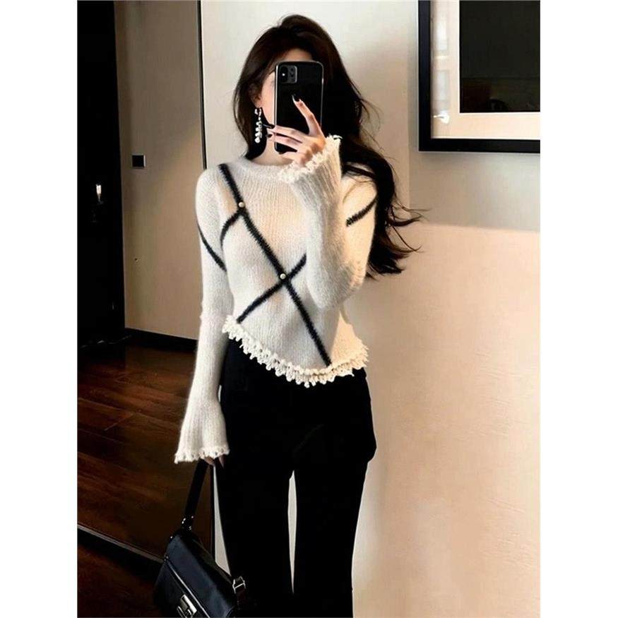 法式小香风毛衣女2025新款白色内搭打底针织衫设计感别致收腰上衣