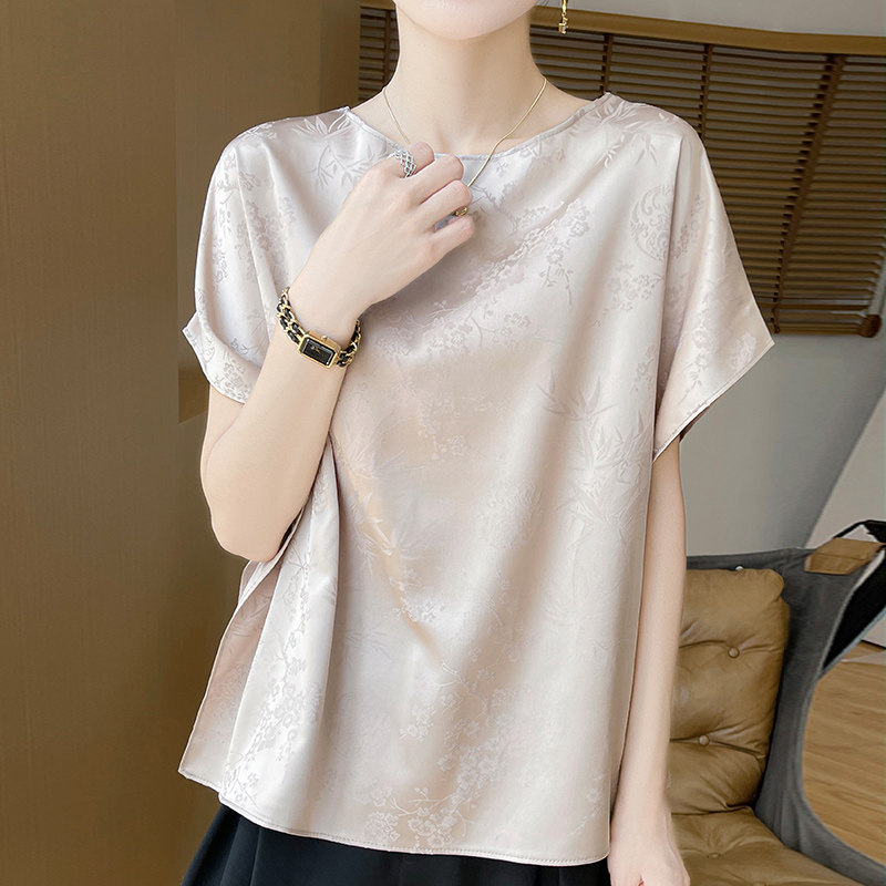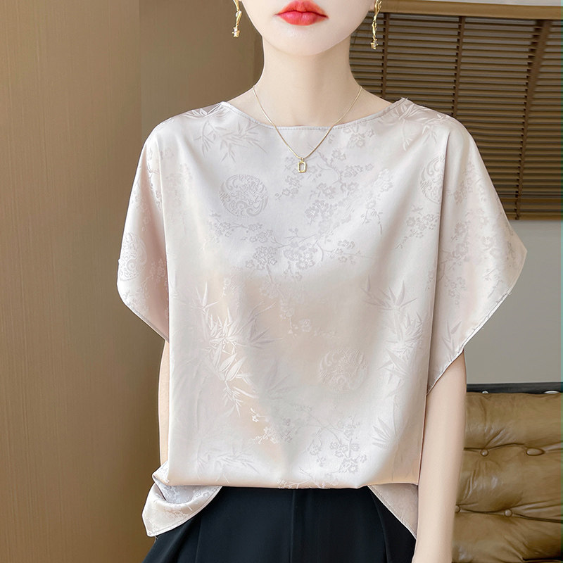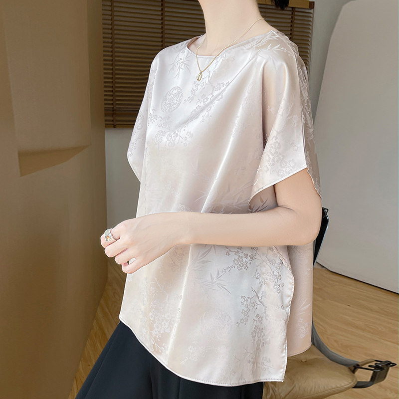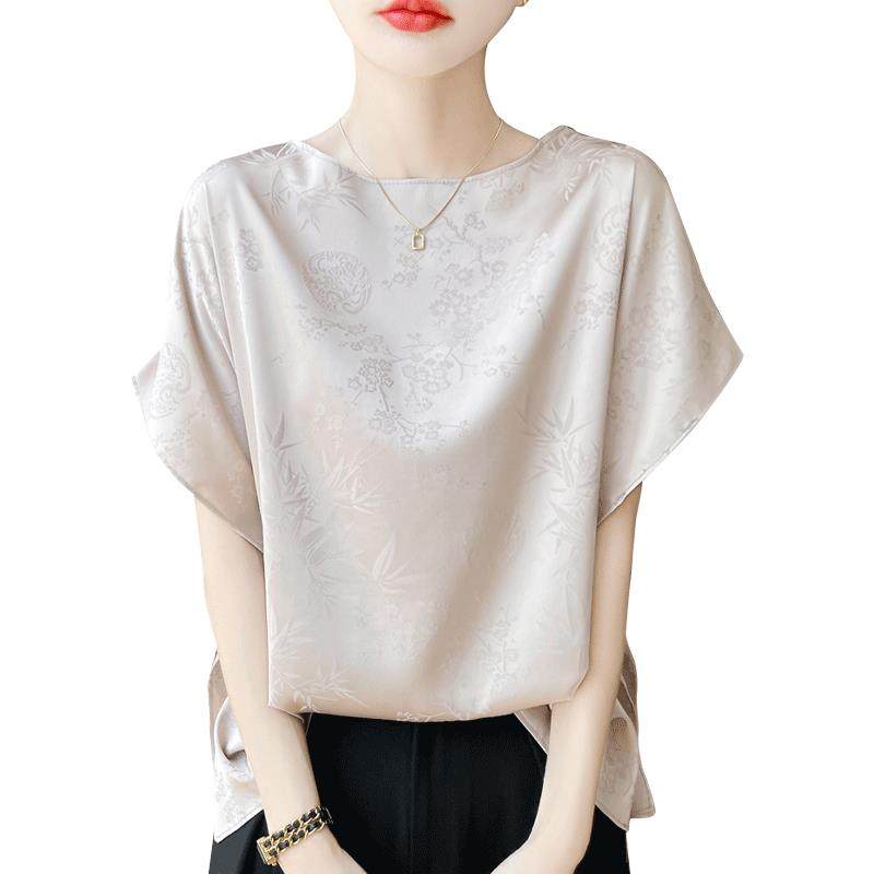 风醋酸浮雕提花蝙蝠袖上衣女夏真丝缎面宽松显瘦时尚上衣衬衫