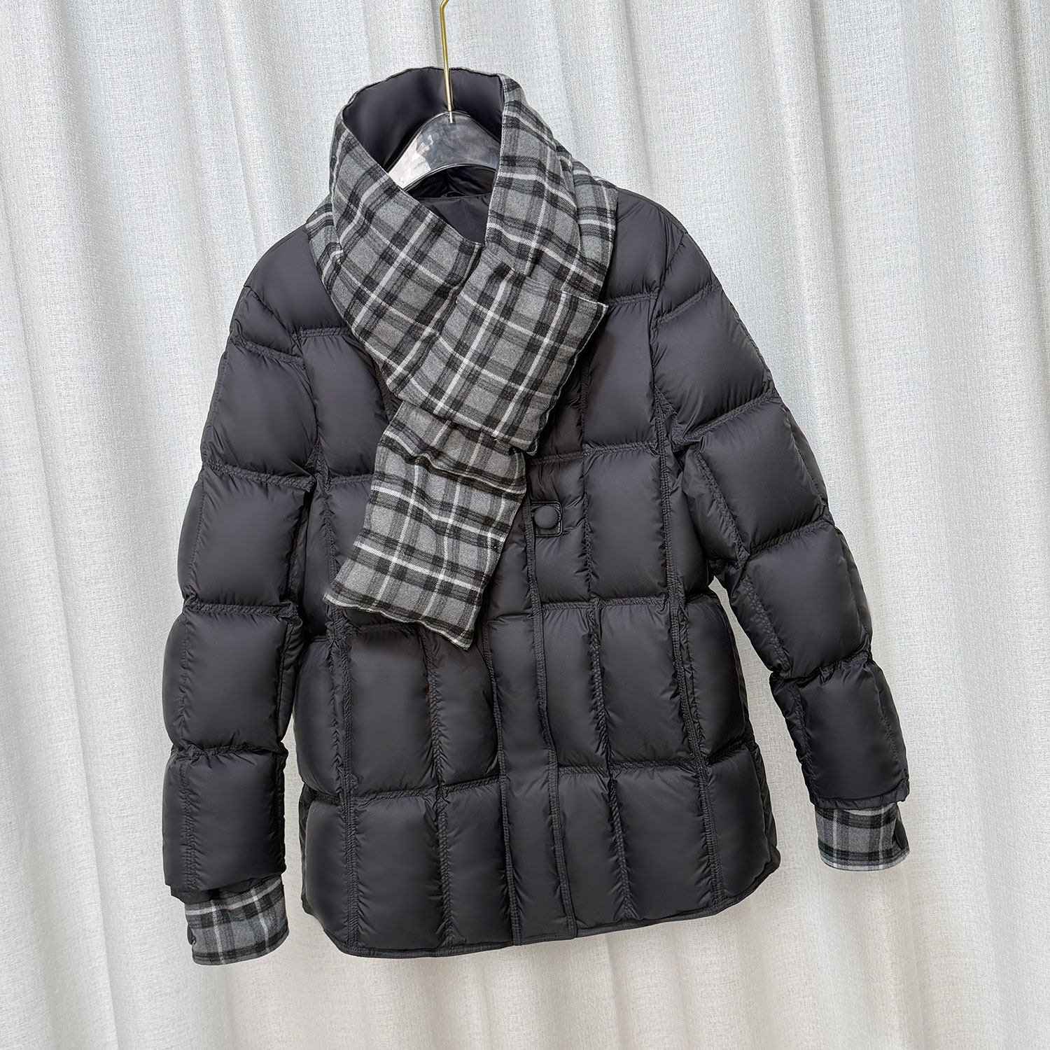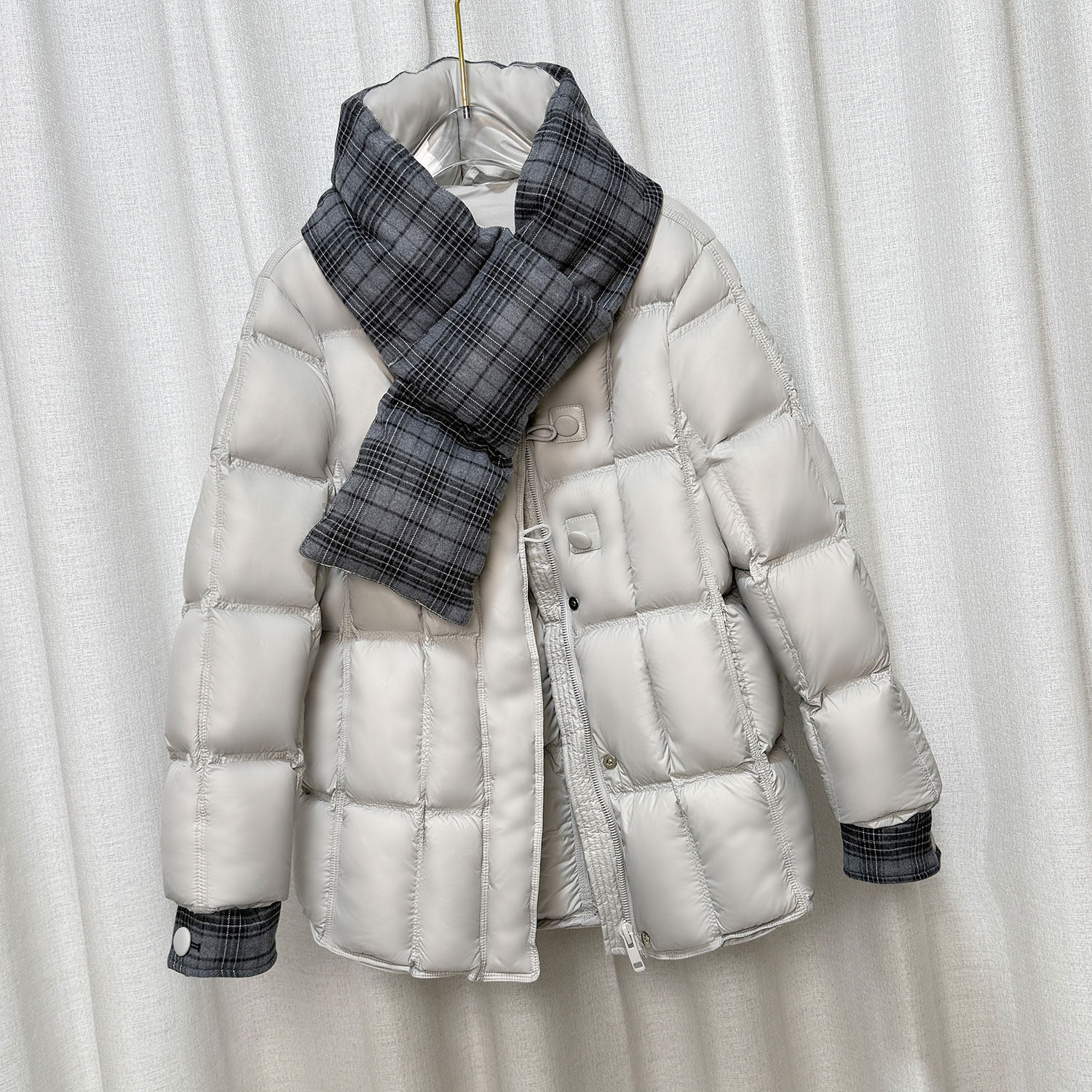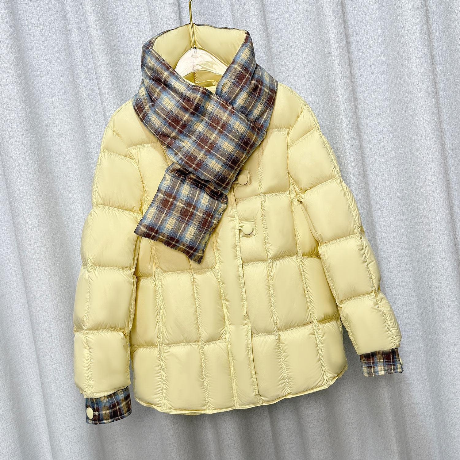 泡芙围巾格子圆领时尚羽绒服中长款款冬季新款显瘦保暖白鸭绒外套