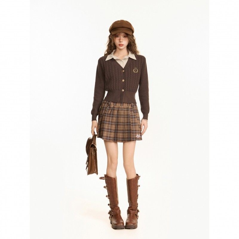 美拉德咖色polo假两件短款针织毛衣开衫女秋冬学院风内搭打底上衣