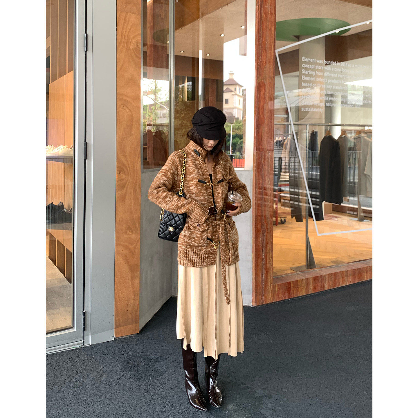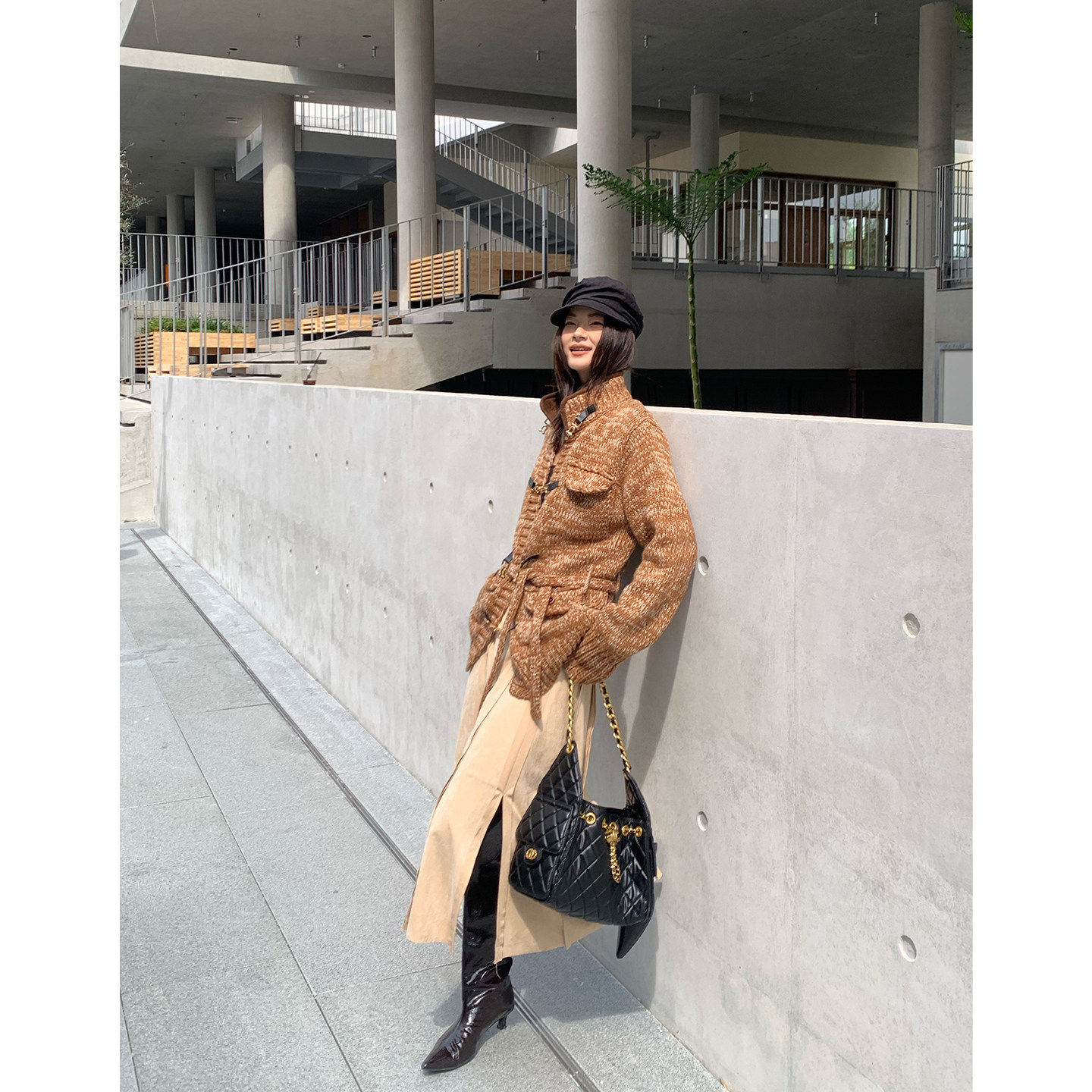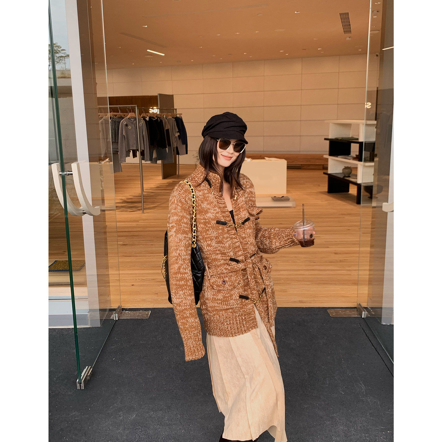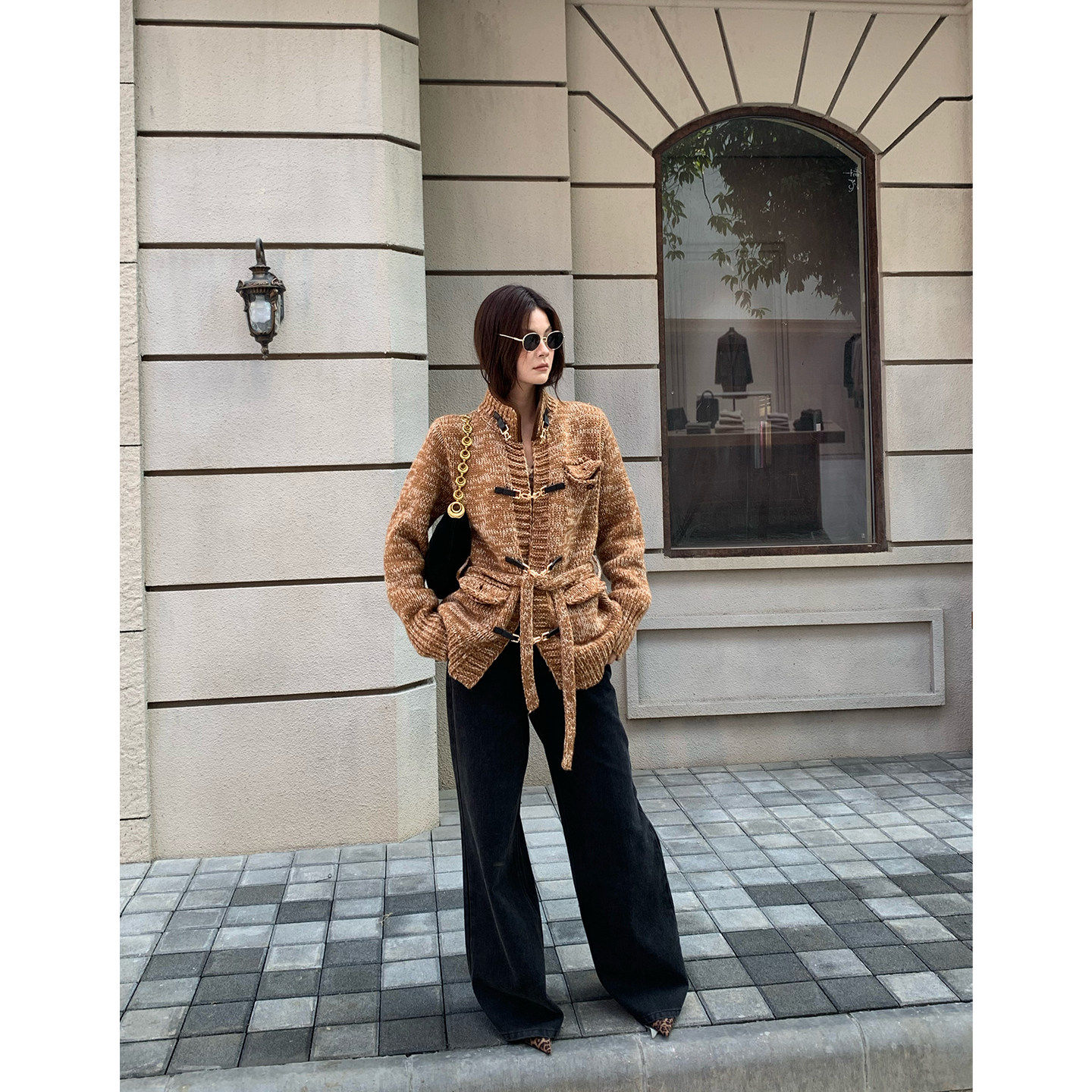 马儿MAR 秋冬新款羊毛混纺复古设计感花纱立领毛衣女冬收腰外套