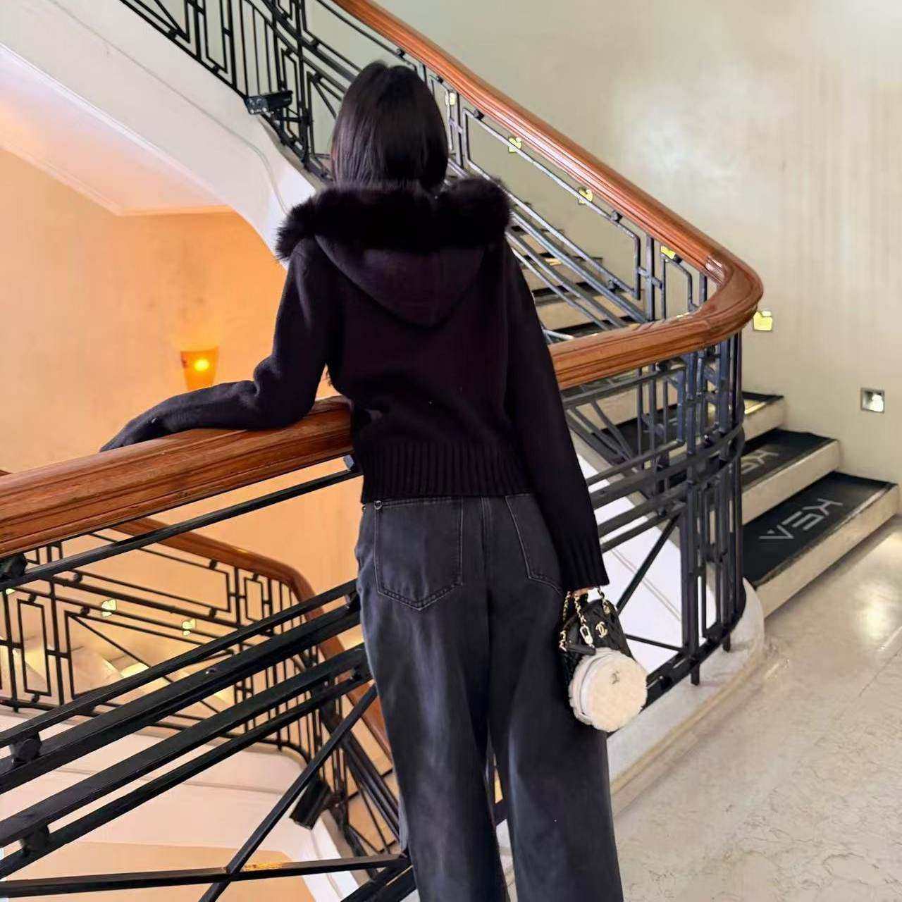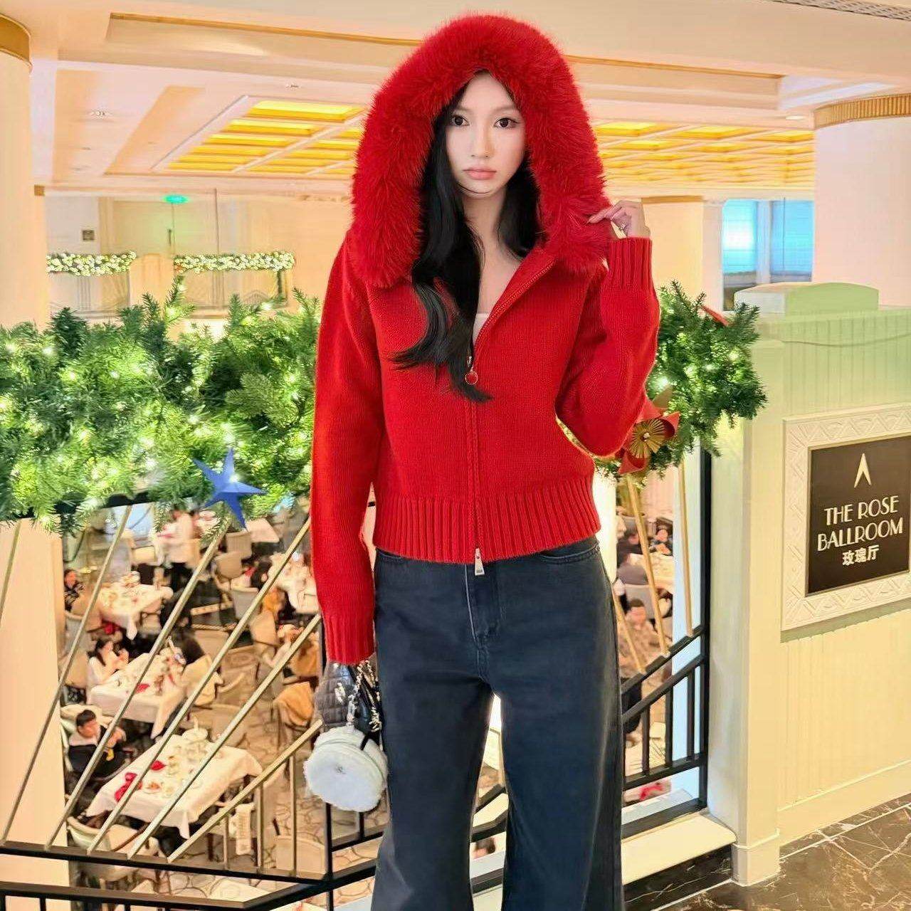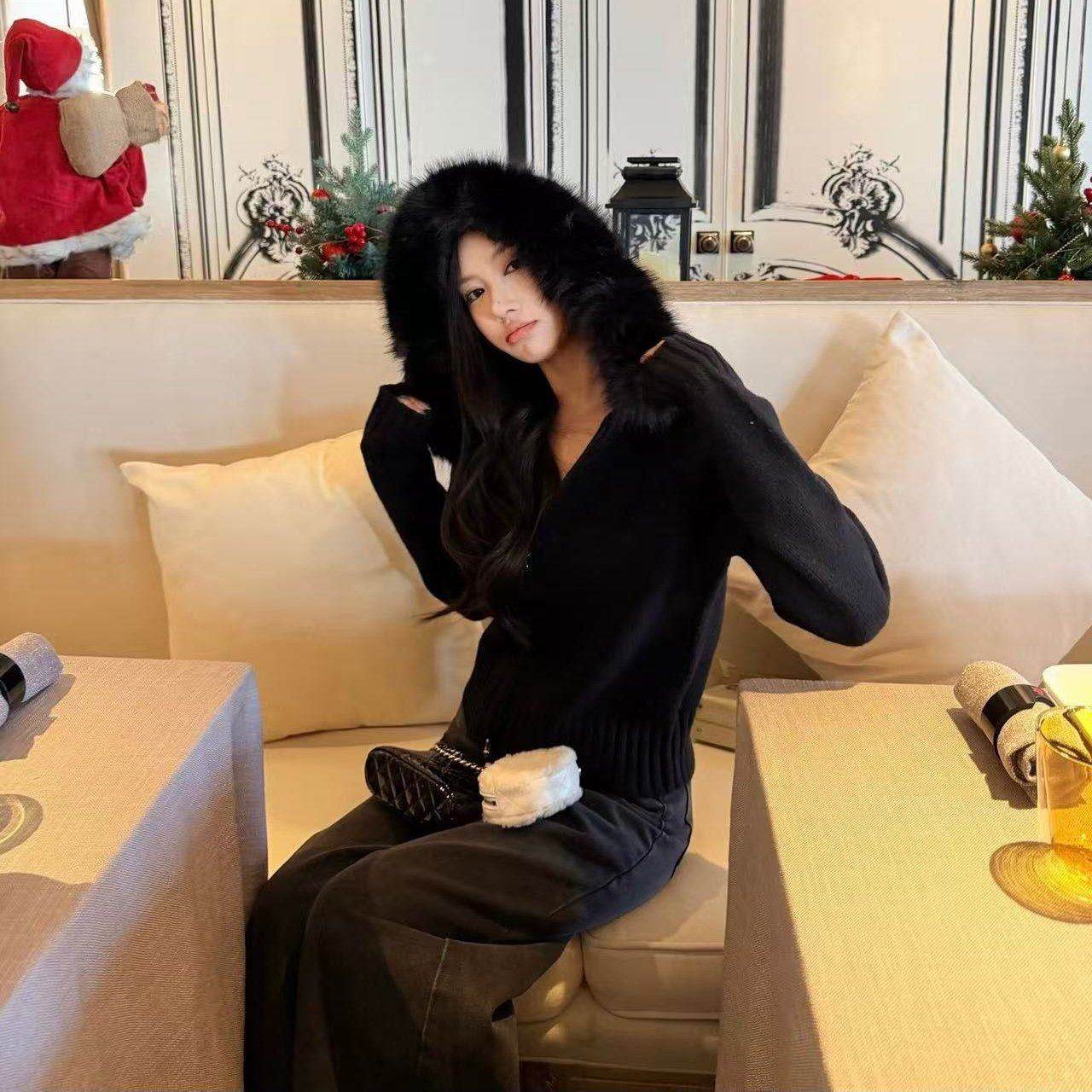 好漂亮好漂亮连帽针织毛领外套女2025年冬季新款短上衣宽松休闲潮