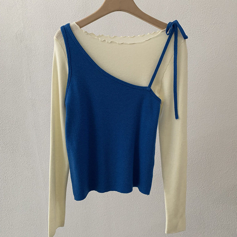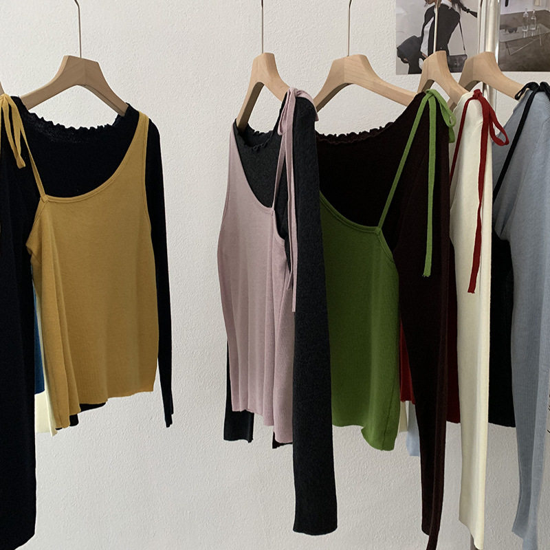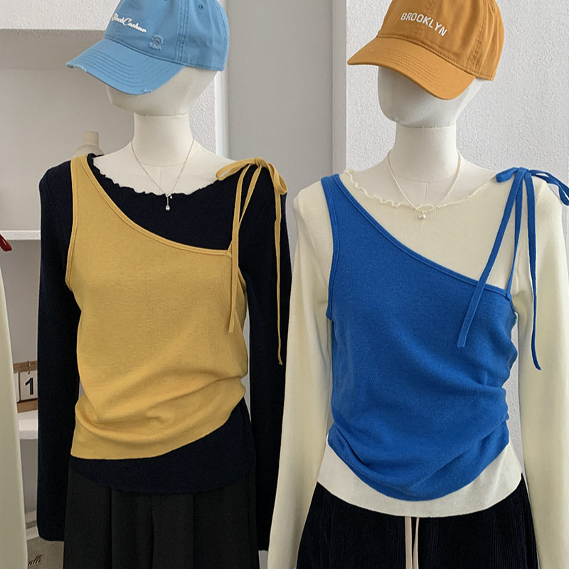 欧玛莱 斜肩绑带纯色背心+波浪边亲肤长袖针织衫两件套上衣女6367