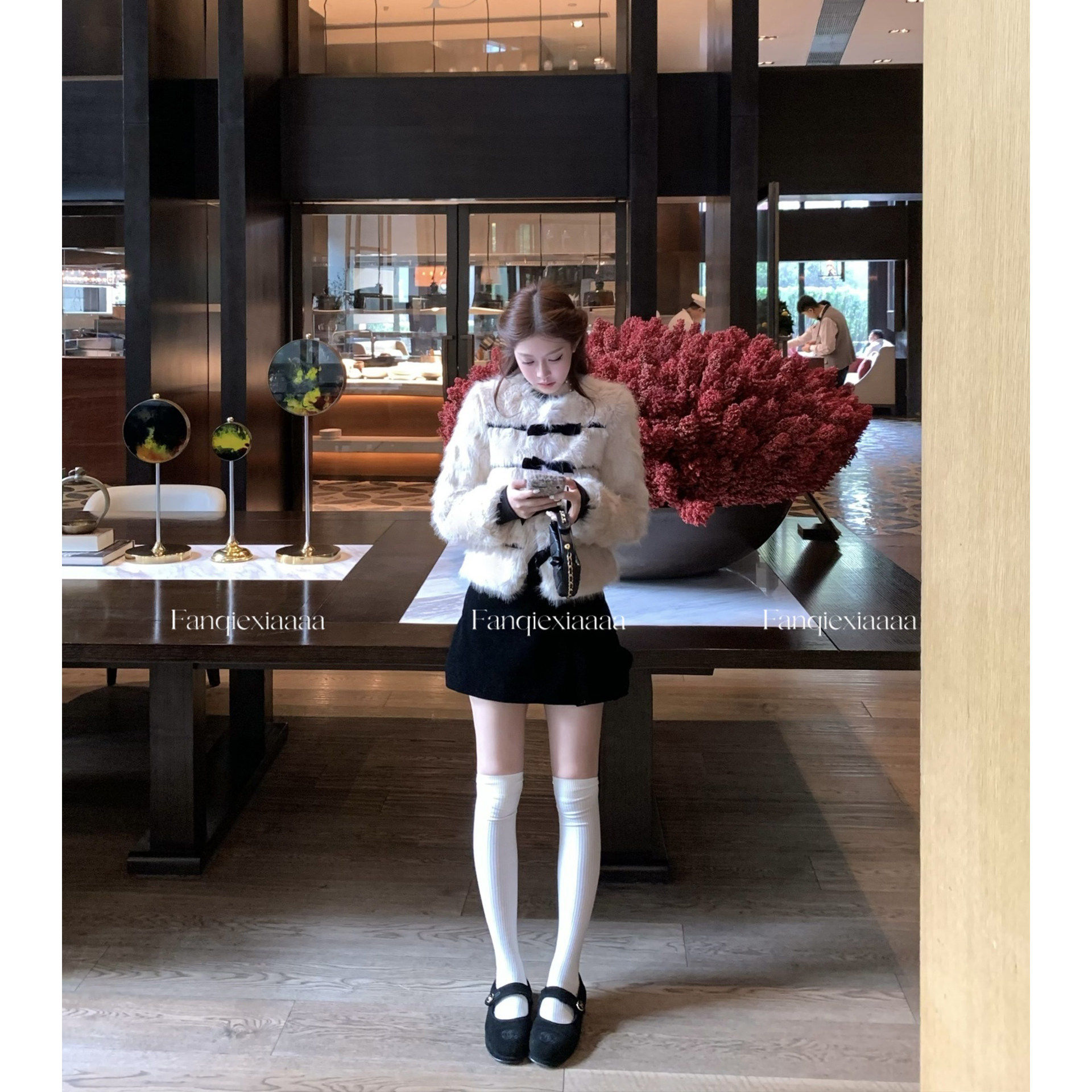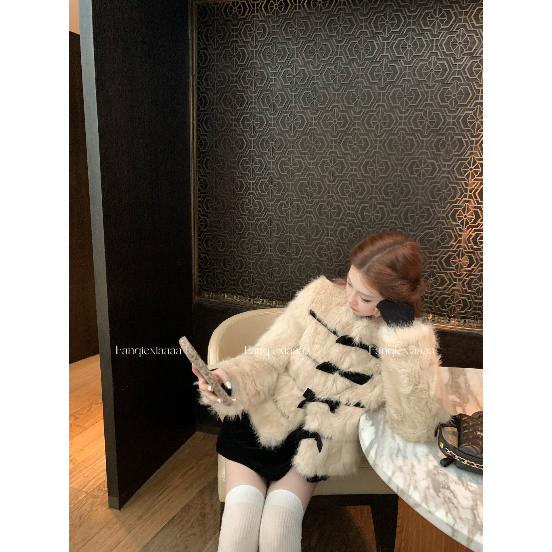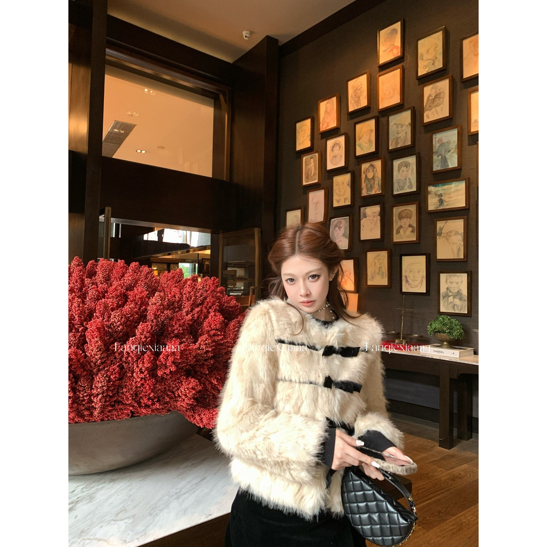番茄侠 古堡甜心 vtg黑丝绒蝴蝶结短款毛毛外套女钩扣仿皮草外套