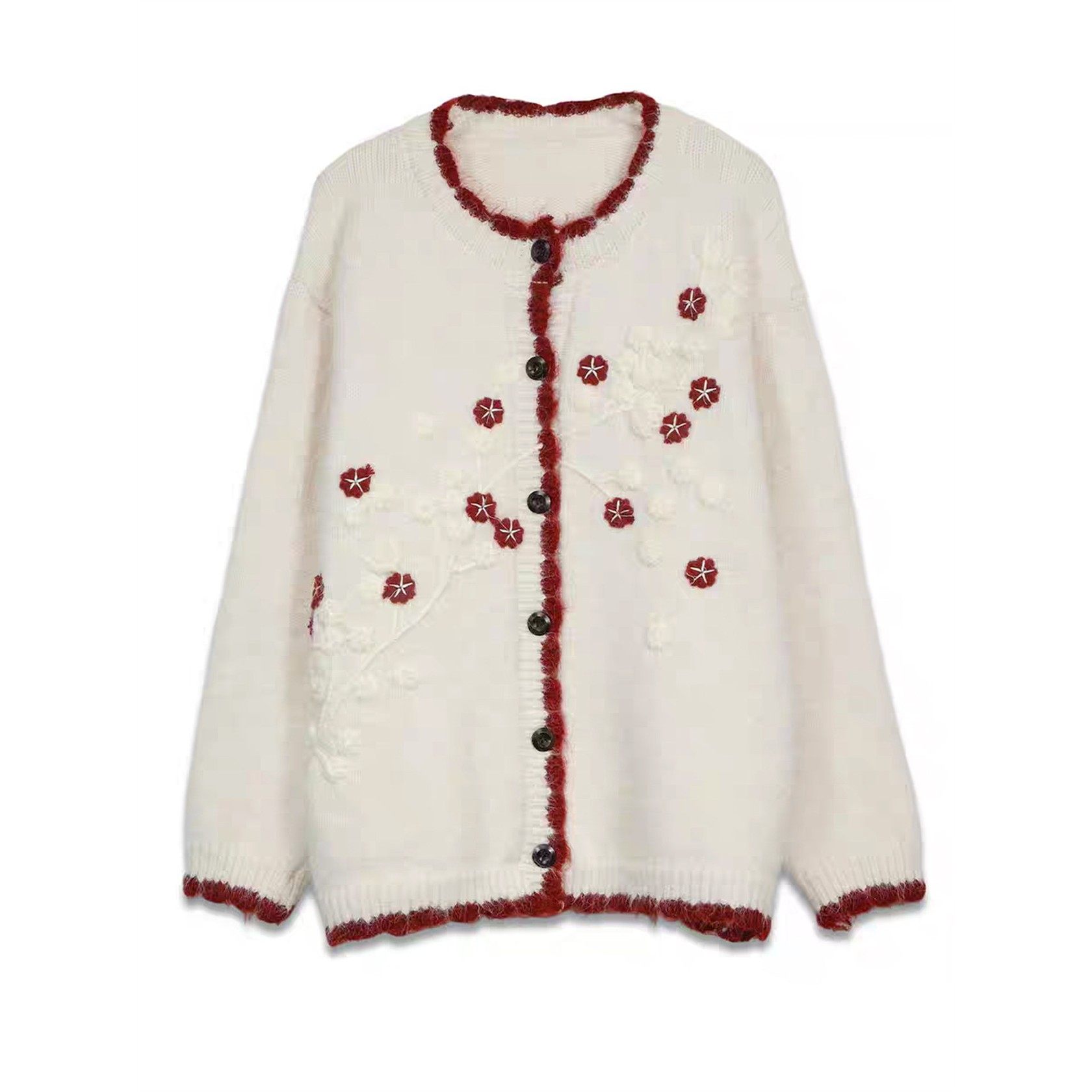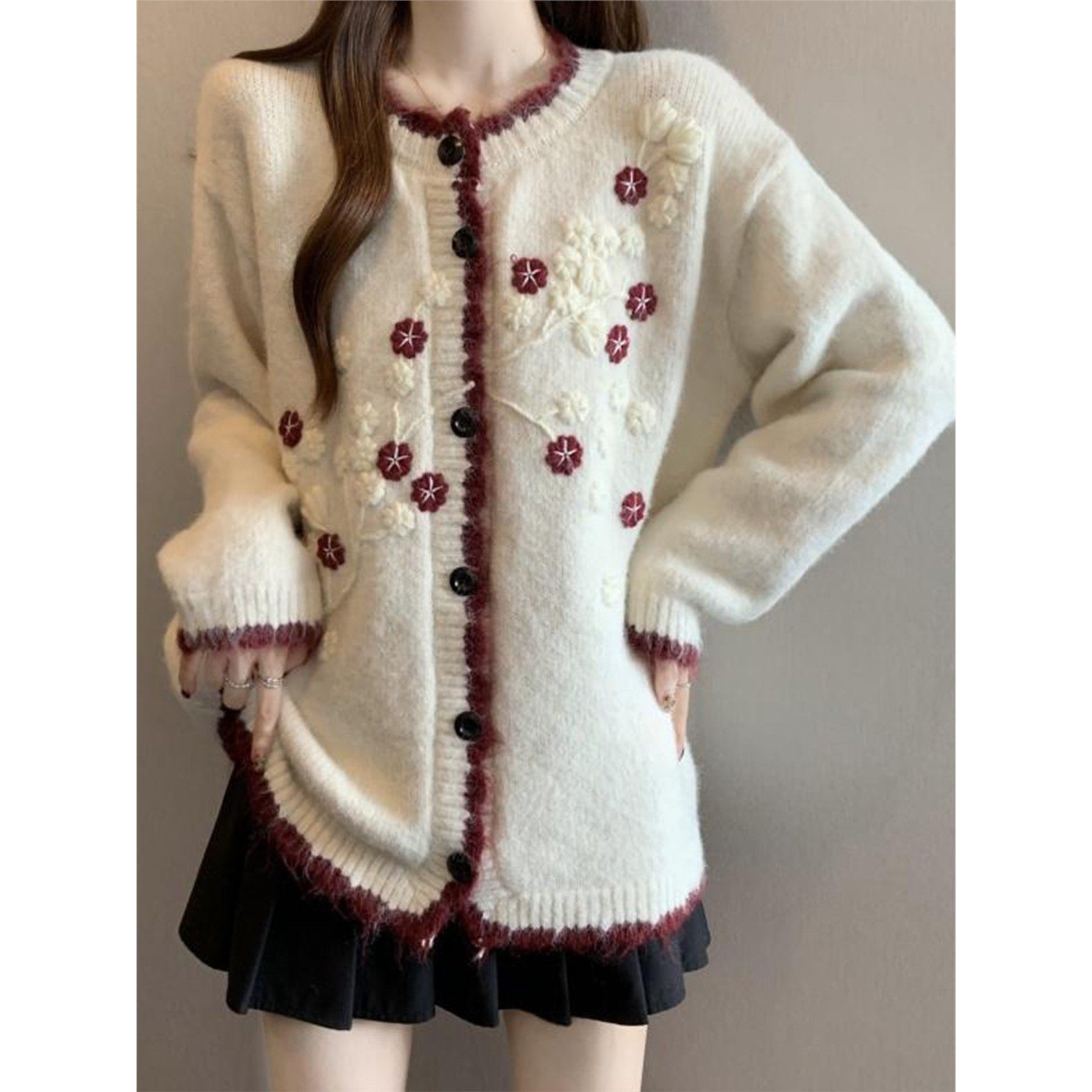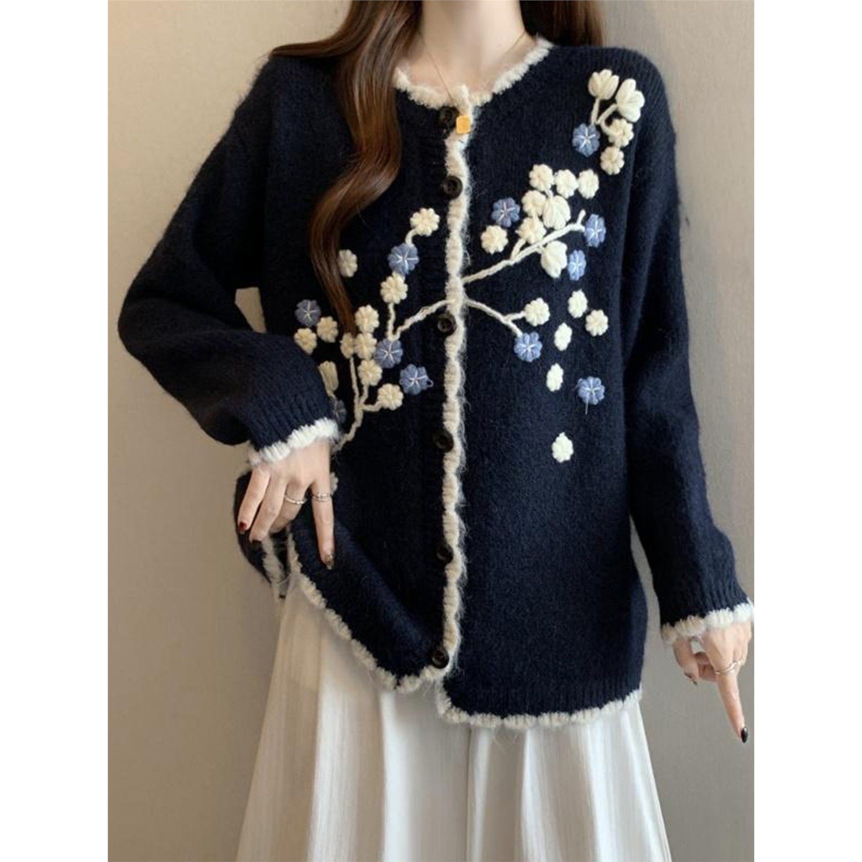 藏蓝色重工刺绣花朵毛衣外套女秋冬大码胖mm慵懒风高级感针织开衫