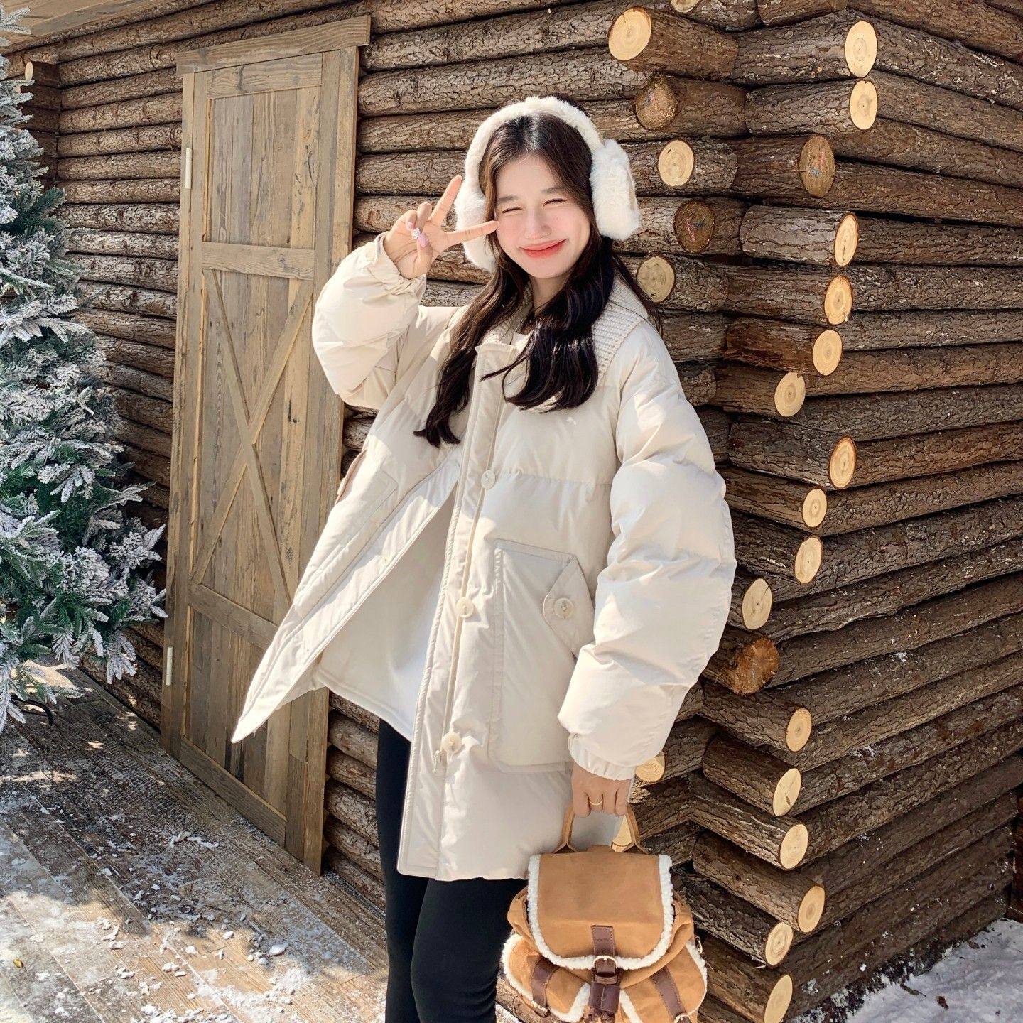 米白色针织拼接羽绒服女冬季小个子韩系显瘦加厚中长款白鸭绒外套