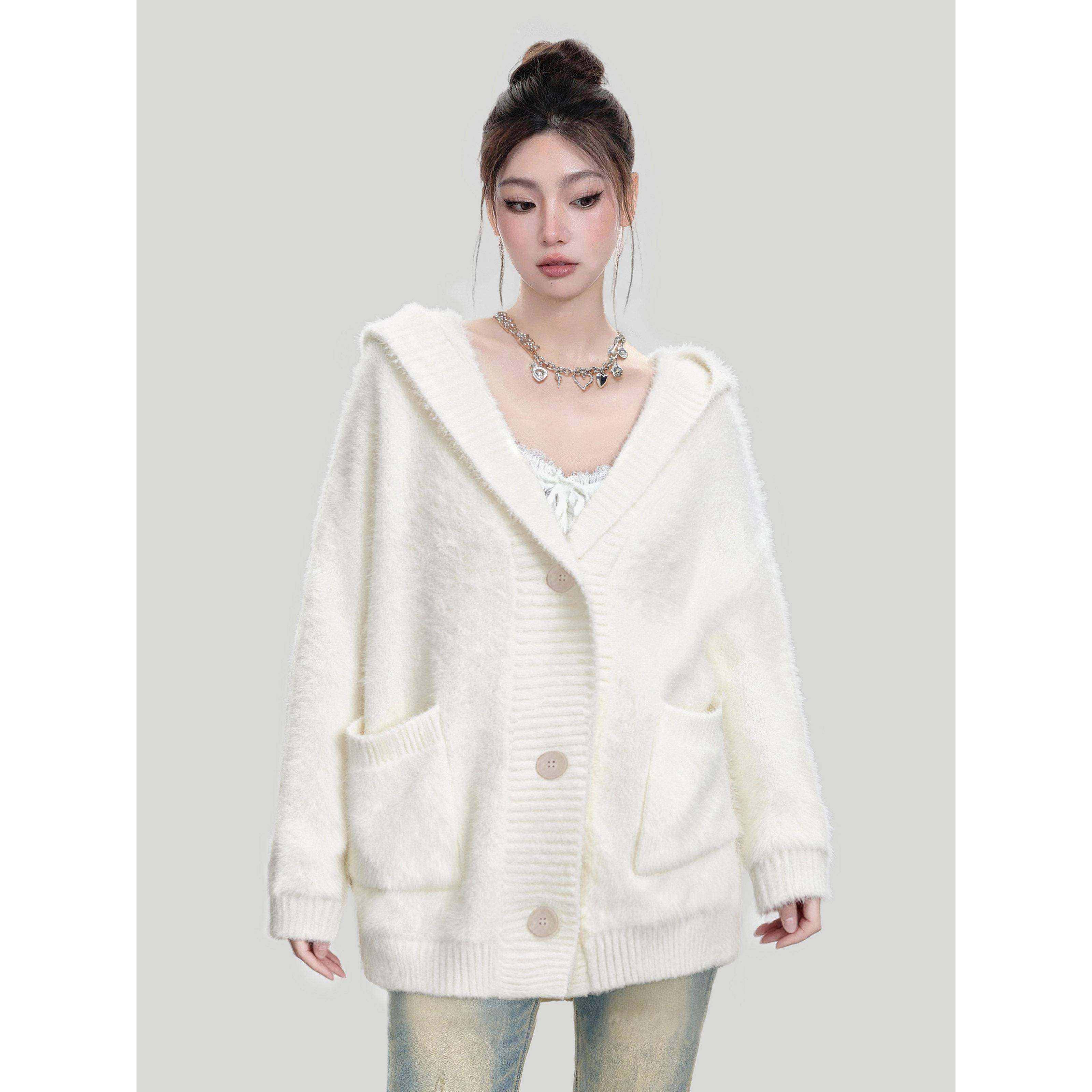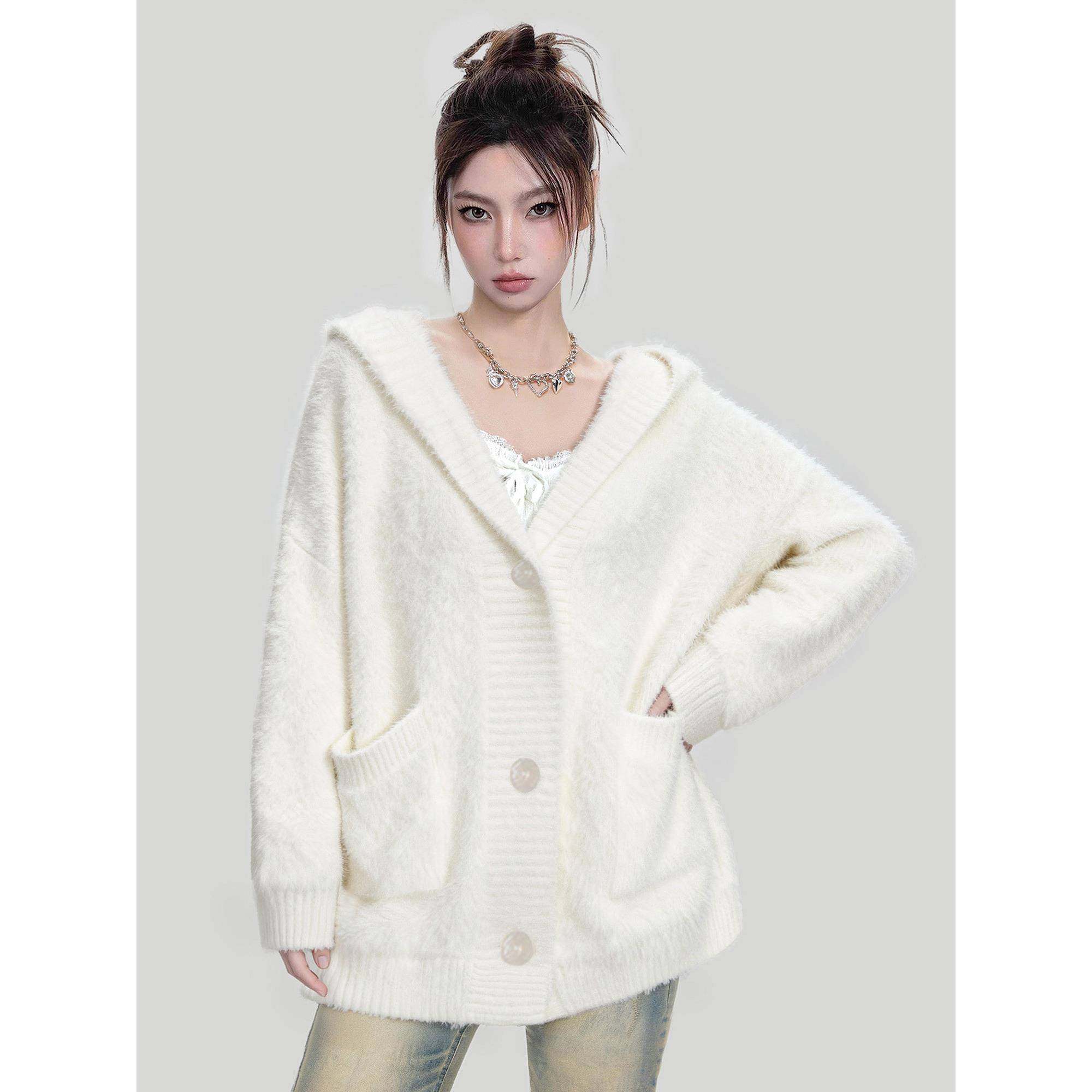 白色马海毛连帽v领毛衣外套女秋冬季加厚软糯慵懒水貂绒针织开衫