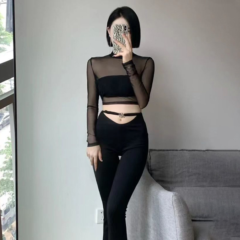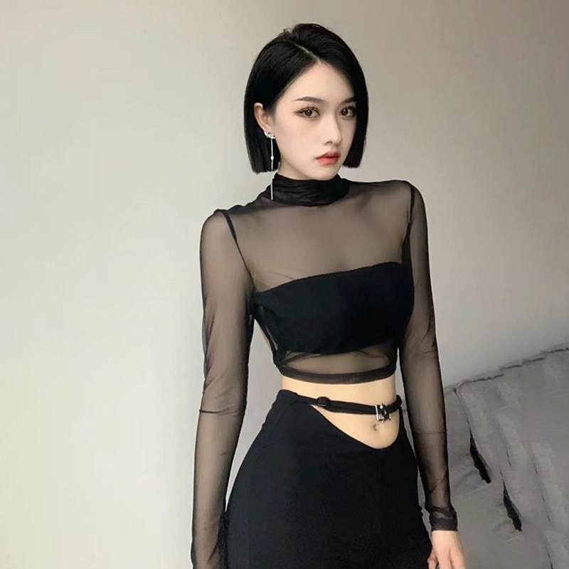 透视性感露背蕾丝网纱上衣网红甜美黑色紧身短款网纱时尚长袖衫女