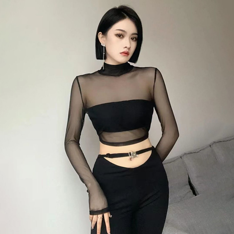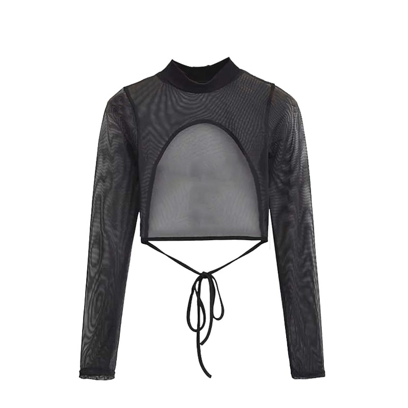 首页> 女装> 透视性感露背蕾丝网纱上衣网红甜美黑色紧身短款网纱时尚长袖衫女
