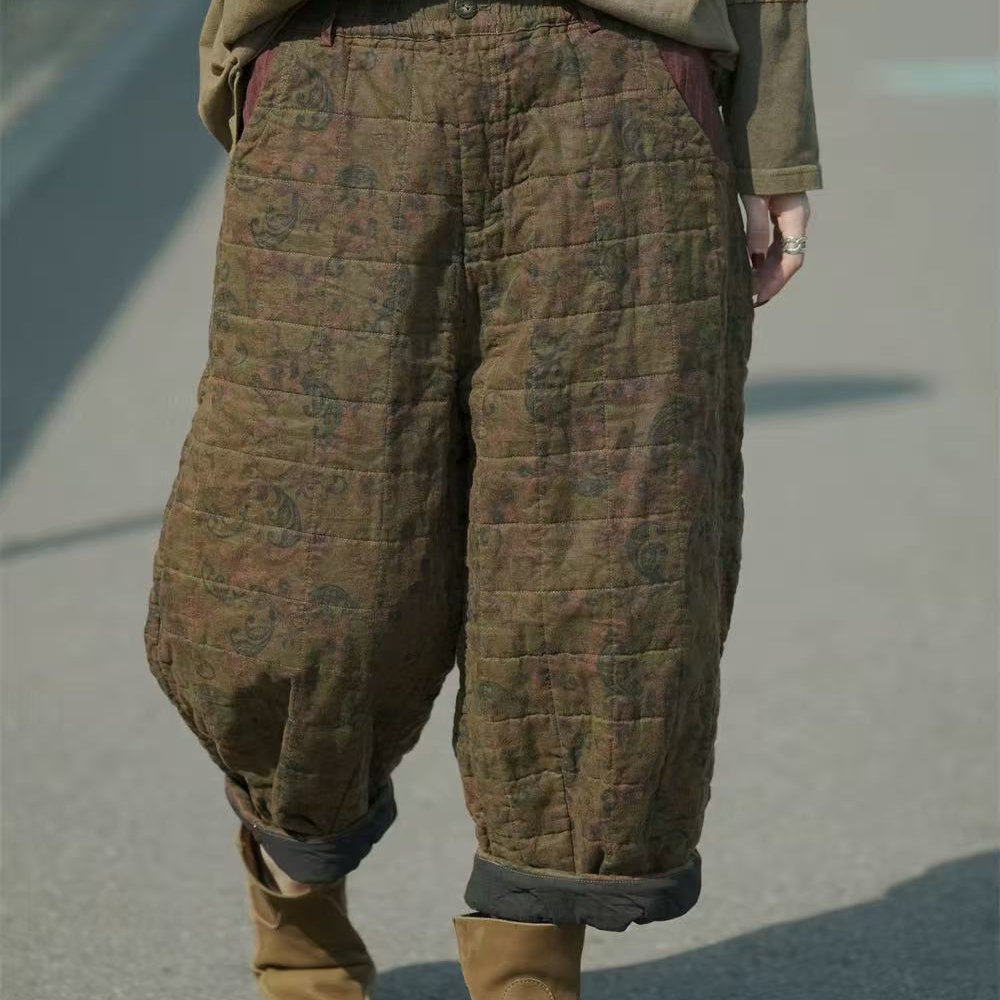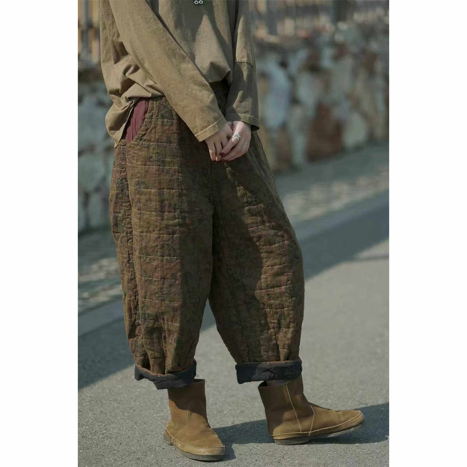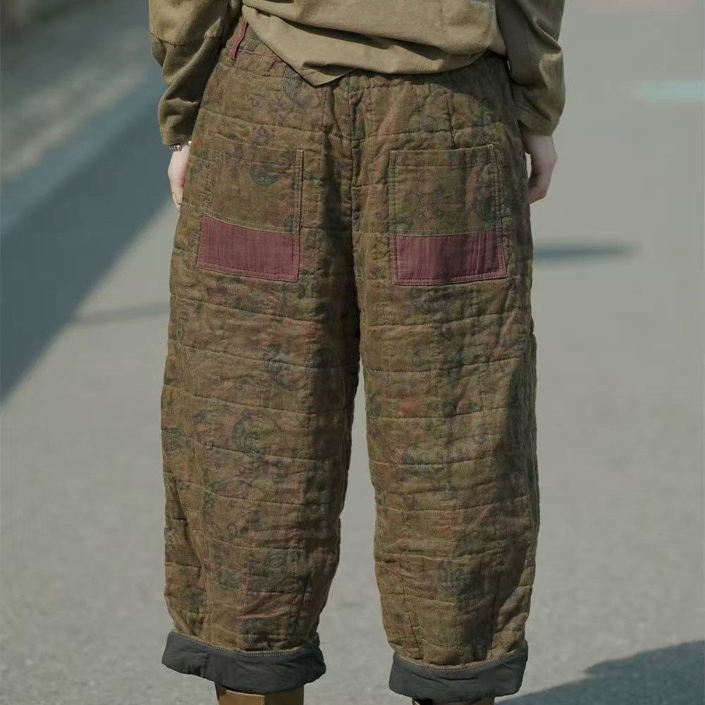 荼-冬季亚麻做旧印花松紧腰休闲棉裤35272(长88围126)