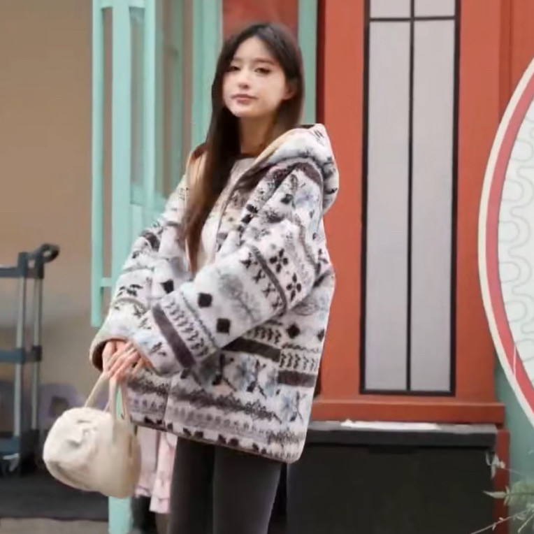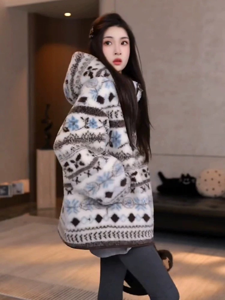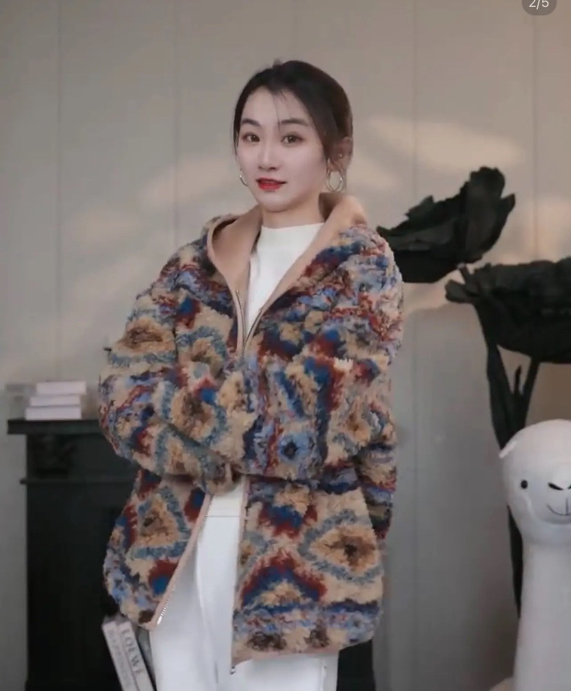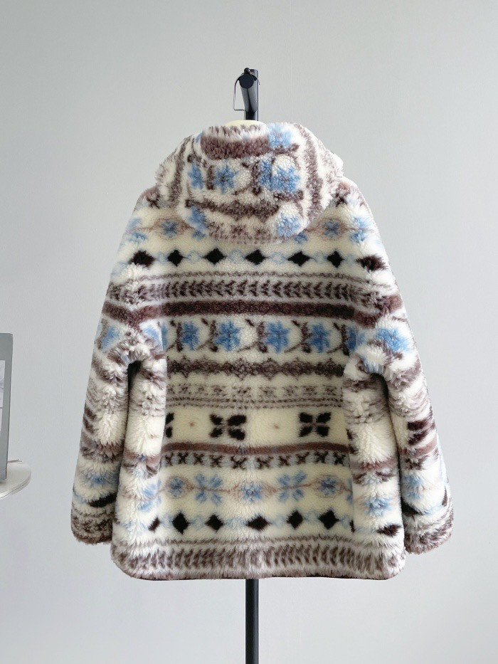 C102双面穿费尔岛全羊毛立领连帽加厚羊剪绒皮毛一体皮草外套冬