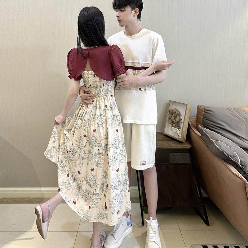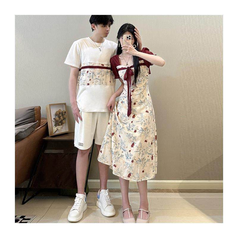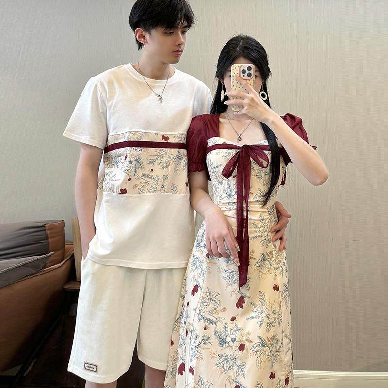 情侣装高级感套装一衣一裙新中式复古碎花拼接方领改良连衣裙小众