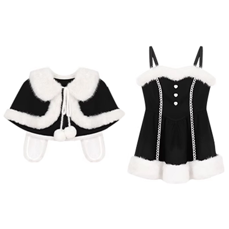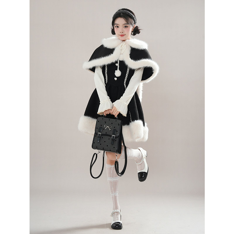 毛茸茸斗篷呢子套装裙女2024秋冬新款加厚毛绒拼接圣诞裙子三件套