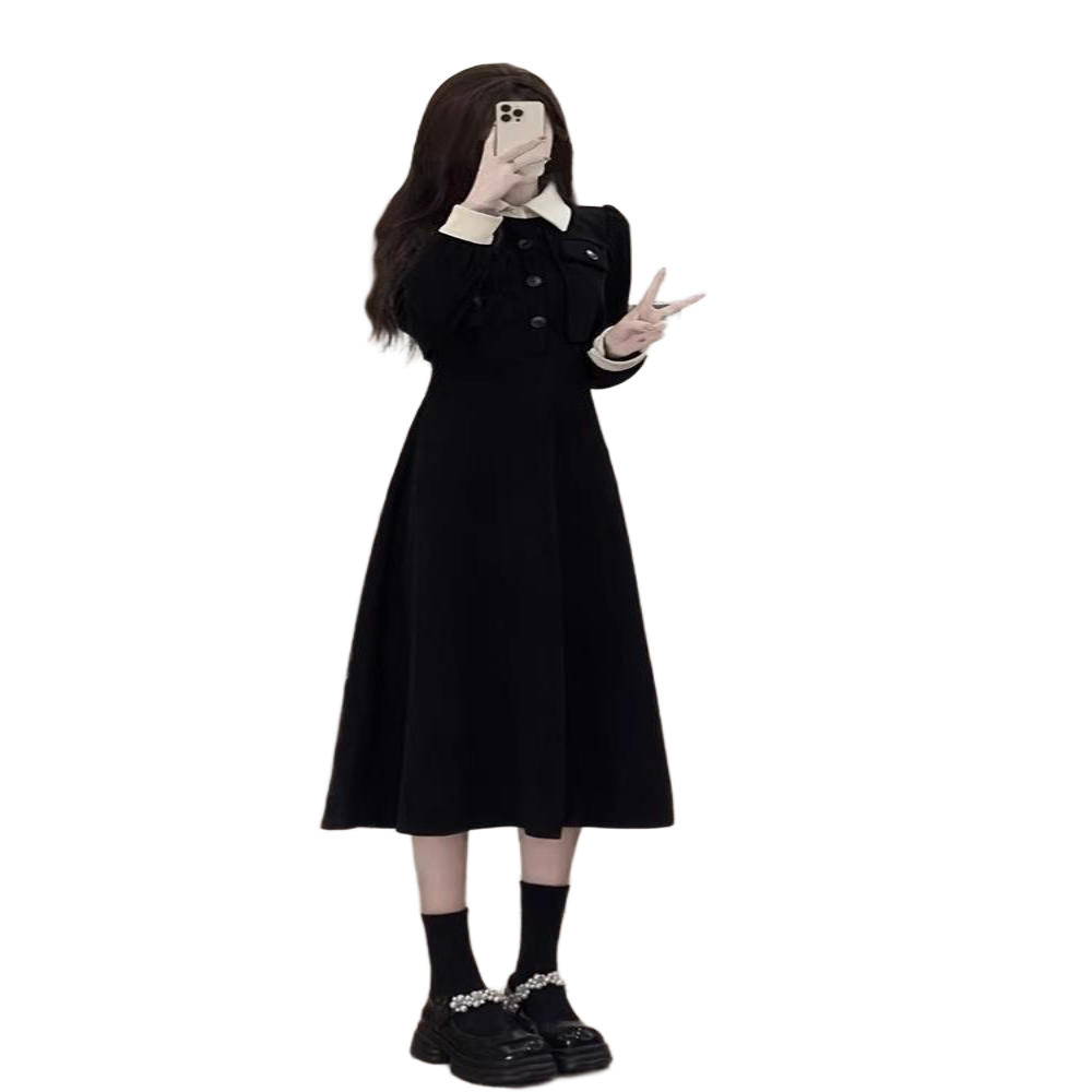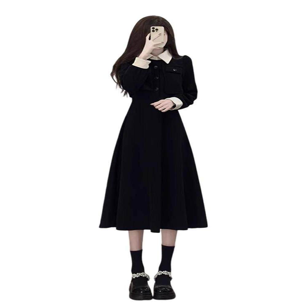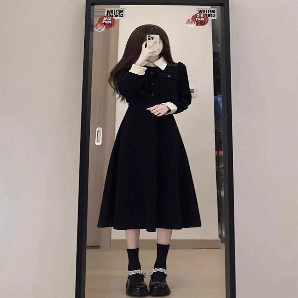 赫本黑色连衣裙子春秋季新款女深冬装搭配一整套内搭长裙套装