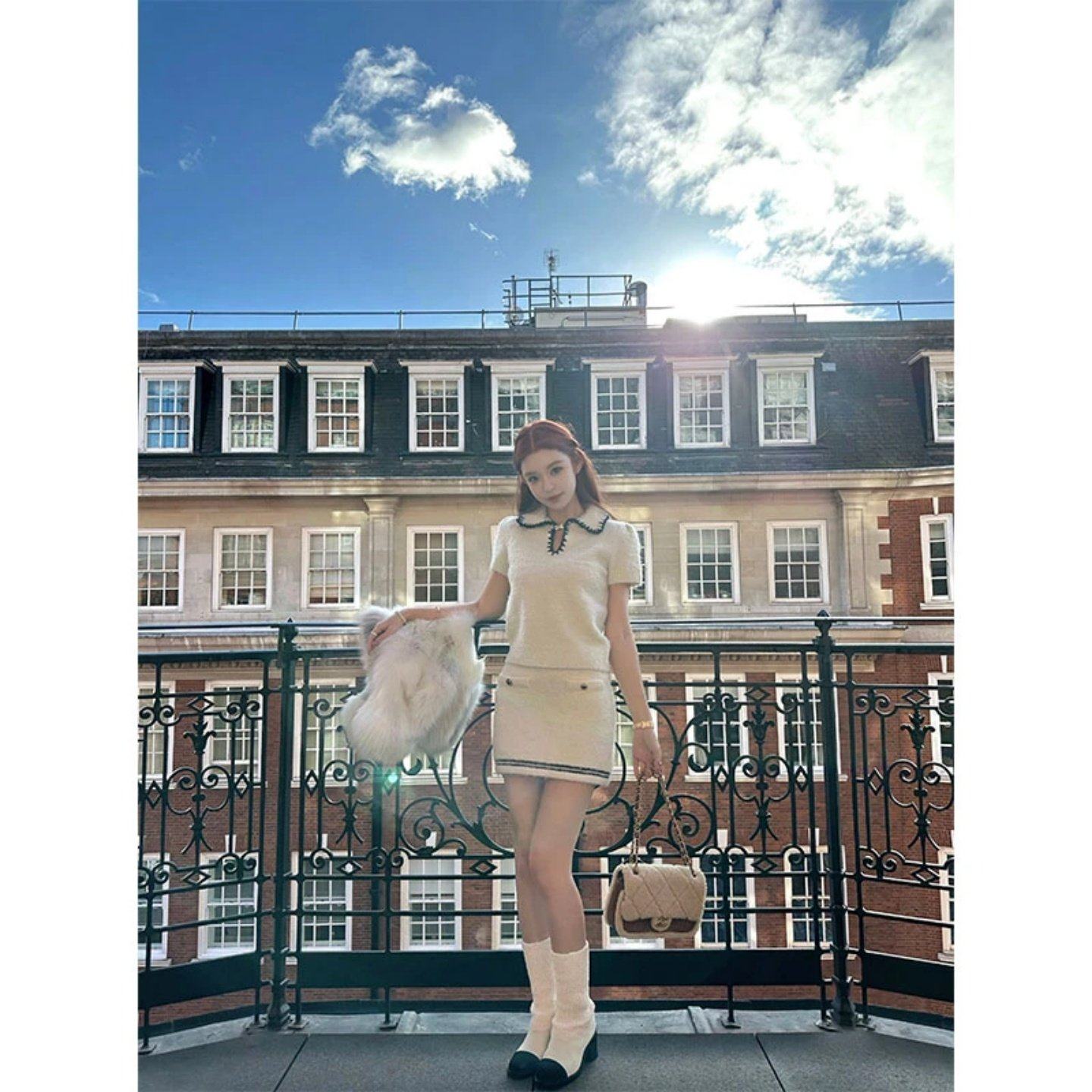 2026巨好看搭配一整套小香风撞色翻领气质短袖针织衫显瘦半身裙