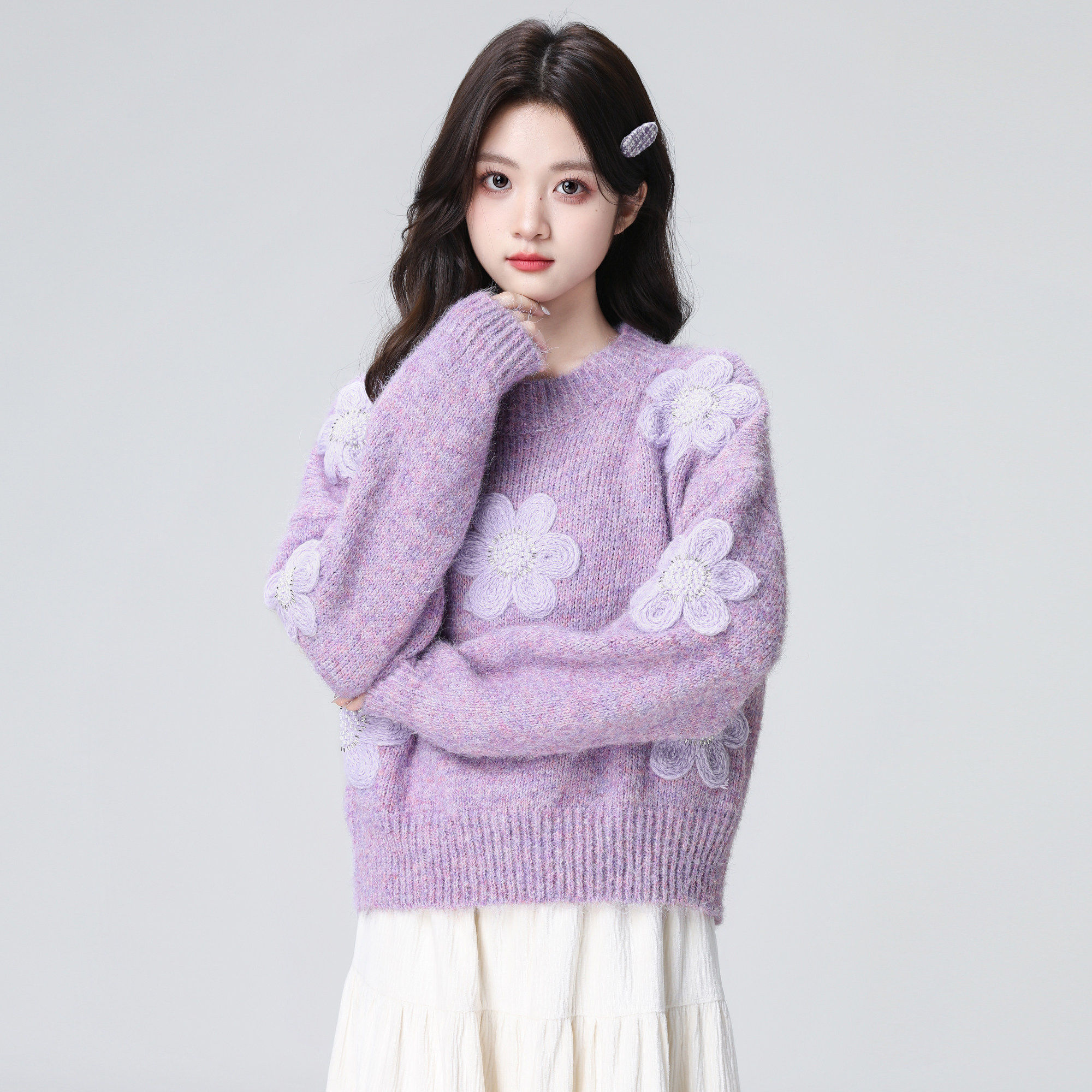紫色圆领毛衣女秋冬2025冬新款立体花朵小个子宽松慵懒针织衫上衣