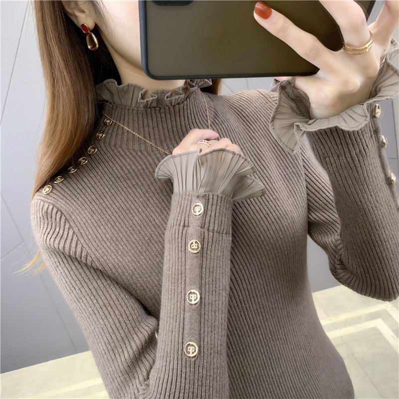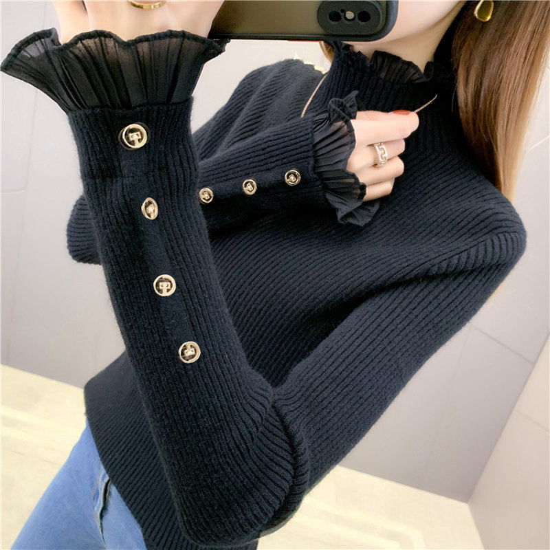 2025秋冬蕾丝针织半高领修身显瘦打底衫女装洋派内搭短款毛衣上衣