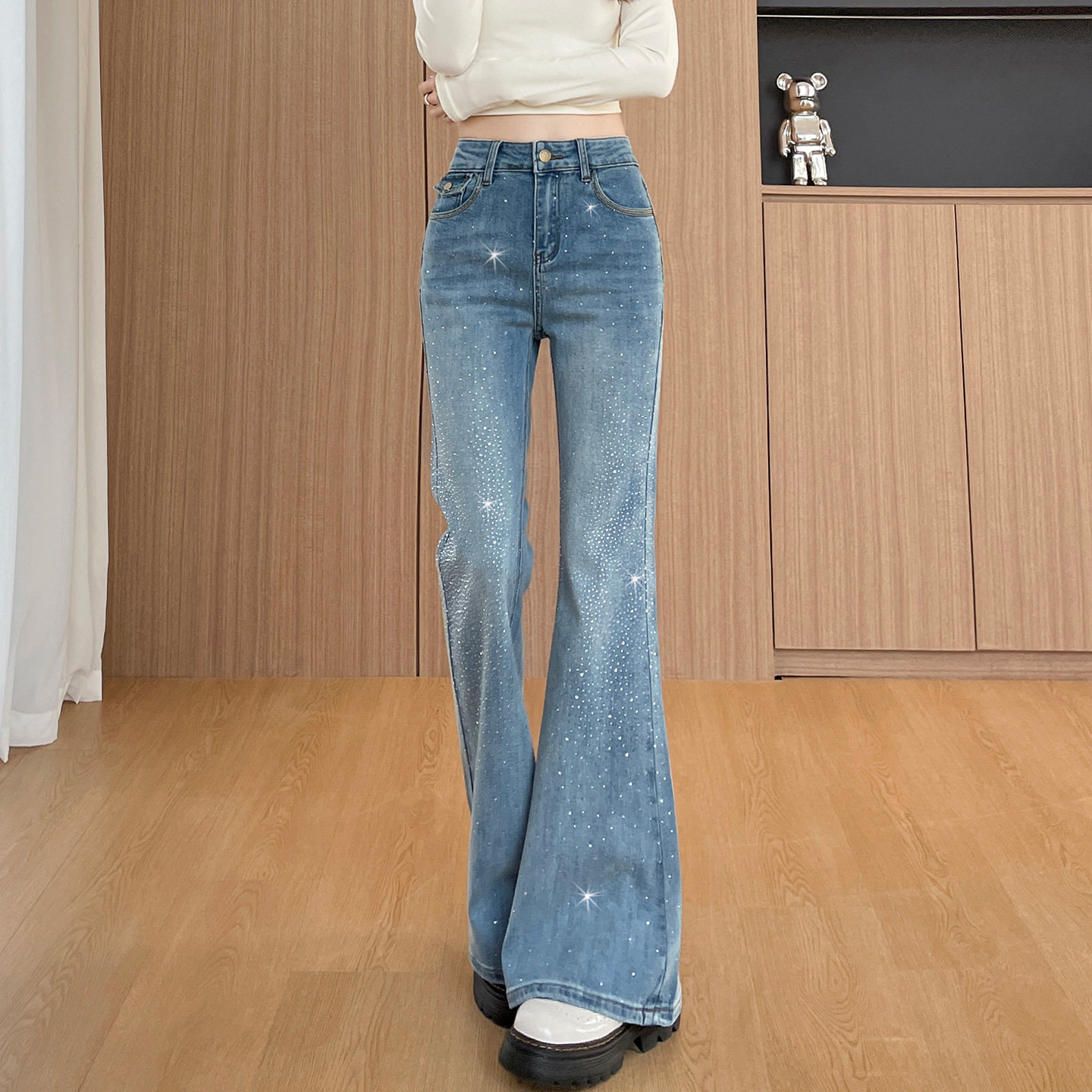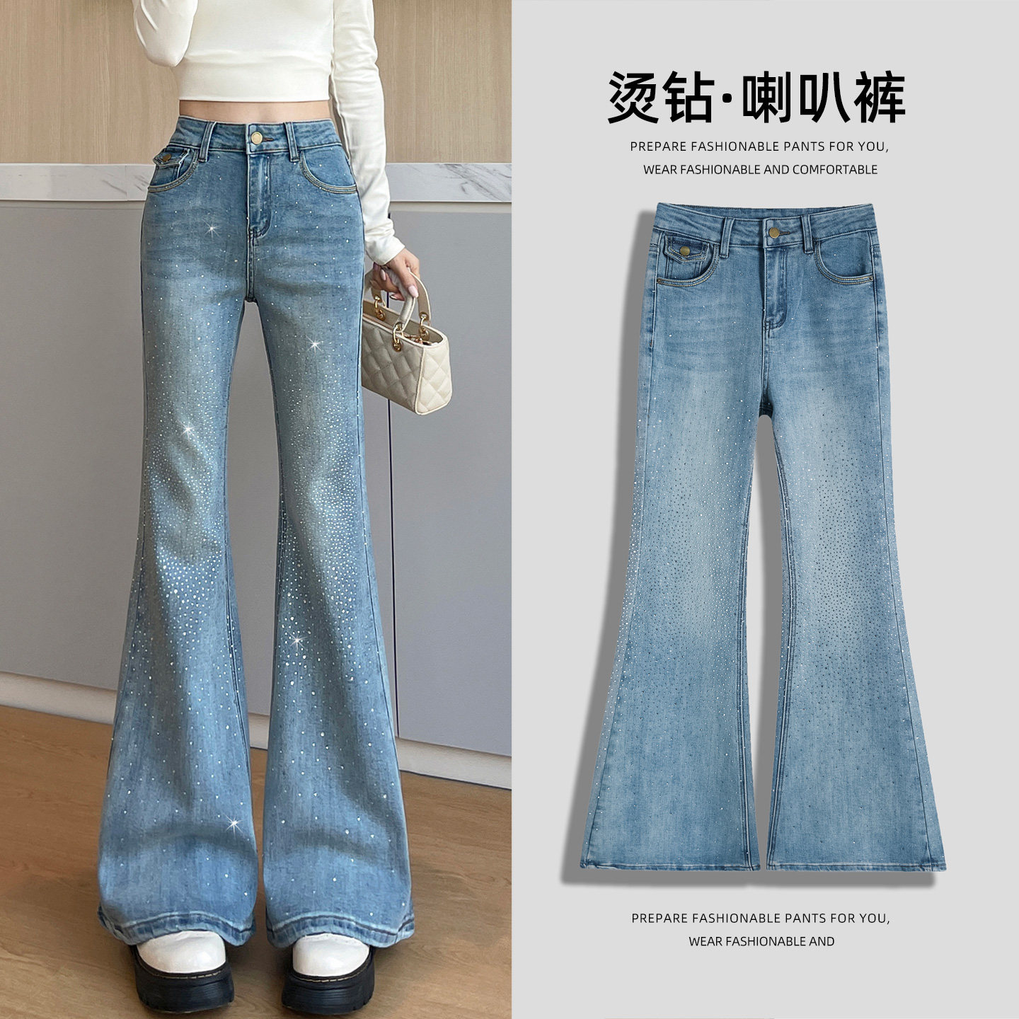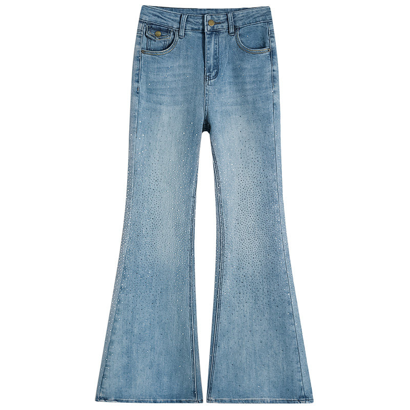 首页> 女装> 浅蓝色带钻修身微喇牛仔裤女春2026新款高腰弹力满钻爆闪喇叭裤子