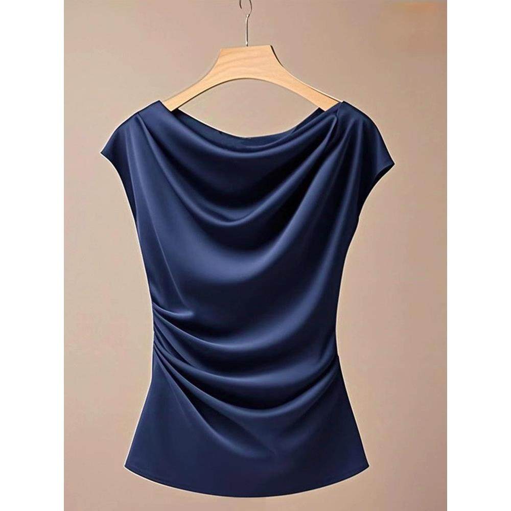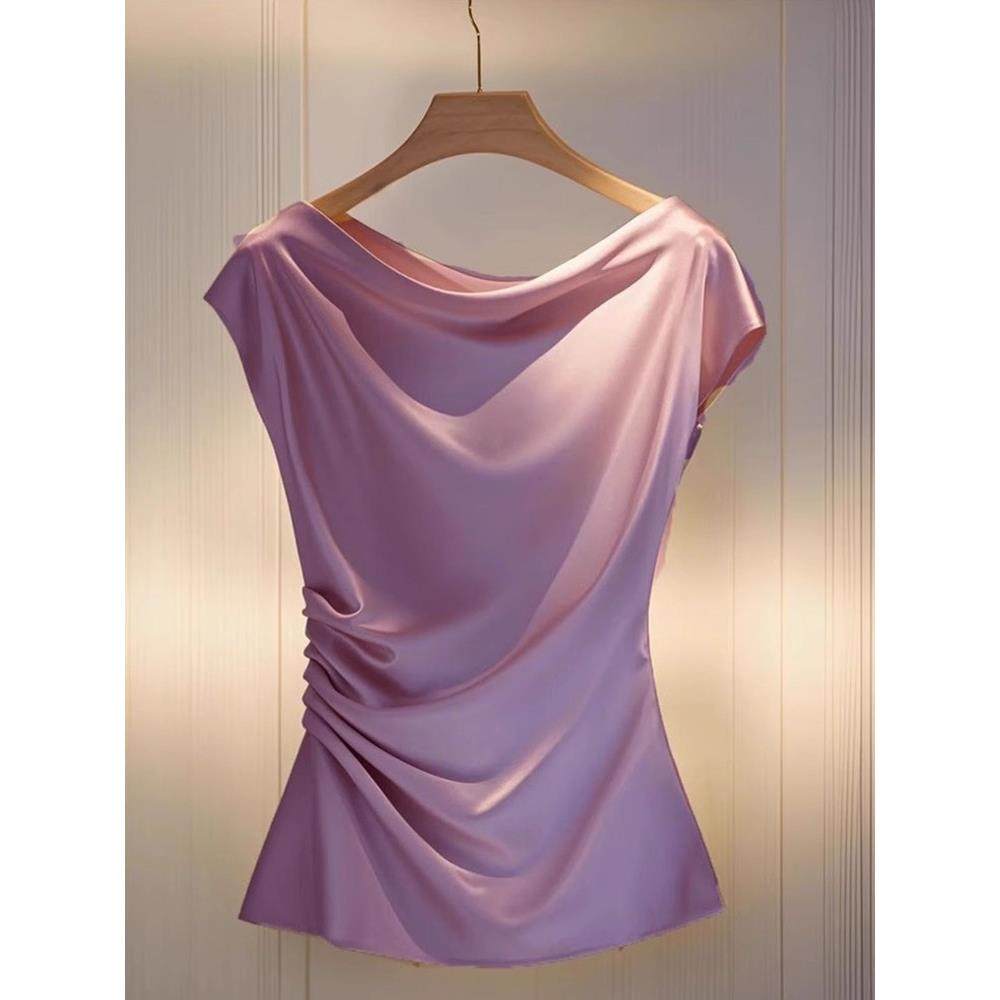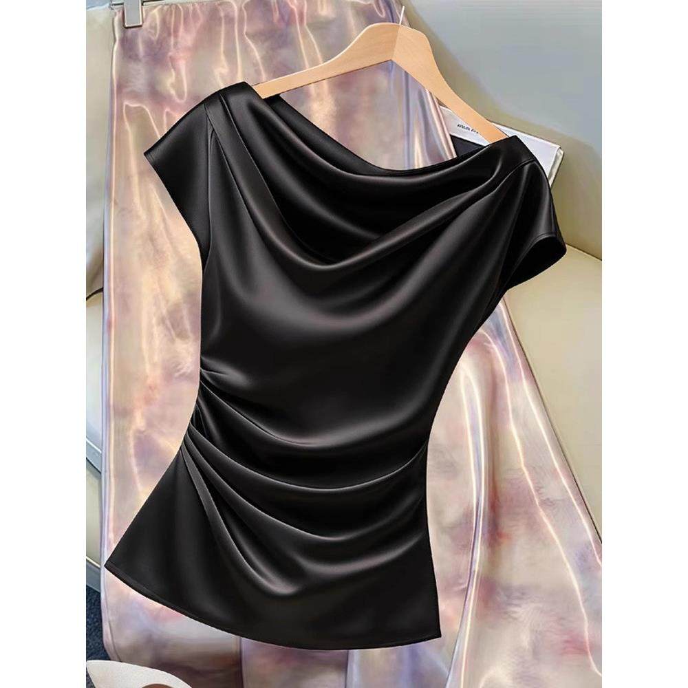 杏缎摆动领短袖女t恤2025新风格腰纤细看法国风格小香衬衫上衣