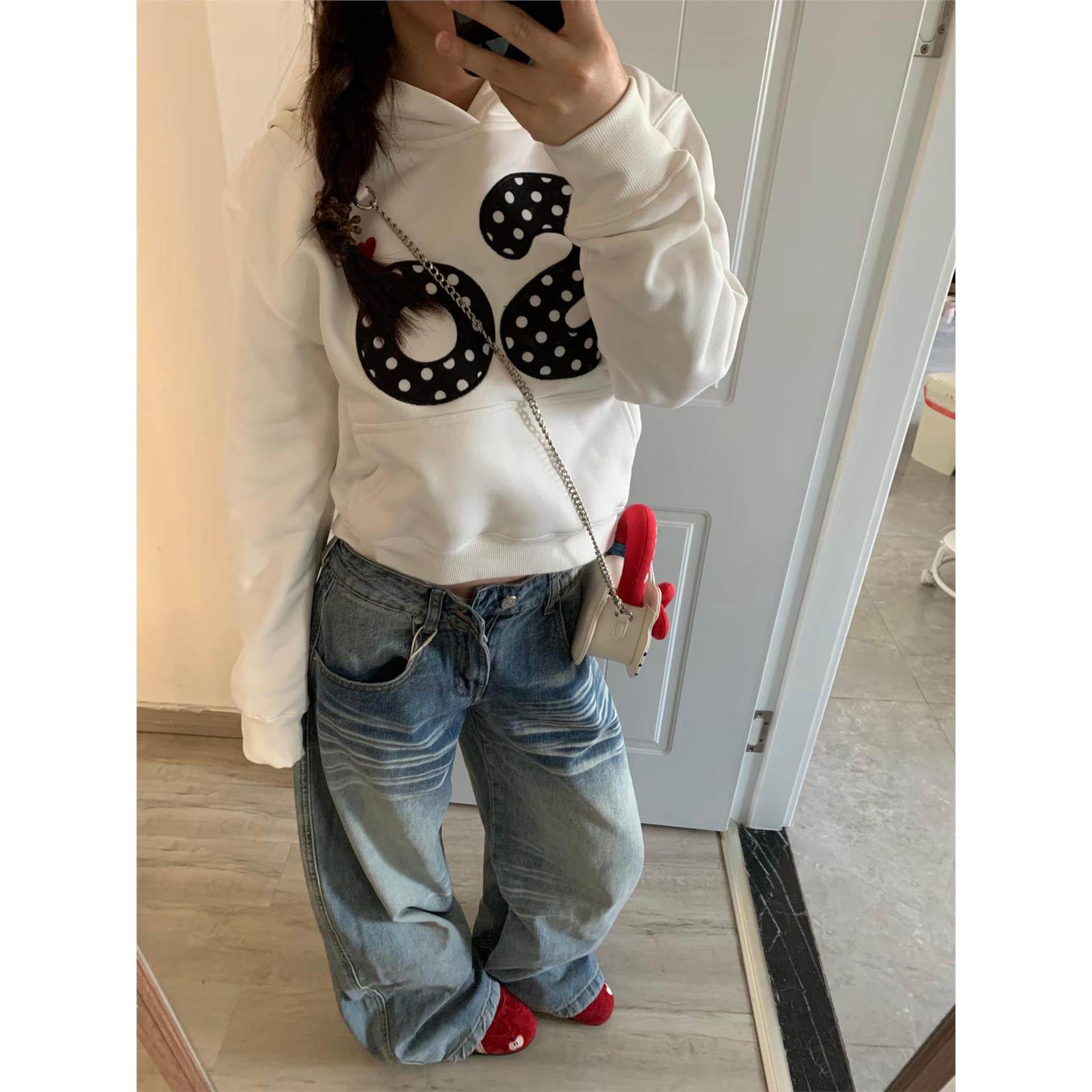 美式重磅连帽加绒短款卫衣女秋冬慵懒风波点字母刺绣贴布百搭上衣