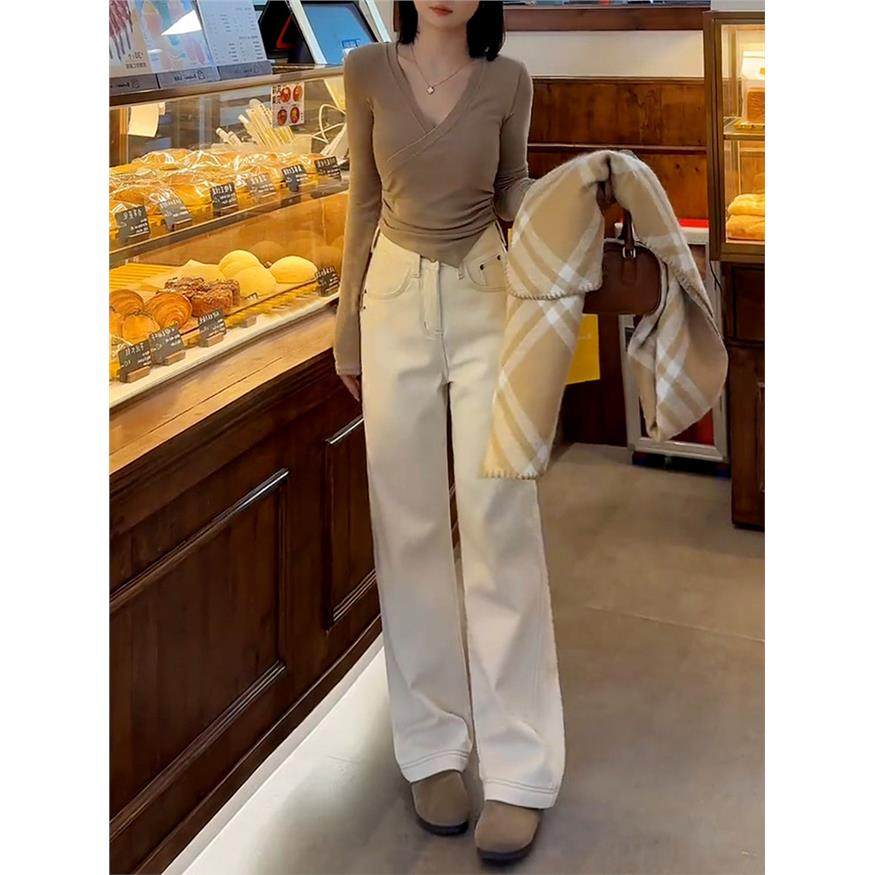 直筒牛仔裤女春秋2025年新款美式覆古米杏色高腰拖地宽松阔腿裤子