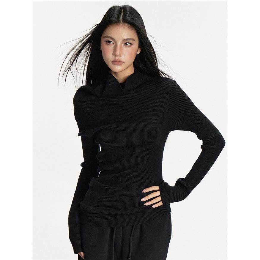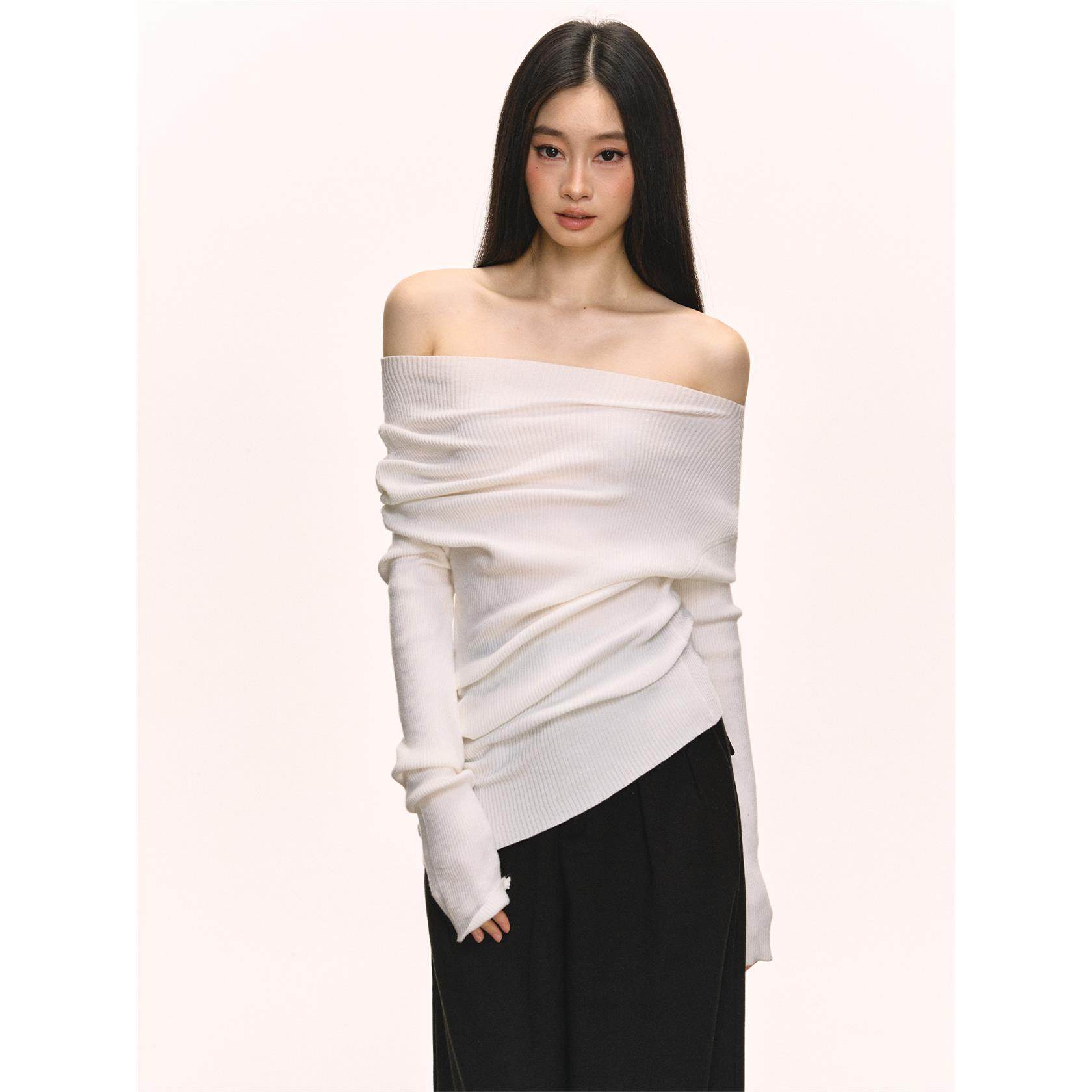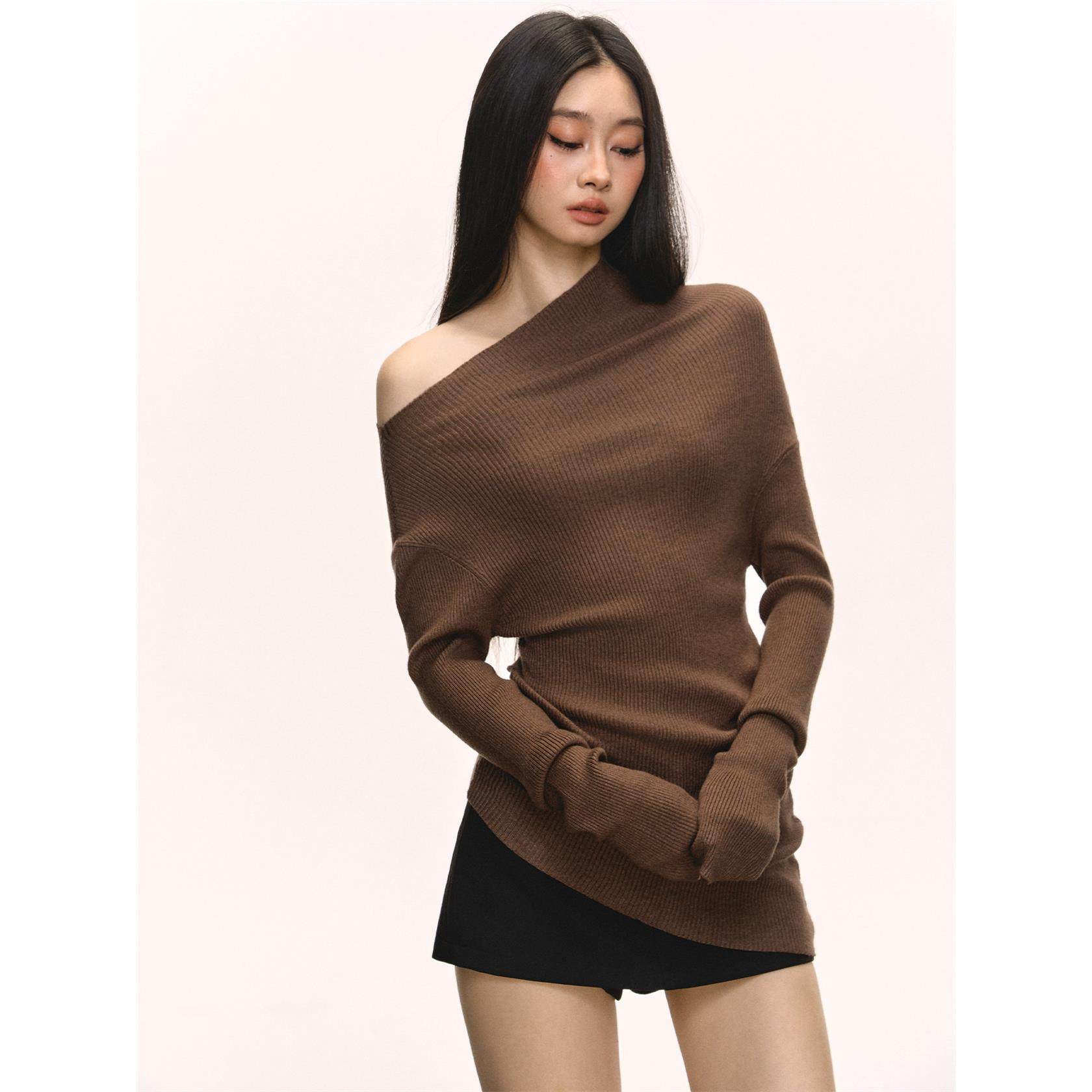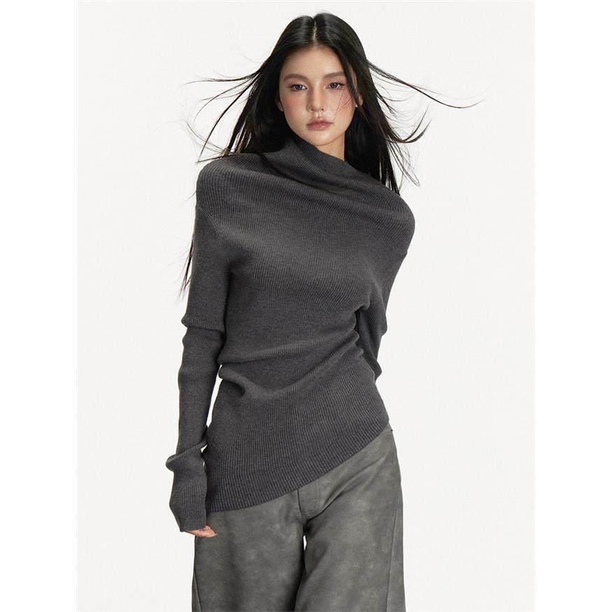 anna aneae红色针织衫女早秋设计感新年一字肩打底高领长袖毛衣潮