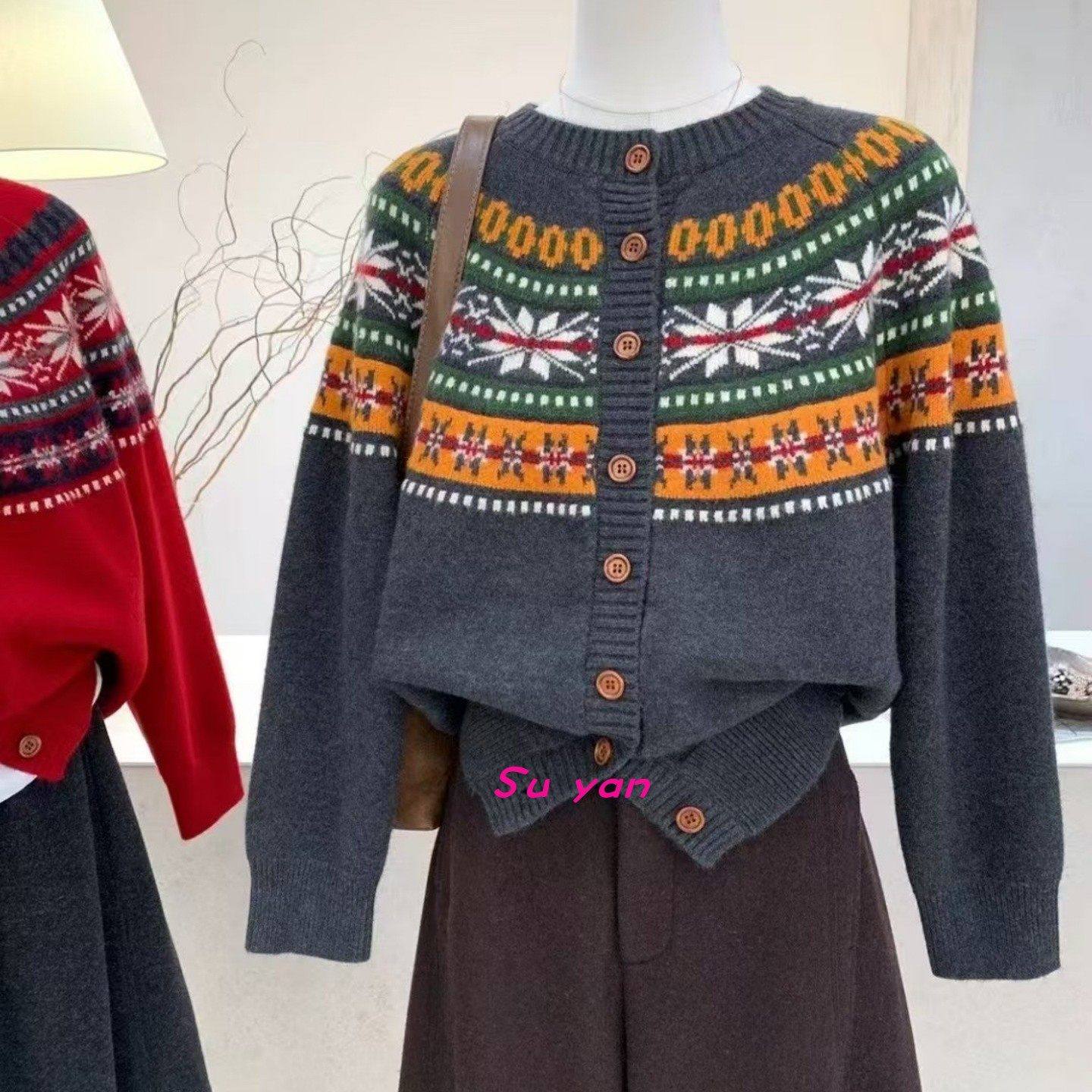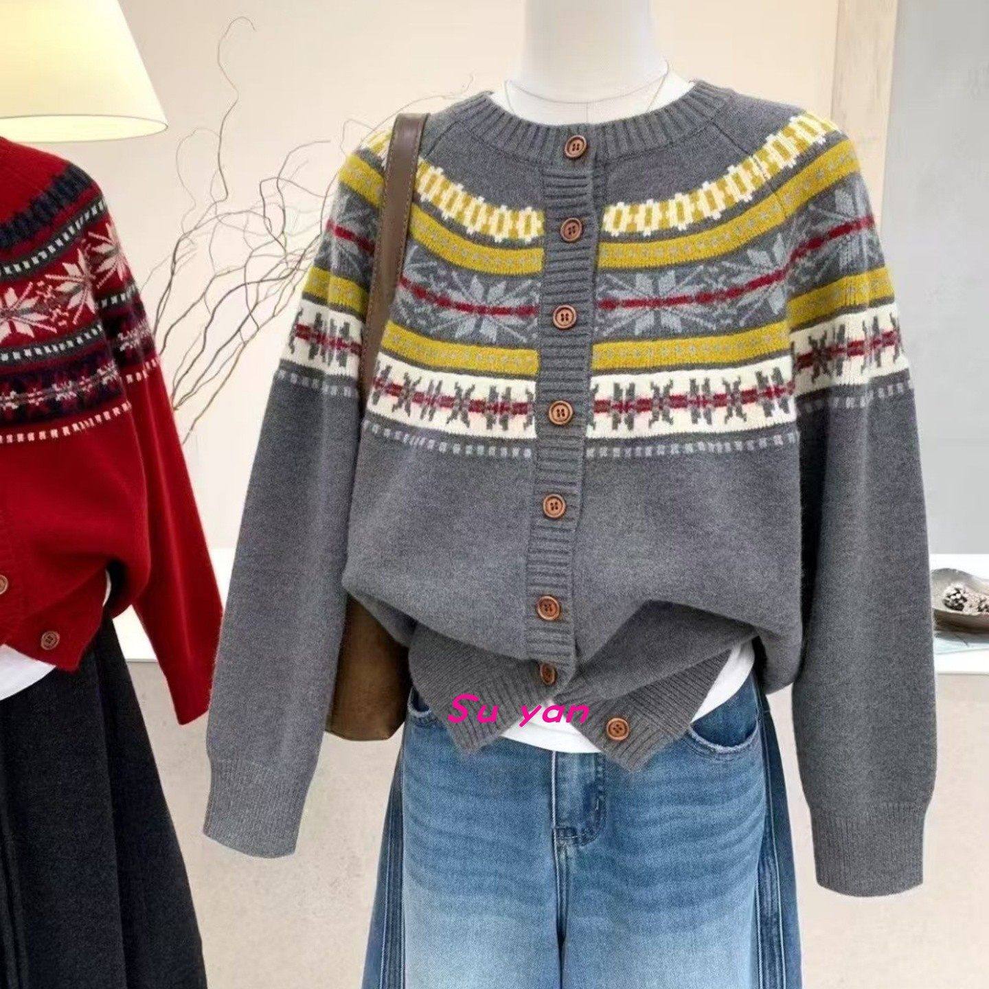 撞色雪花提花甜美减龄学院风针织开衫秋冬新款韩系复古休闲毛衣女