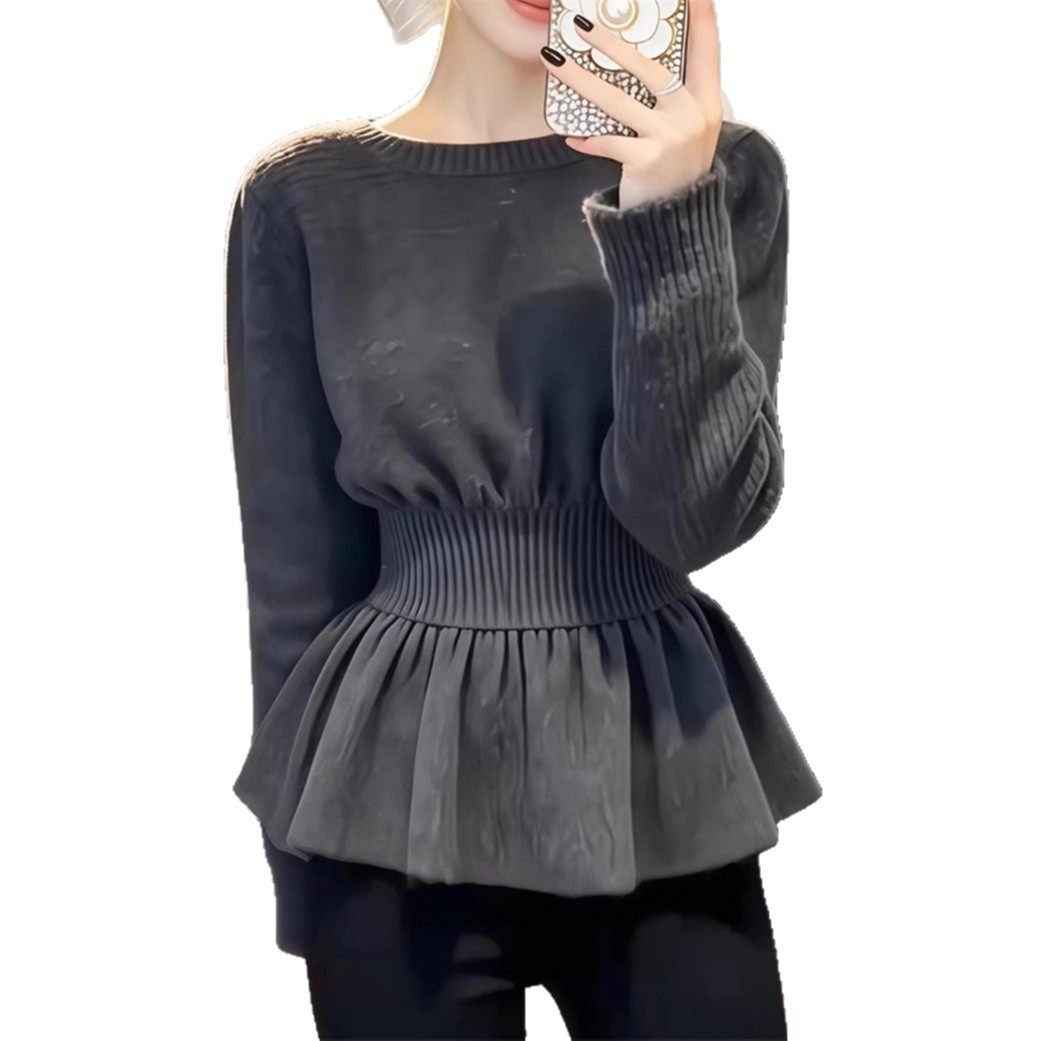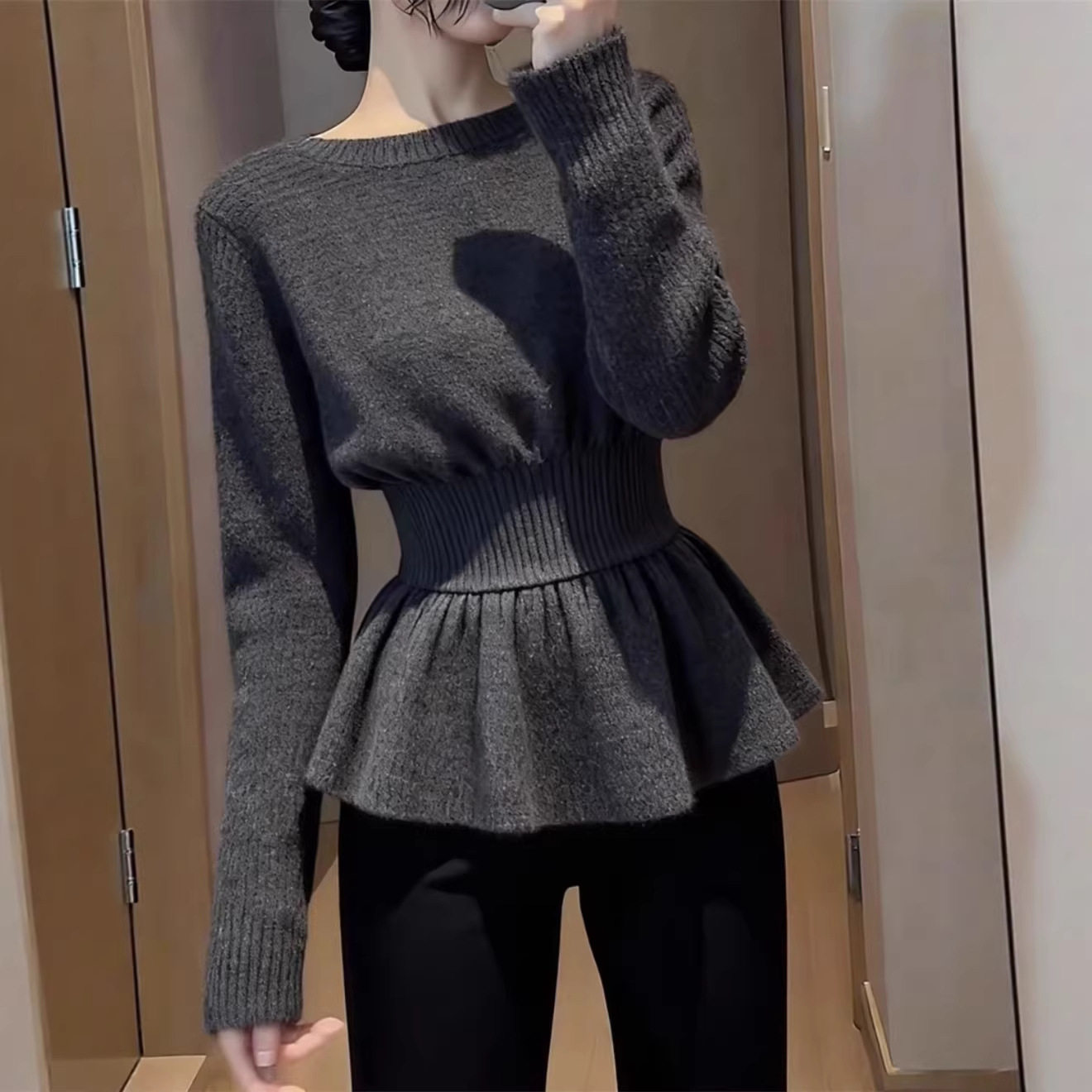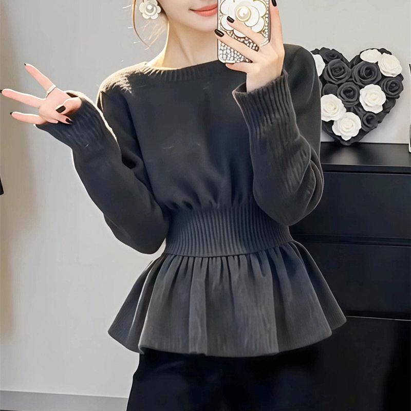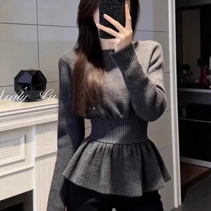 韩系深灰色长袖针织衫女秋冬内搭胖mm收腰显瘦荷叶边毛衣春季上衣