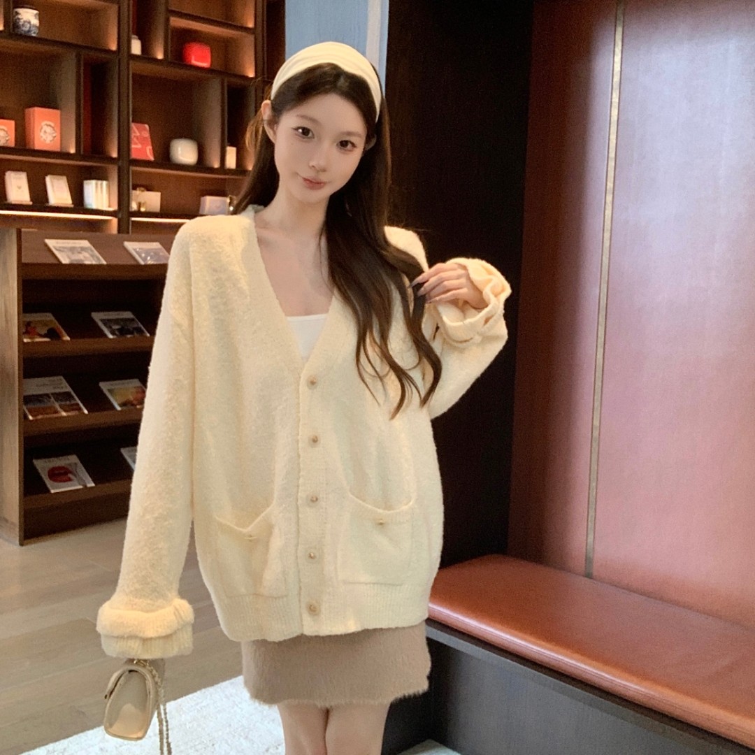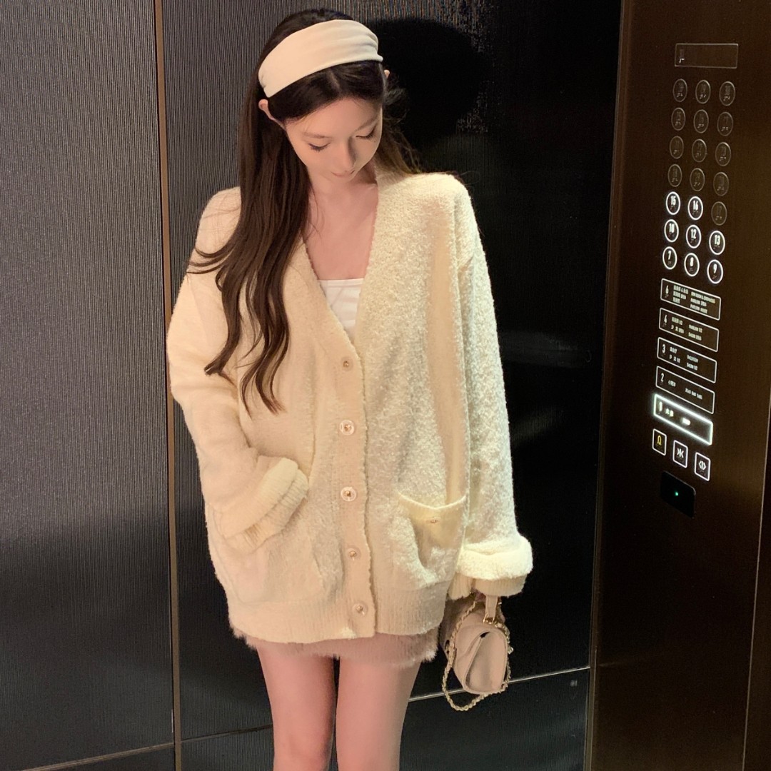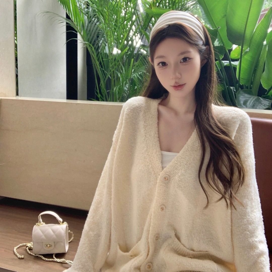 实拍实价 法式小香风V领针织开衫女秋冬宽松显瘦慵懒气质长袖毛衣