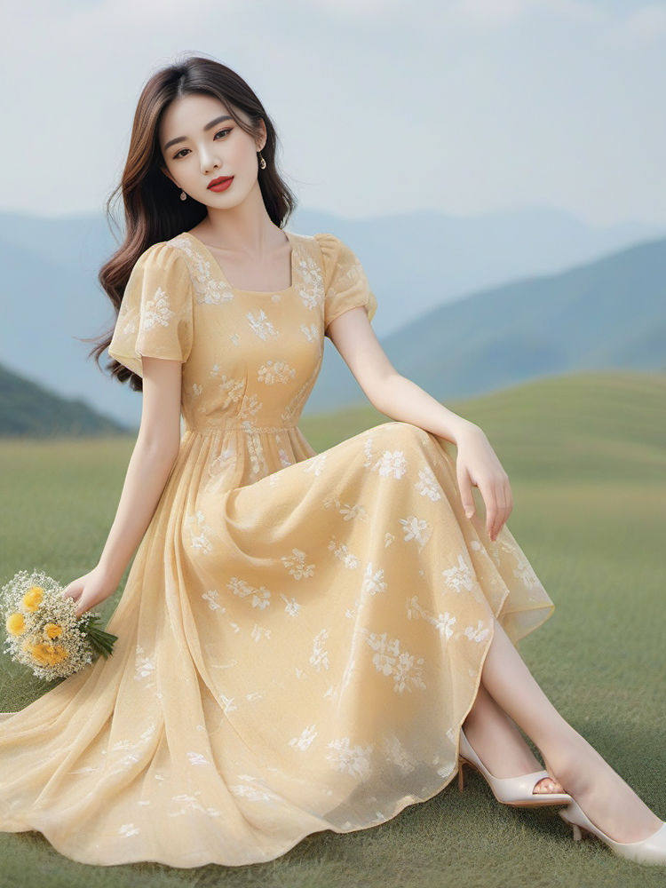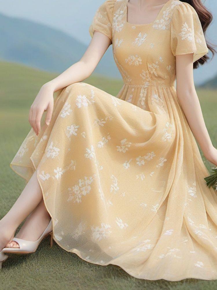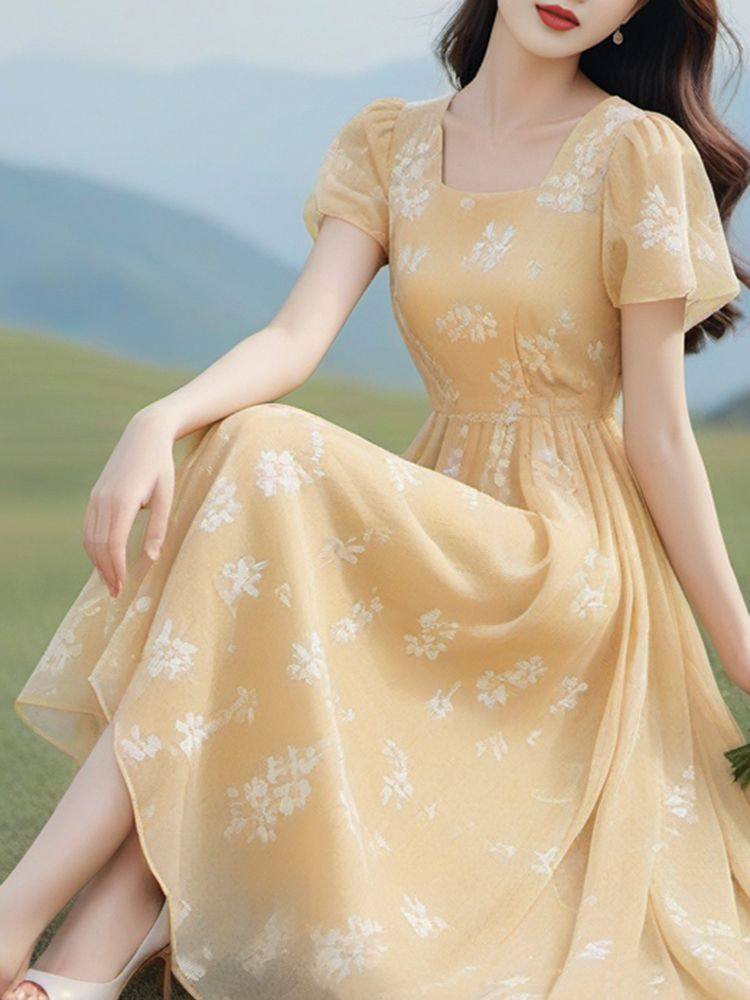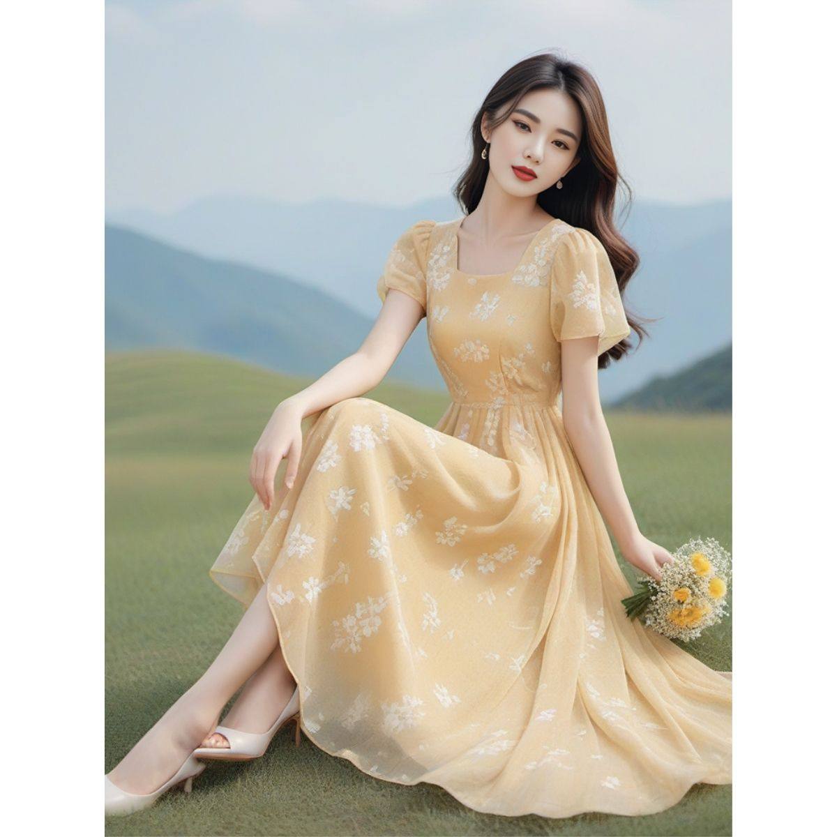 2025夏季新款女装黄色碎花连衣裙女短袖宽松显瘦气质优雅中长裙