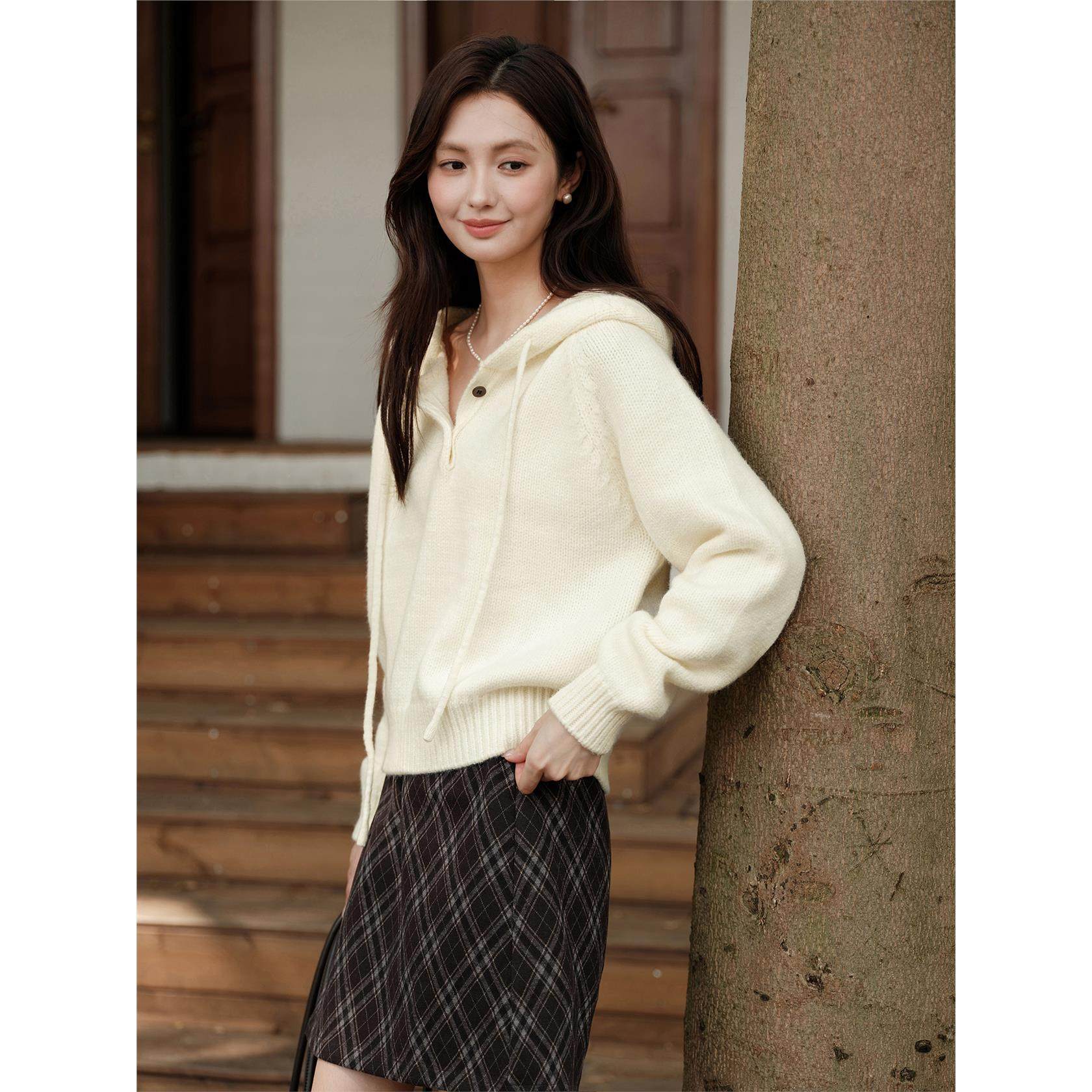 木易易软糯风抽绳连帽针织衫女2025新款冬季韩系加厚毛衣长袖上衣